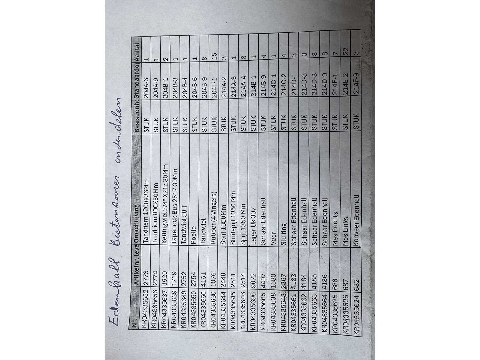 Kist met onderdelen voor Edenhall bietenrooier ongebruikt, afkomstig van overtollige dealer voorraad Inhoud van kist staat beschreven op een lijst (tussen de foto's) Merk: Edenhall