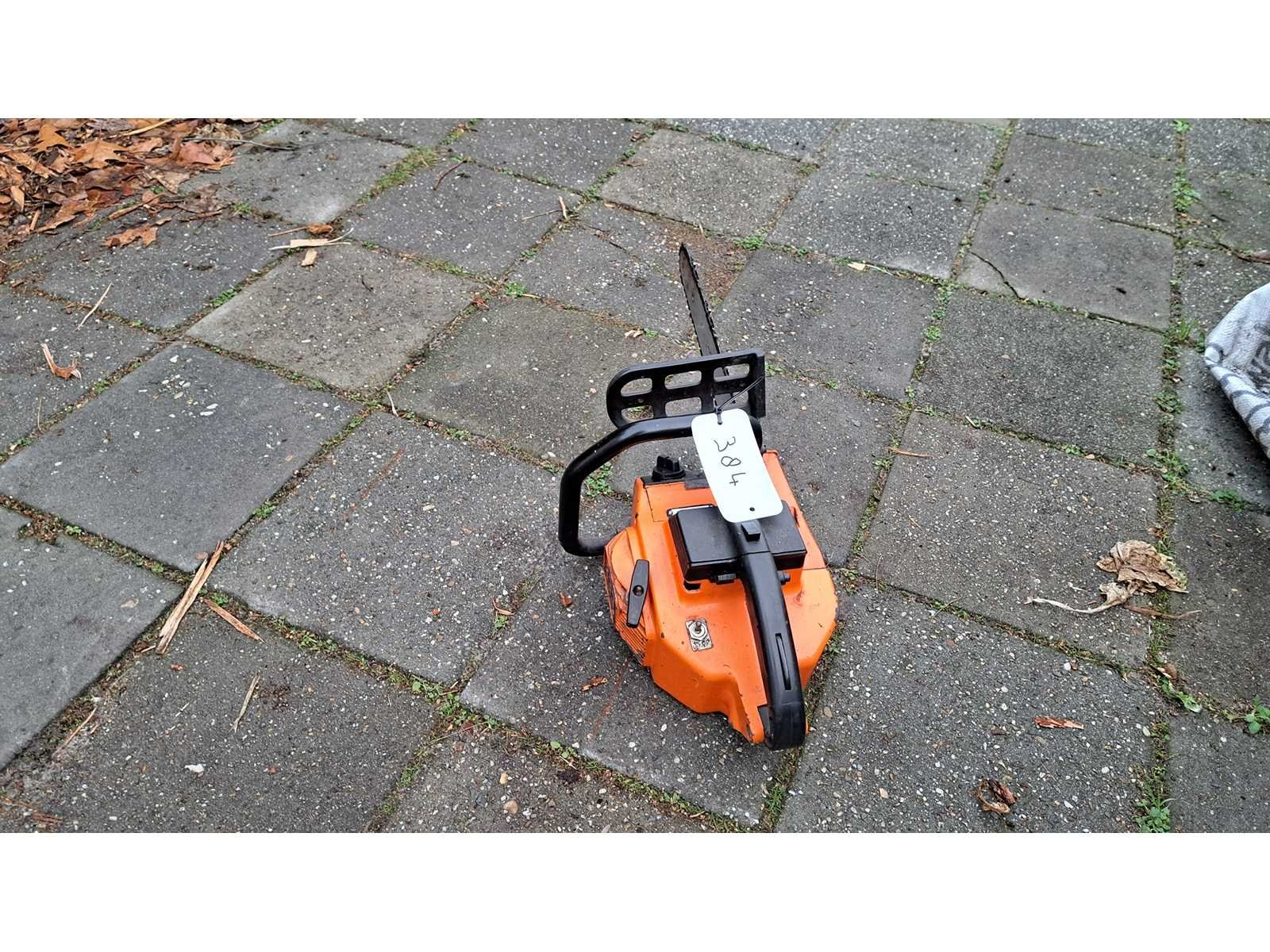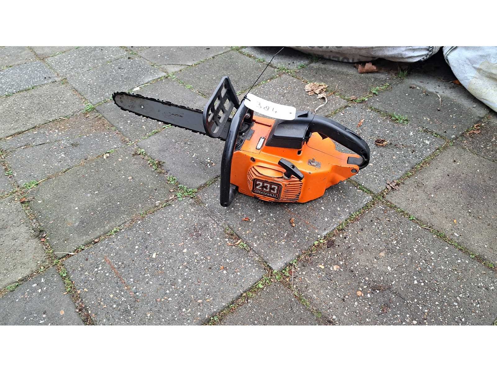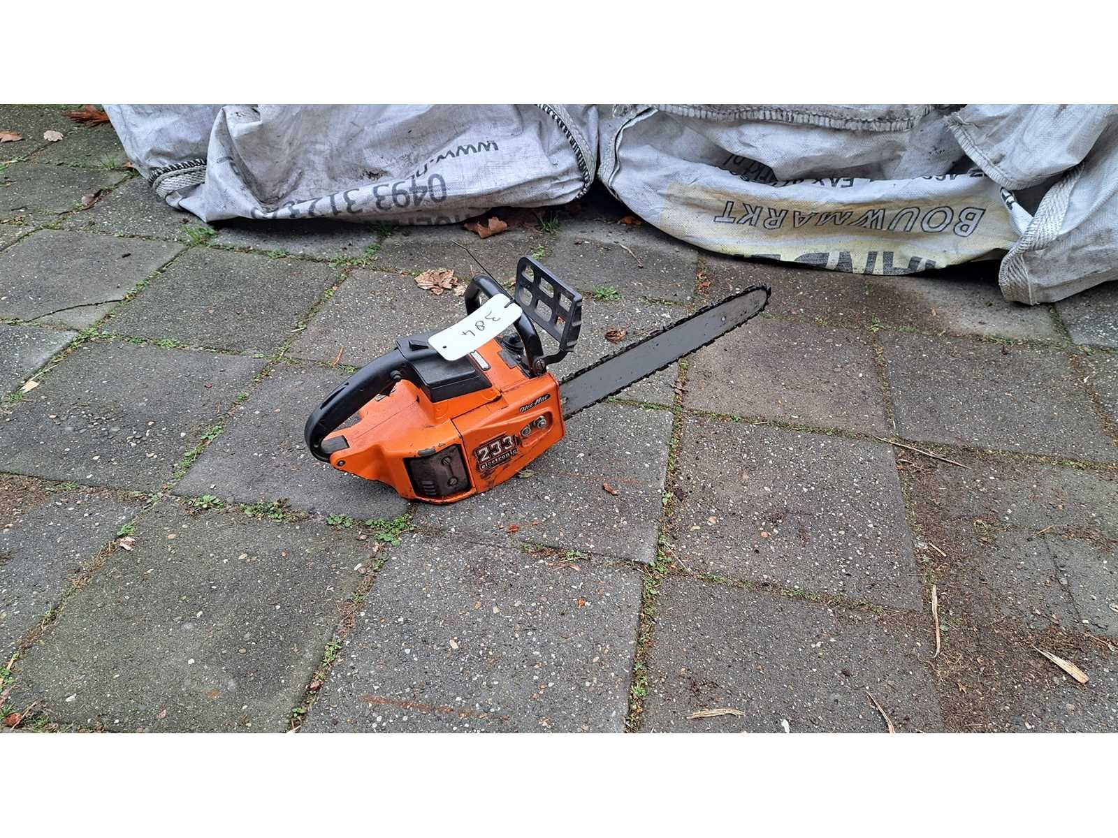 Kleine oldtimer/vintage tophendel zaag, start wel maar loopt niet door Merk: Oleo Mac Type: 233 Zaagblad afm. l: 350mm Brandstof: benzine