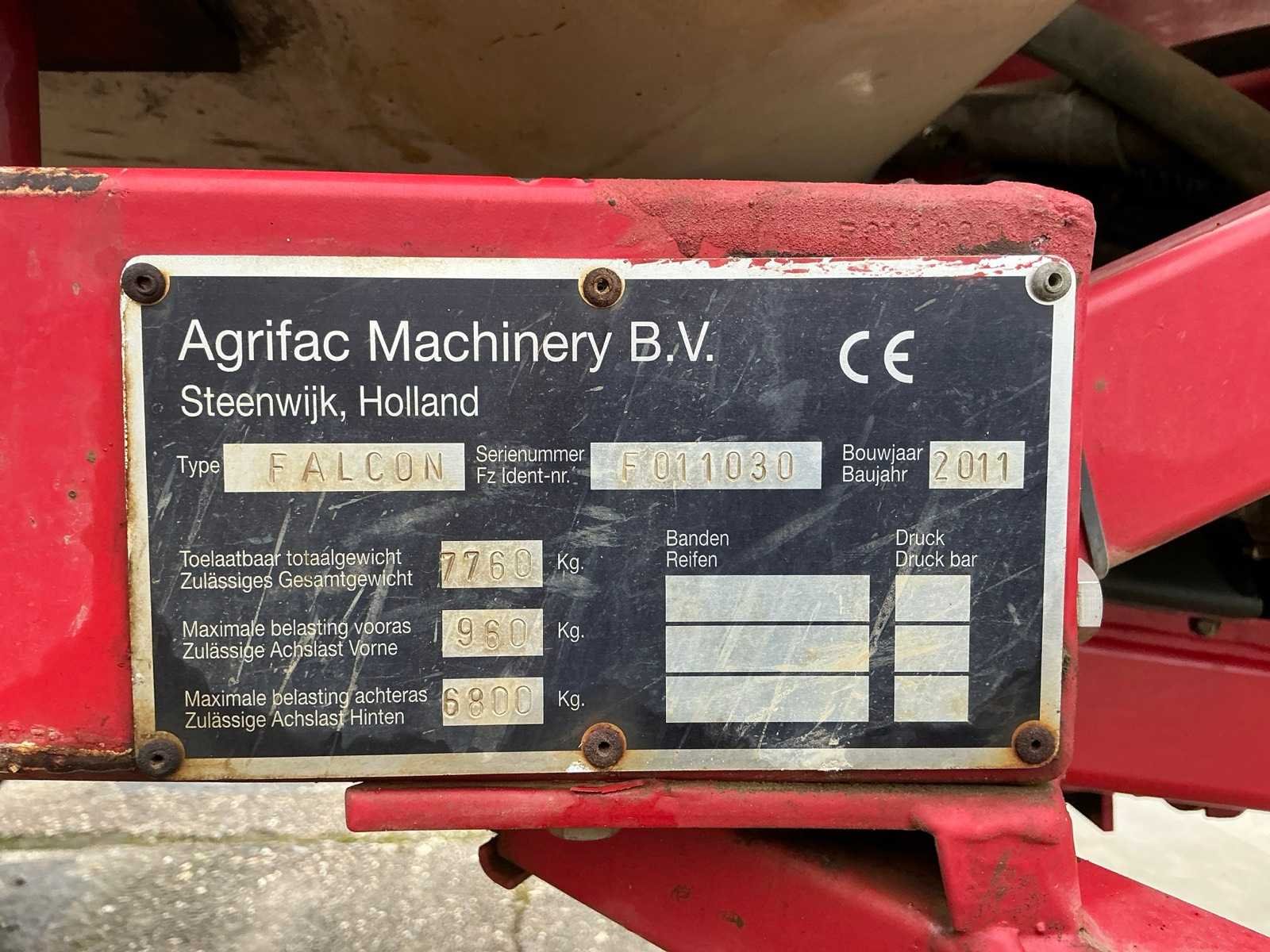 Spoorbreedte verstelbaar, momenteel op 2100 spoor. 450 liter schoonwatertank, inclusief GPS besturing, dopafstand 50cm, inclusief set brede banden 520/70R38 (175x175x125 transport afmetingen losse pallet) Merk: Agrifac Type: Falcon Bouwjaar: 2011 Serienummer: F011030 Kenteken: LBB-73-F Capaciteit.: 220l/min Spuitboombreedte: 33m Tankinhoud: 3900l Bandenmaat: 16.9 R39 Voorzien van verlichting: true Boordcomputer: true Schoonwatertank: true Sectie afsluiting: true Totale afmeting L: 7250mm Totale afmeting Breedte: 3000mm Totale afmeting Hoogte: 3300mm
