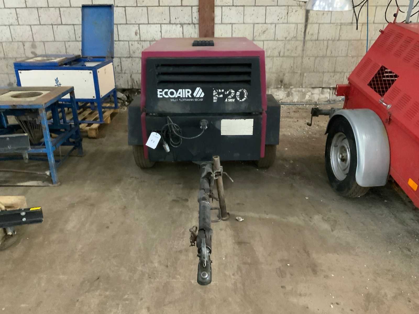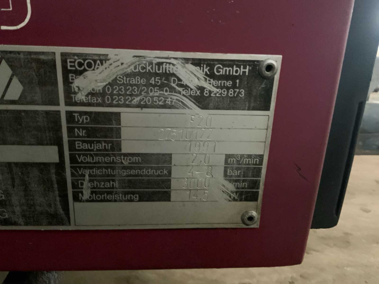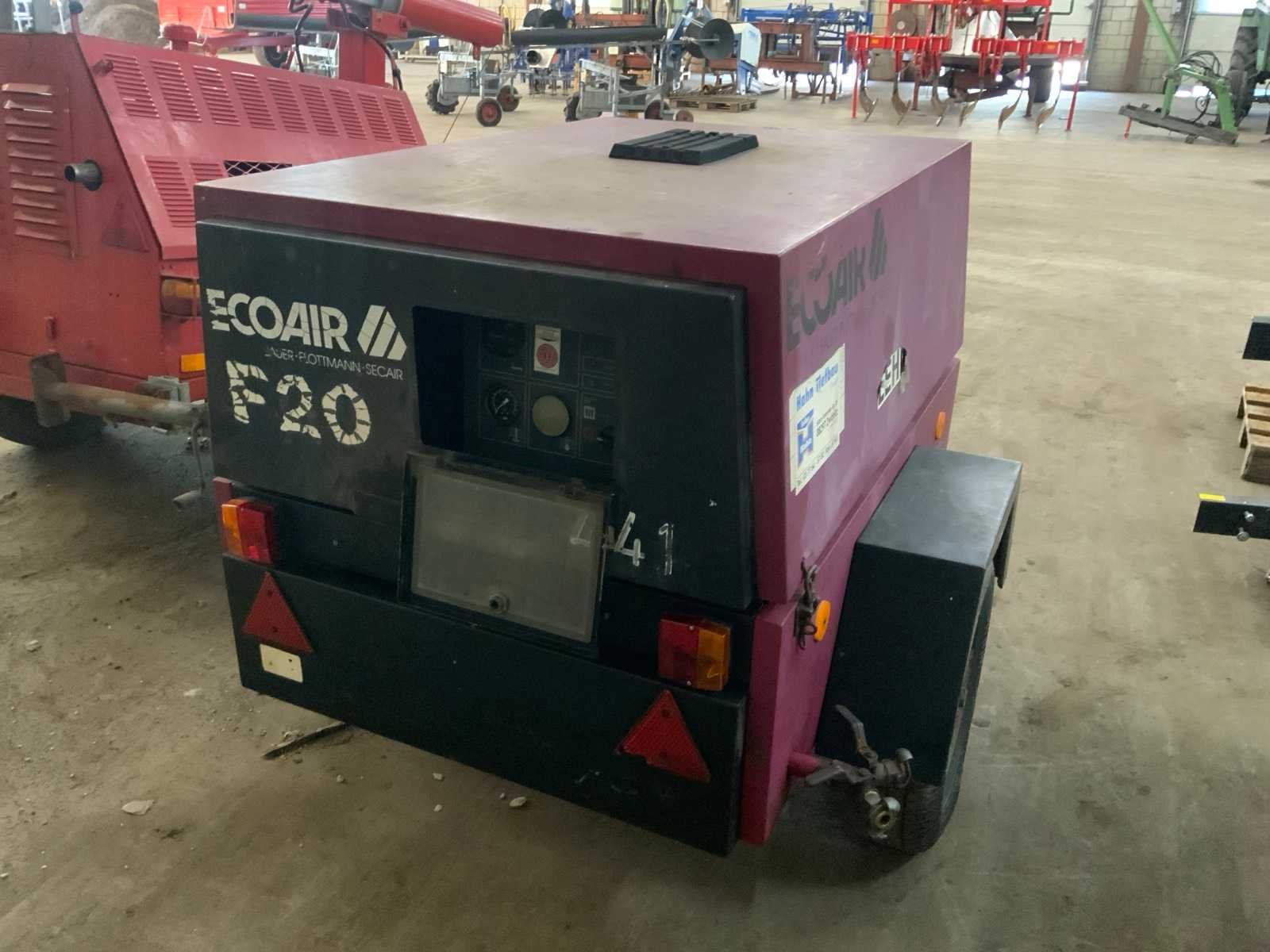 Voorzien van 2 cilinder dieselmotor Merk: Ecoair Type: F20 Bouwjaar: 1991 Serienummer: 27510122 Mobiel: true Capaciteit.: 8bar Vermogen: 14.5kW Afgelezen urenstand: 574hr Eigen gewicht: 650kg