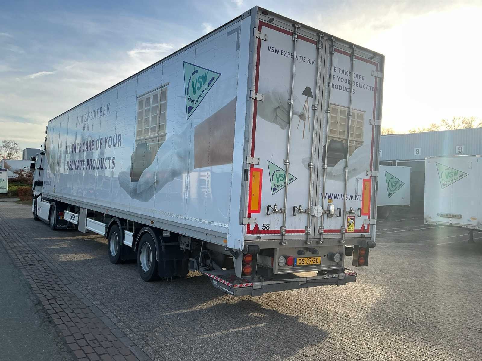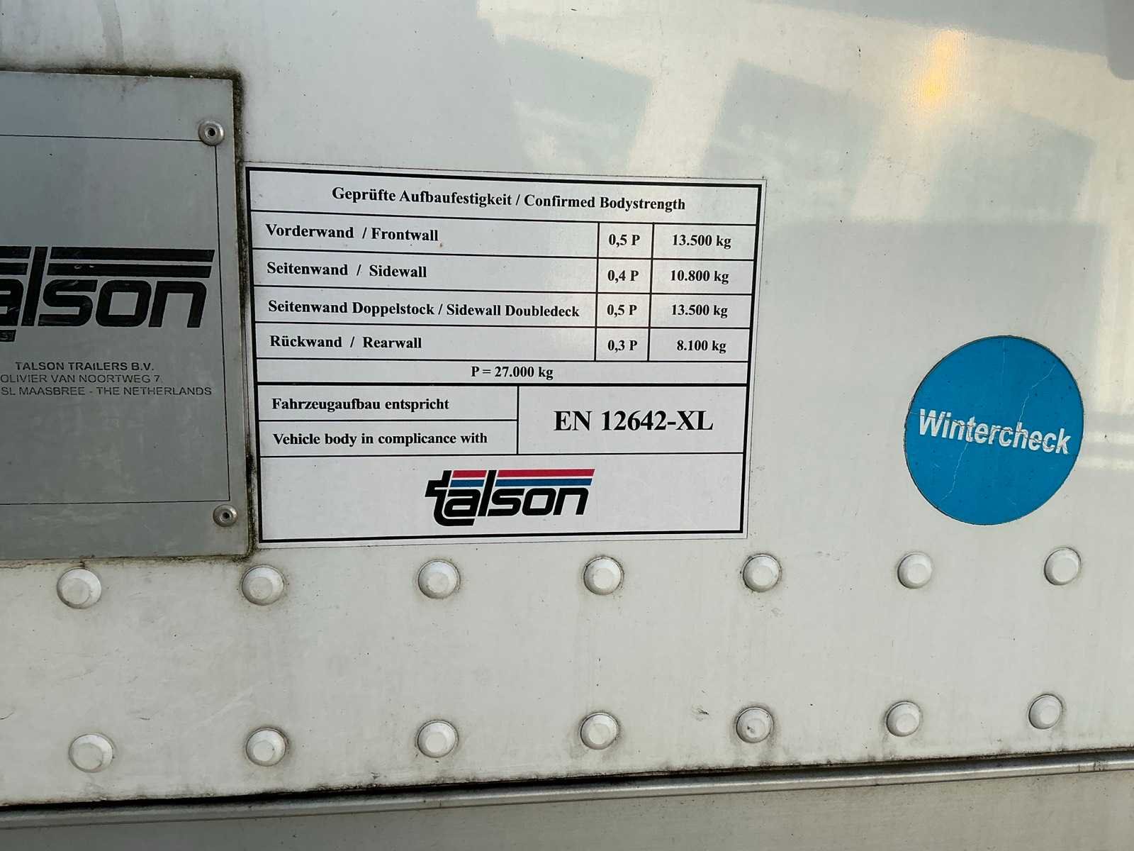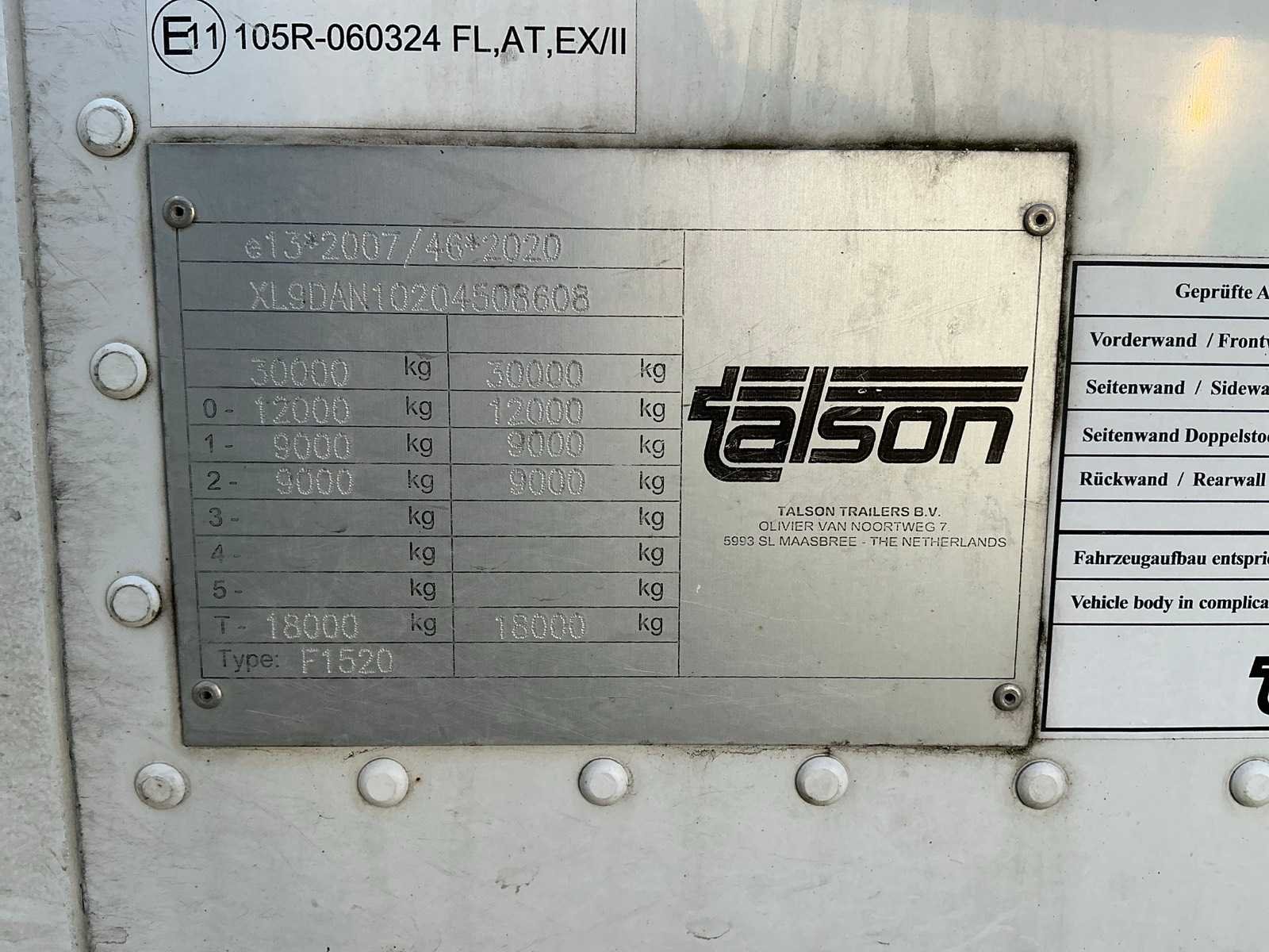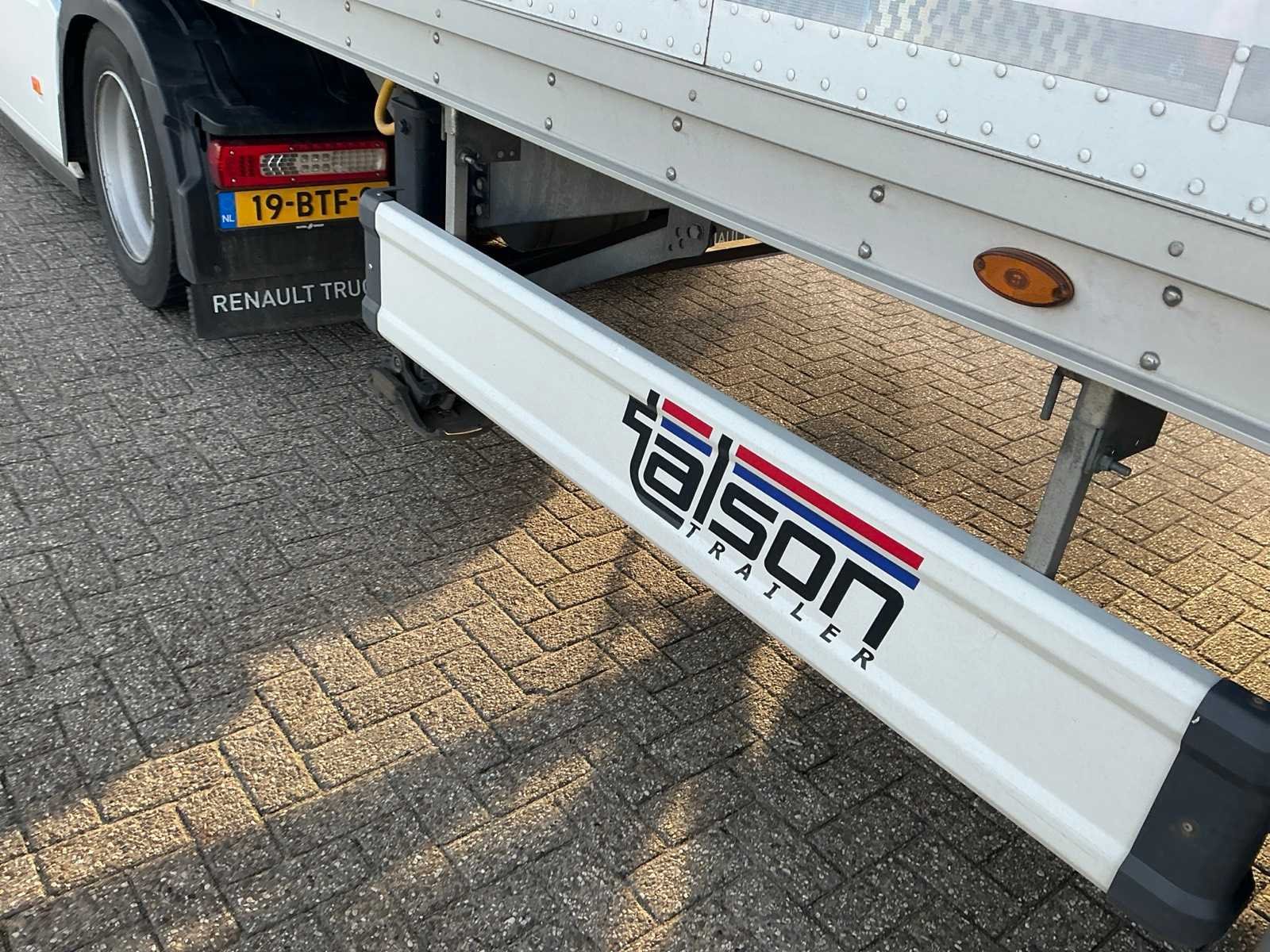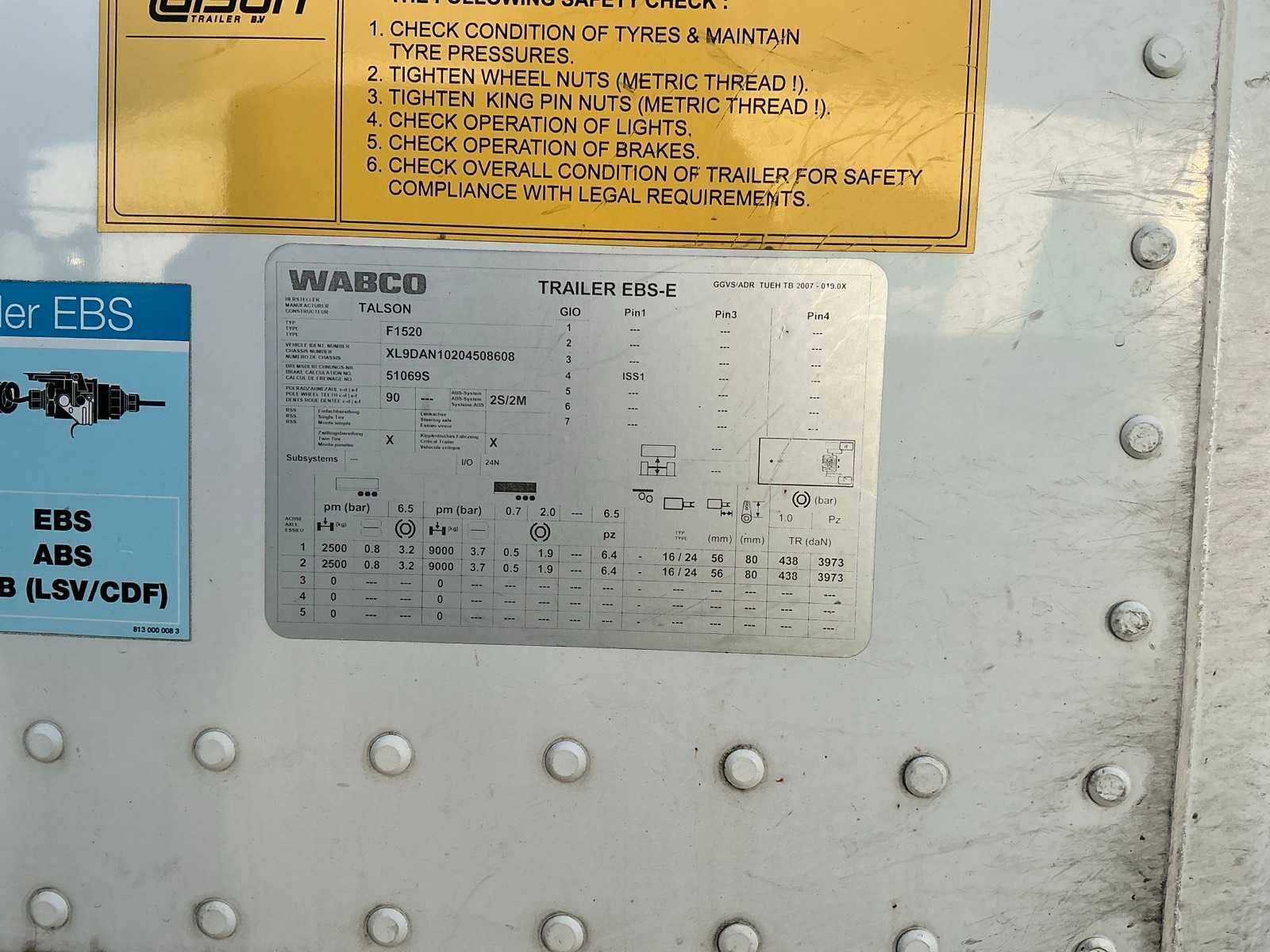 Max massa 30000kg, afstand hart koppeling tot achterzijde voertuig 1200cm , lengte totaal 1386cm, breedte 255cm Voorzien van Dhollandia laadklep, talfix, luchtgeveerde BPW assen waarvan 1 x gedwongen gestuurd, bandenmaat 265/70R19.5 Merk: Talson Type: Distri F1520 Bouwjaar: 2022 Chassisnummer VIN: XL9DAN10204508608 Kenteken: OS-37-ZG Datum eerste toelating (NL): 2022-01-04 Datum eerste toelating: 2022-01-04 APK vervaldatum: 2026-01-04 Aantal assen: 2 Laadvermogen: 22000kg Hydraulische laadklep: true Eigen gewicht: 8000kg Zelf rijdend exporteren: Niet mogelijk No self drive export!: true