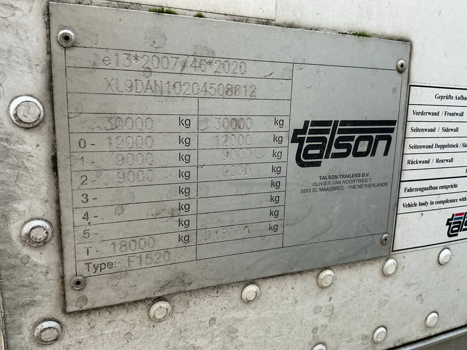 Max massa 30000kg, afstand hart koppeling tot achterzijde voertuig 1200cm , lengte totaal 1386cm, breedte 255cm Voorzien van Dhollandia ondervouw laadklep, Talfix, luchtgeveerde BPW assen, as 2 gestuurd, bandenmaat 265/70R19.5 Merk: Talson Type: Distri F1520 Bouwjaar: 2021 Chassisnummer VIN: XL9DAN10204508612 Kenteken: OS-40-ZG Datum eerste toelating (NL): 2021-11-08 Datum eerste toelating: 2021-11-08 APK vervaldatum: 2025-11-08 Aantal assen: 2 Laadvermogen: 22000kg Hydraulische laadklep: true Eigen gewicht: 8000kg Zelf rijdend exporteren: Niet mogelijk No self drive export!: true