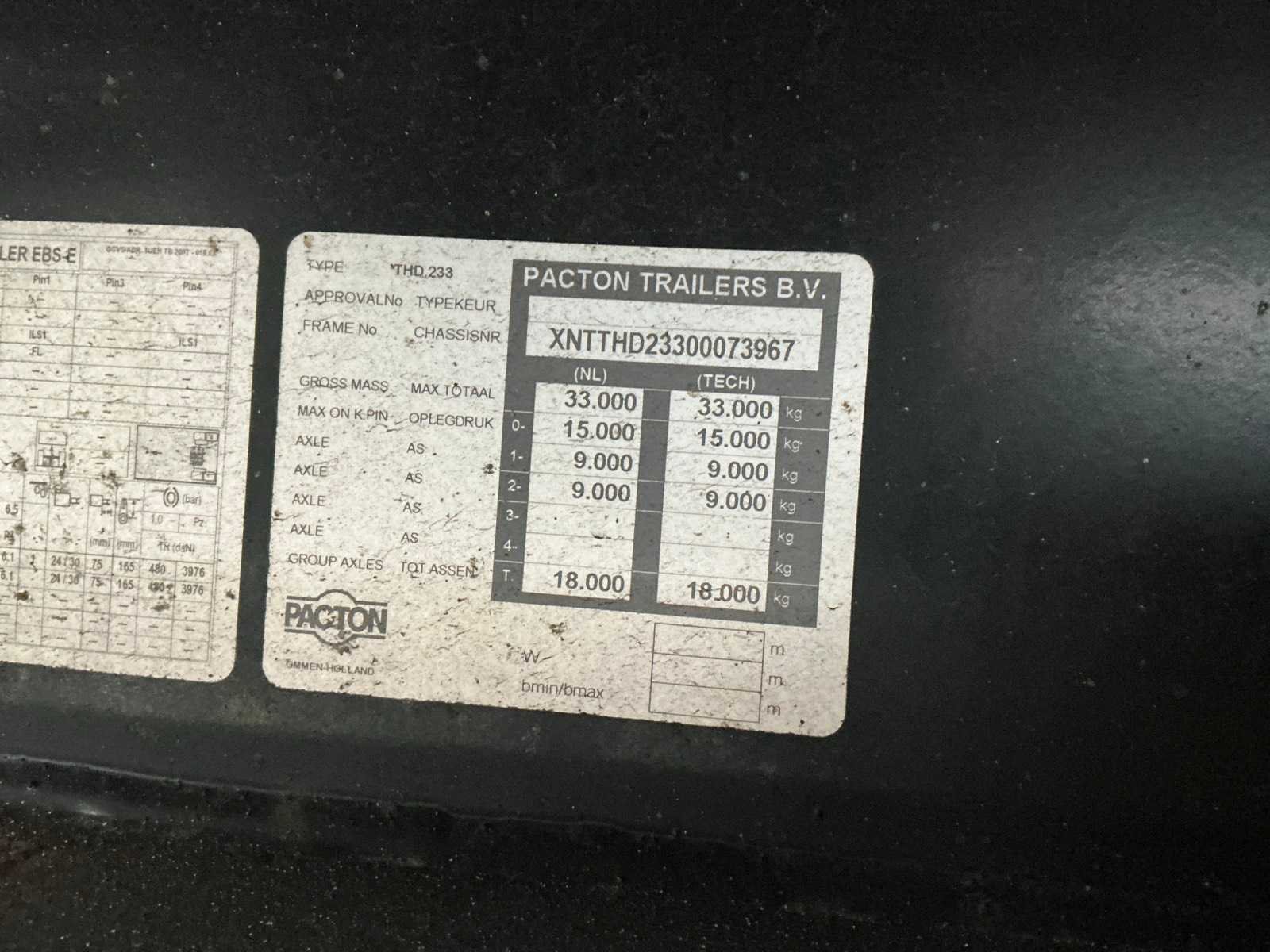 Max massa 33000kg, afstand hart koppeling tot achterzijde 1200cm, lengte 1381cm, breedte 255cm, wielbasis 891cm., Voorzien van Heiwo opbouw, Luchtgeveerde PBW assen waarvan as2 gedwongen gestuurd, Dhollandia DHSMR20 ondervouw laadklepbandenmaatv 385/55R22.5 Merk: Pacton Type: THD.233 Bouwjaar: 2016 Chassisnummer VIN: XNTTHD23300073967 Kenteken: OP-53-BV Datum eerste toelating (NL): 2016-01-12 Datum eerste toelating: 2016-01-12 APK vervaldatum: 2026-01-12 Aantal assen: 2 Laadvermogen: 22440kg Eigen gewicht: 10560kg Zelf rijdend exporteren: Niet mogelijk No self drive export!: true