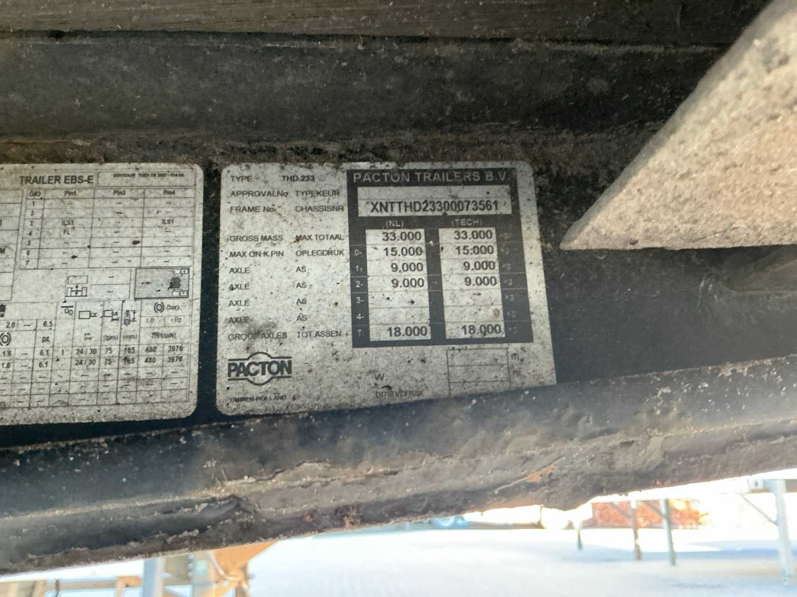 Max massa 33000kg, afstand hart koppeling tot achterzijde voertuig 1200cm , lengte totaal 1374cm, breedte 255cm Lift-as, stuur-as, bandenmaat 385/55R22.5 Merk: Pacton Type: THD 233 Bouwjaar: 2015 Chassisnummer VIN: XNTTHD23300073561 Kenteken: ON-45-YN Datum eerste toelating (NL): 2015-09-15 Datum eerste toelating: 2015-09-15 APK vervaldatum: 2026-09-15 Aantal assen: 2 Laadvermogen: 22680kg Hydraulische laadklep: true Eigen gewicht: 10320kg Zelf rijdend exporteren: Mogelijk
