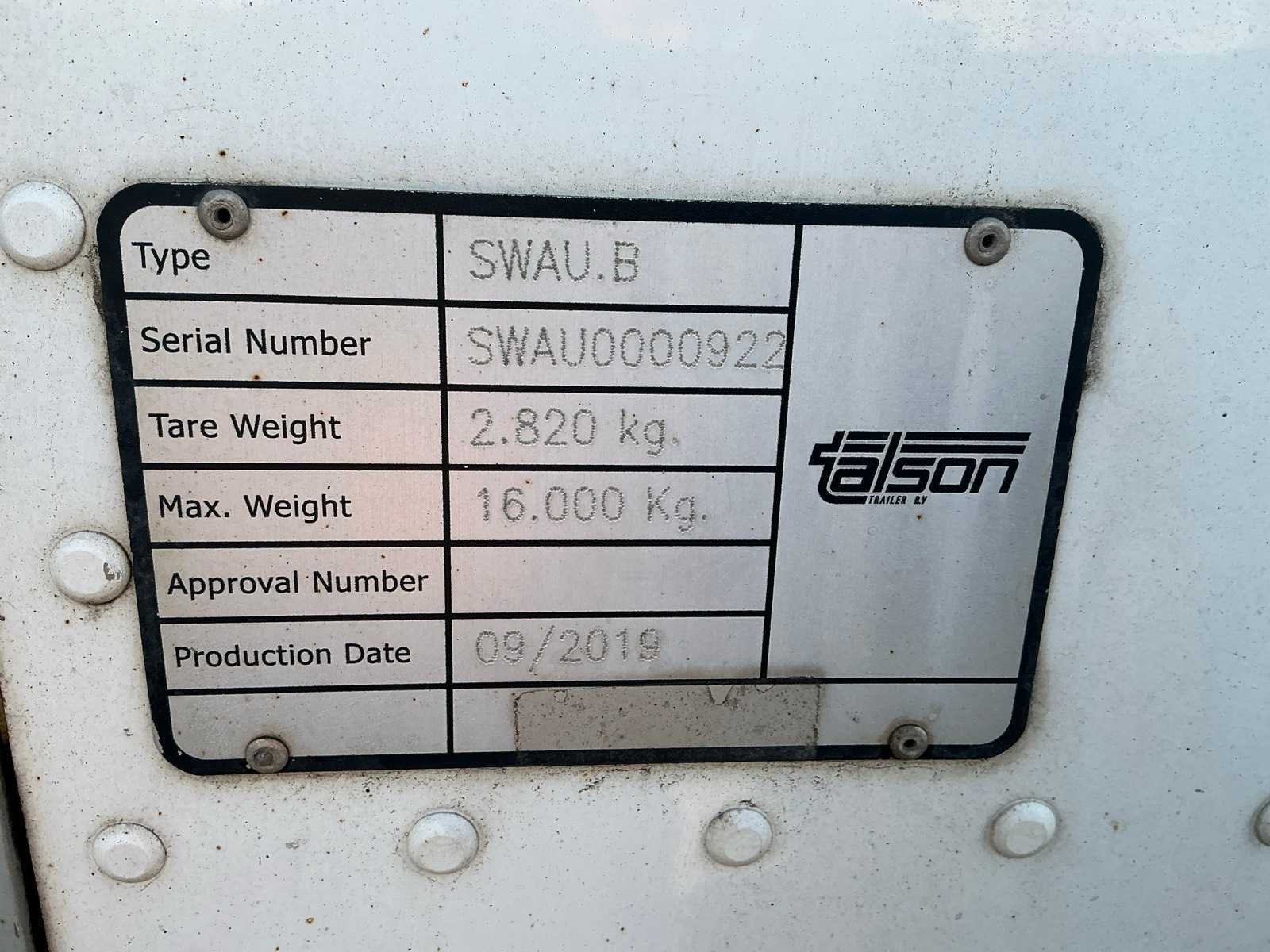 Voorzien van twistlocks, steunpoten, afmeting circa 7,45x2,55meter eigen gewicht 2820kg, max massa 16000kg. Merk: Talson Type: SWAU.B Bouwjaar: 2019 Serienummer: SWAU0000922