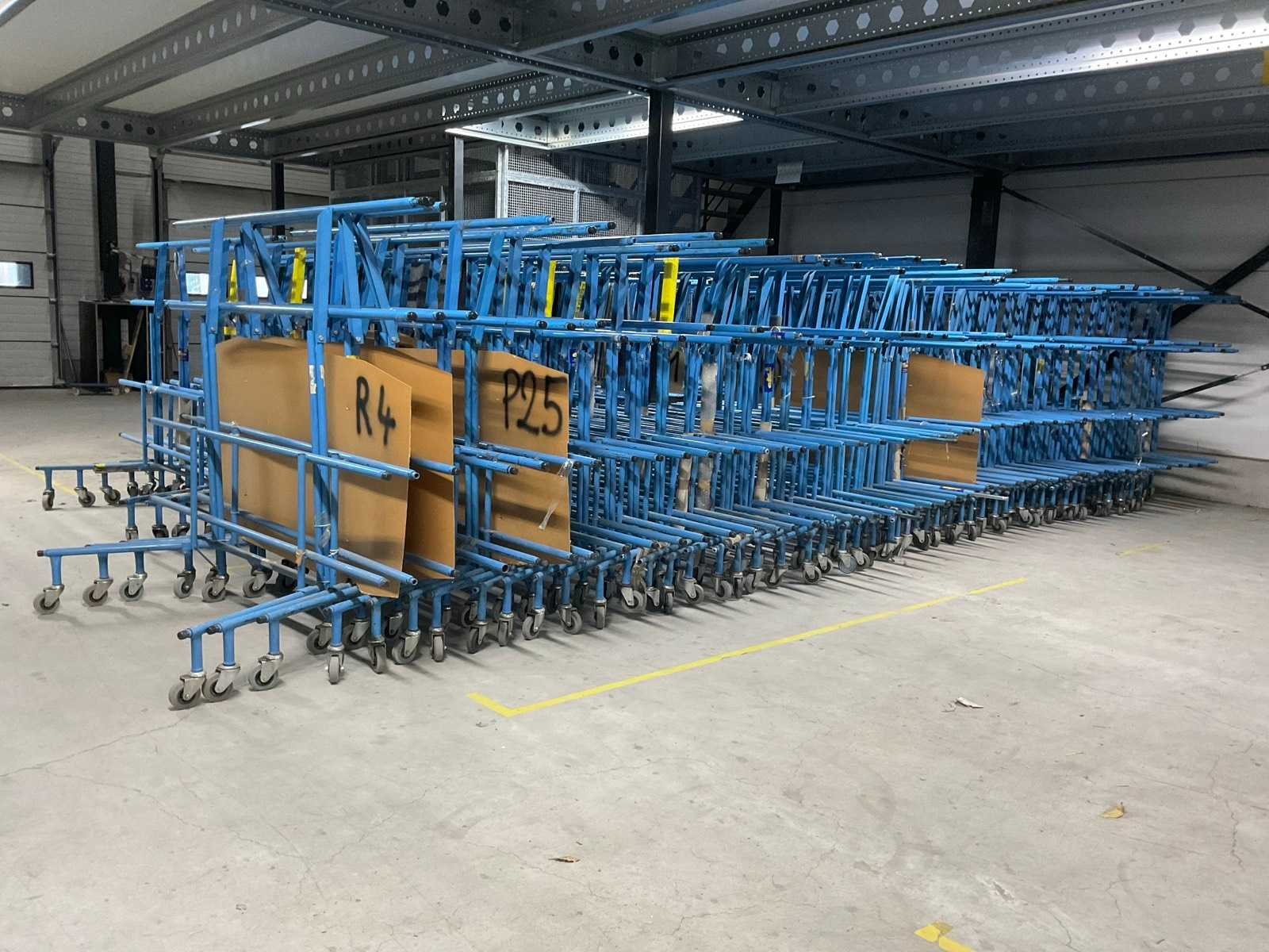 Materiaal: Buisstalen frame, Kleur: Blauw. Voorzien van: uitschuifbare stangen, zwenkwielen.