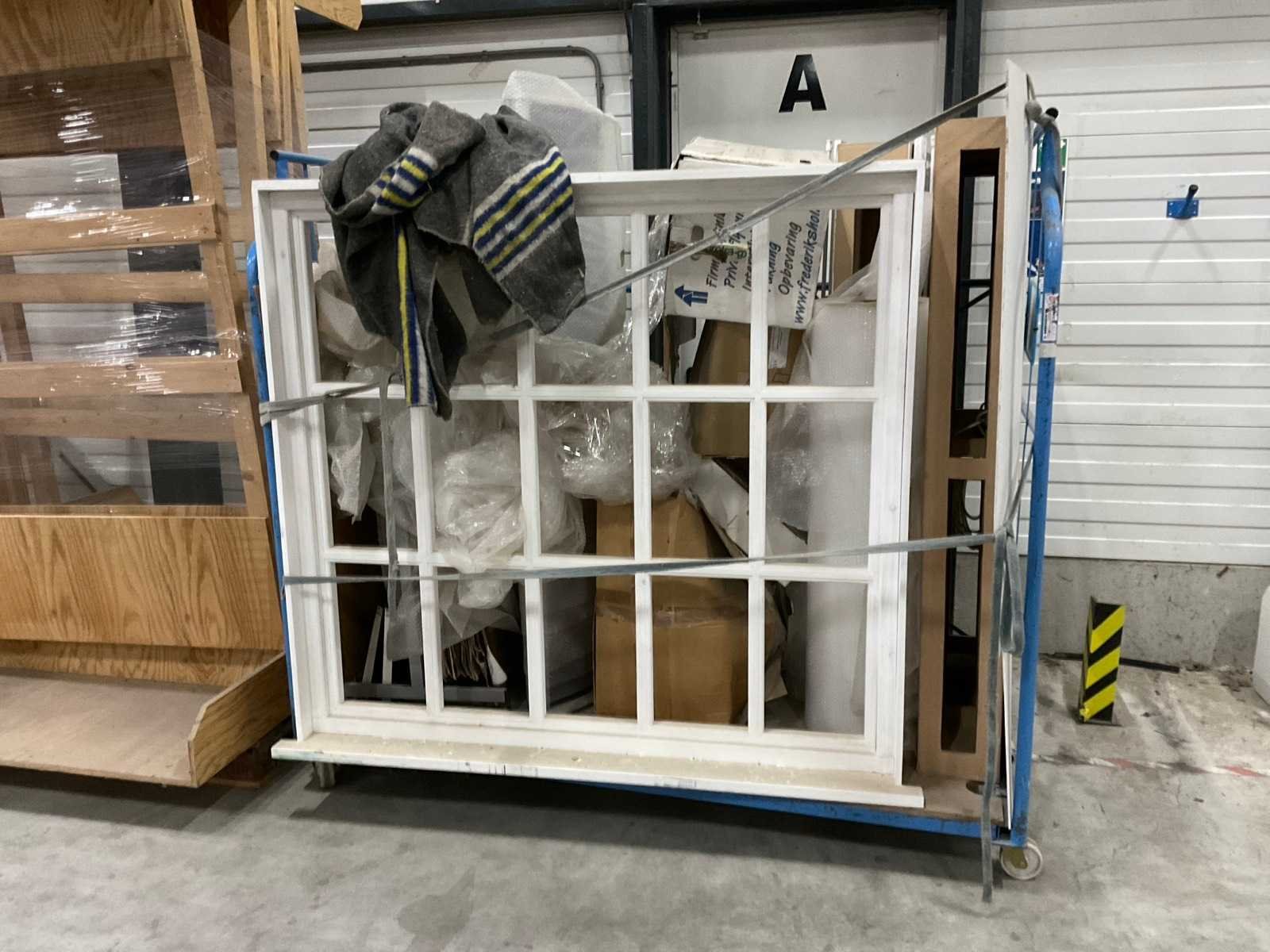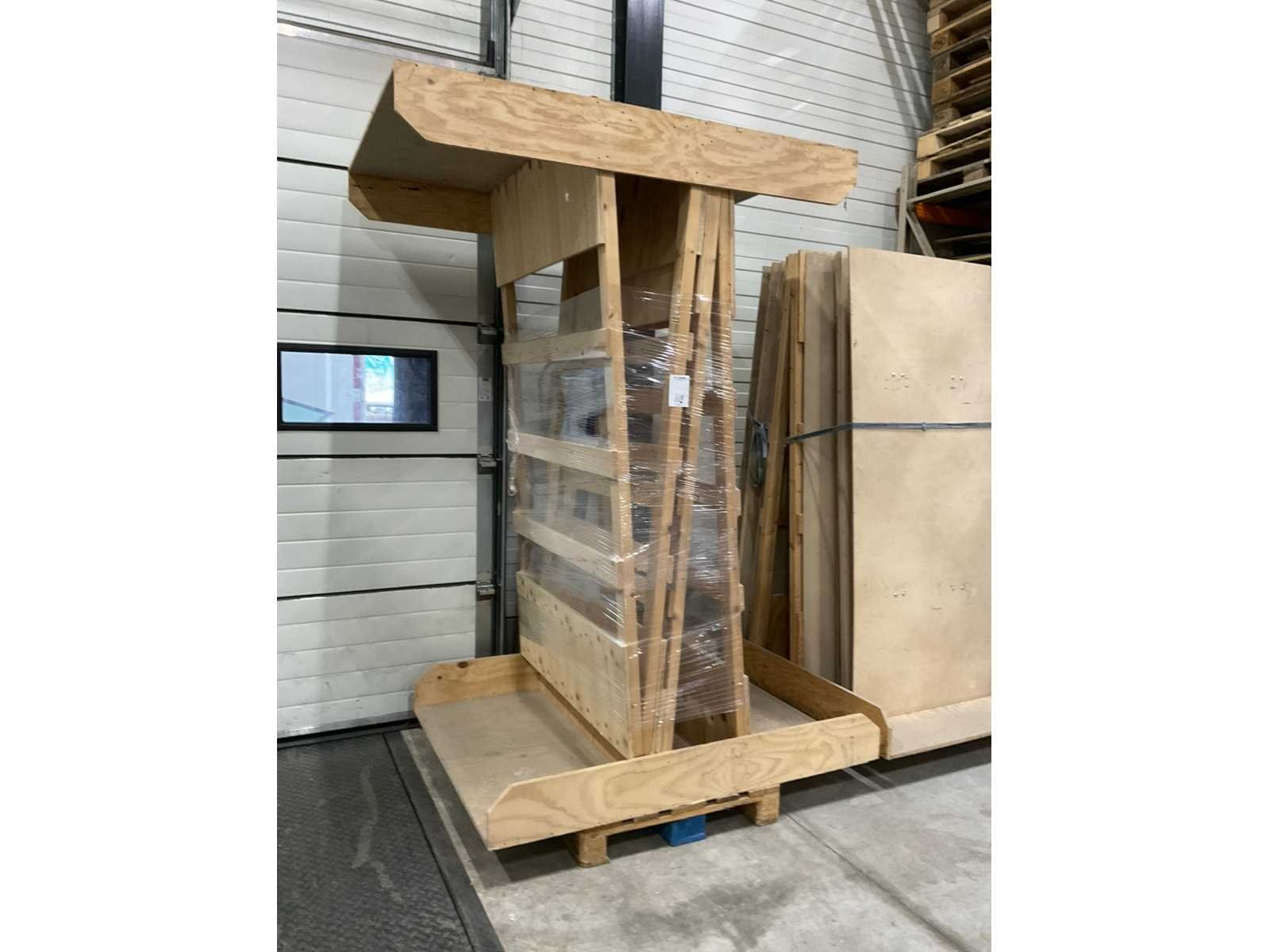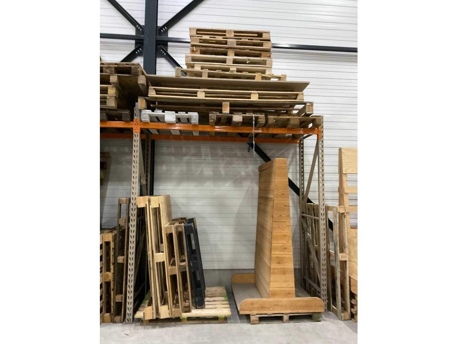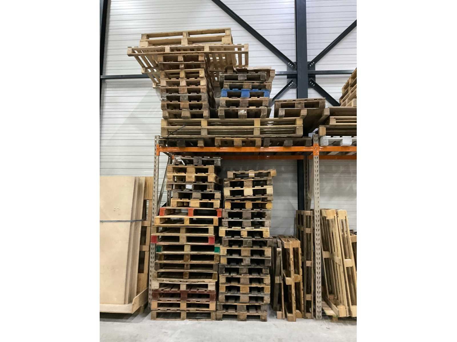 Diverse soorten pallets (circa 70x), (7x) houten transportbokken, (2x) stellingdeel, (1x) meubeltransportwagen met kozijn, etc.