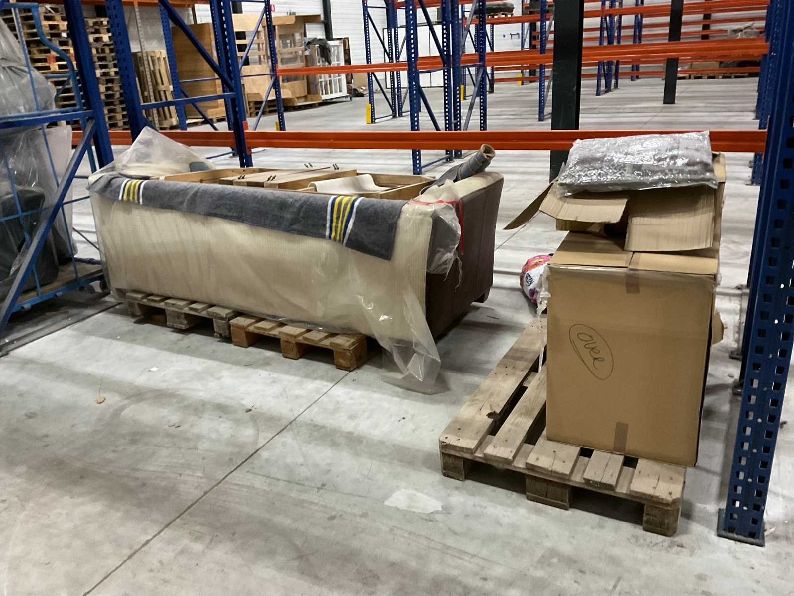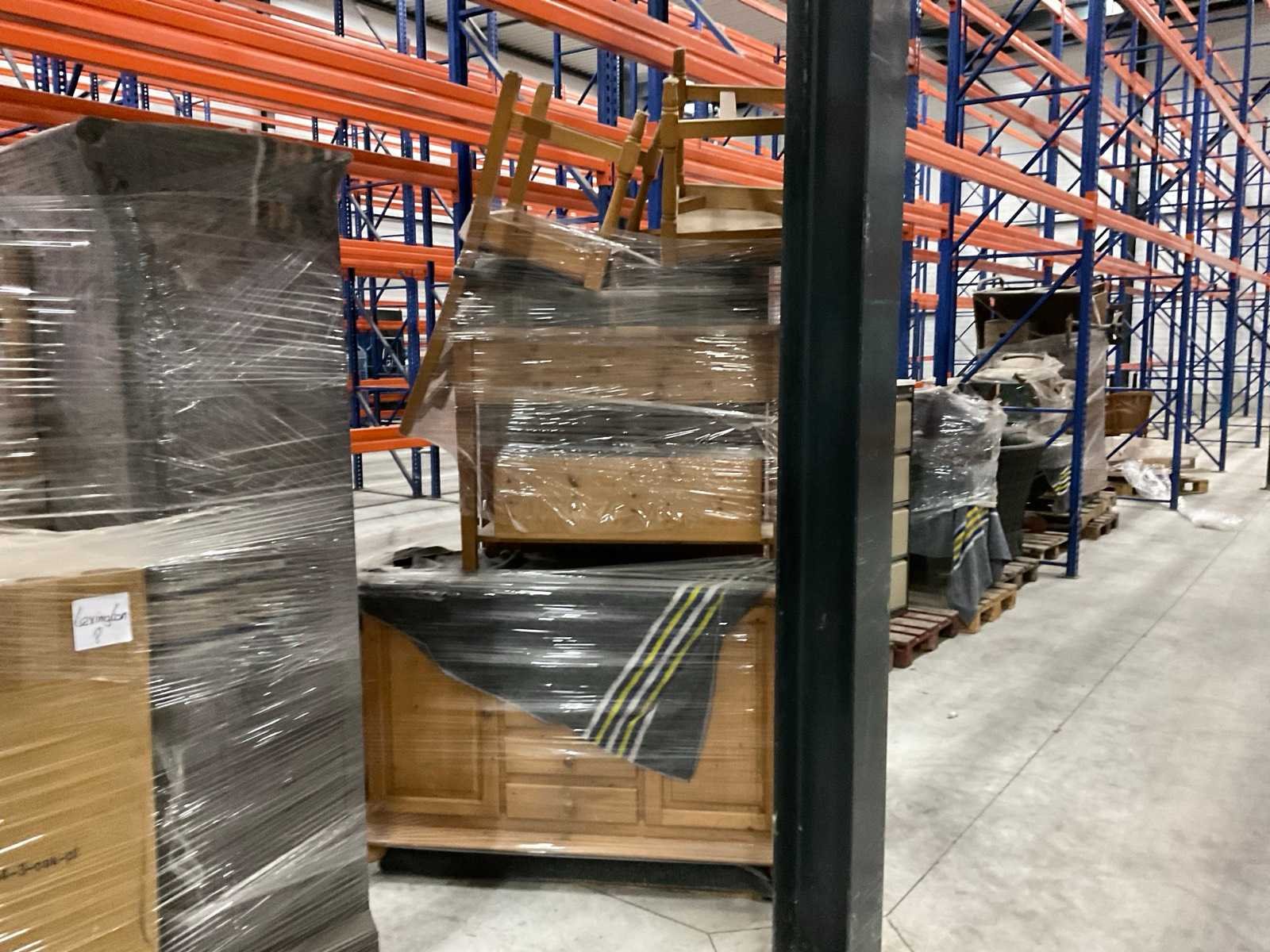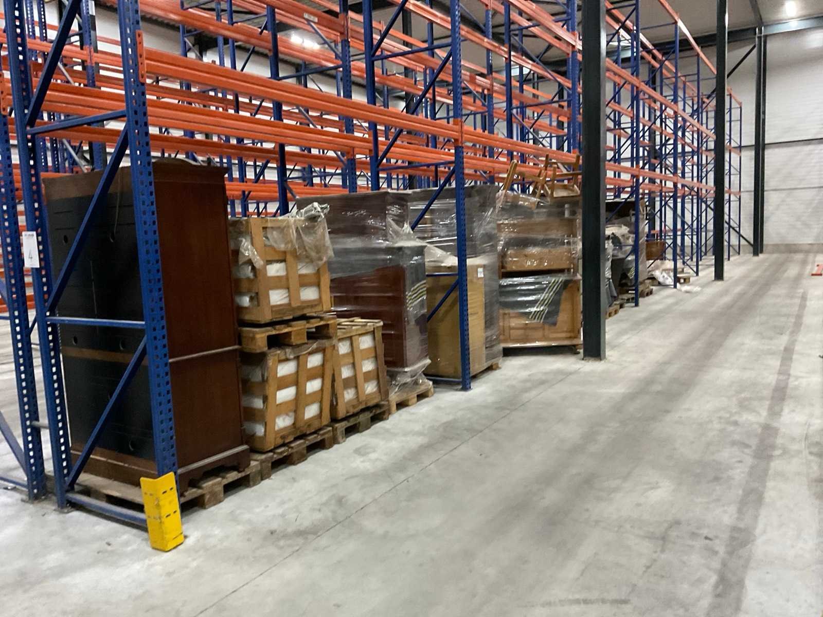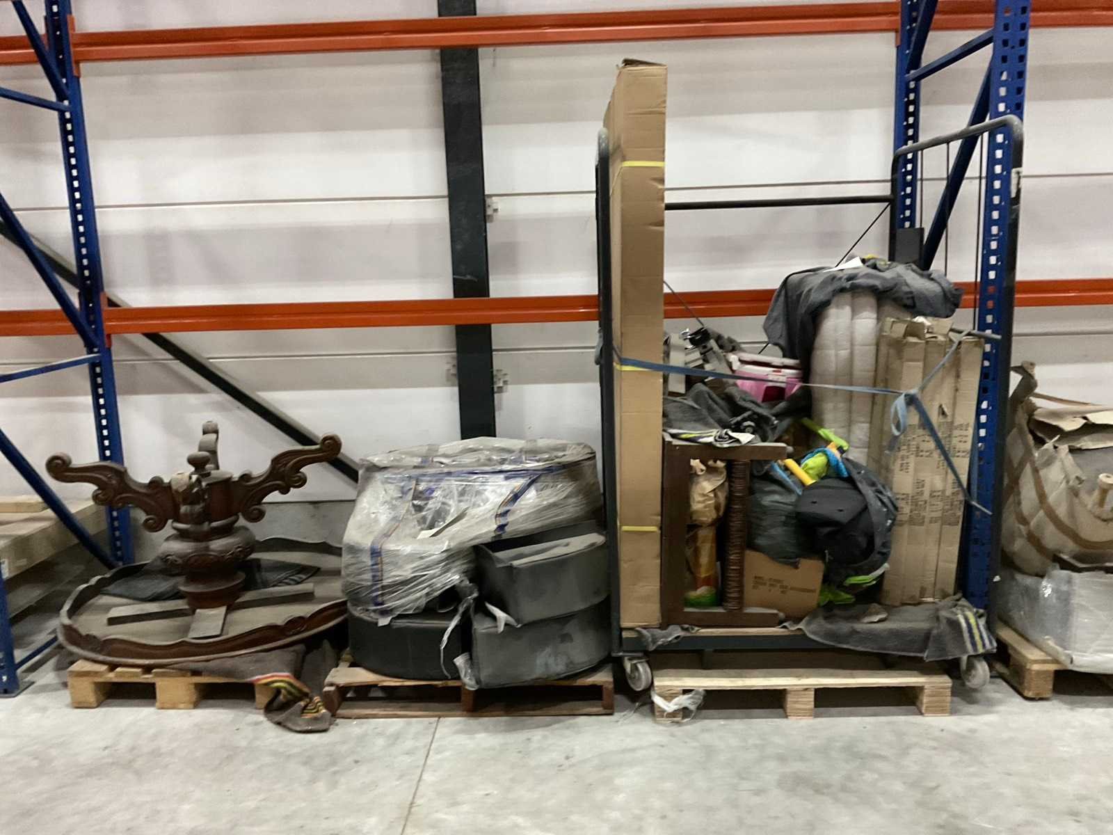 Diverse goederen in (3x) stellingdelen met zitmeubels, tafels, kasten, velgen, dakkoffer, etc. Inclusief: pallets en meubeltransportwagens