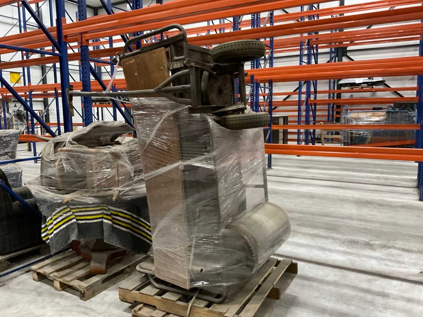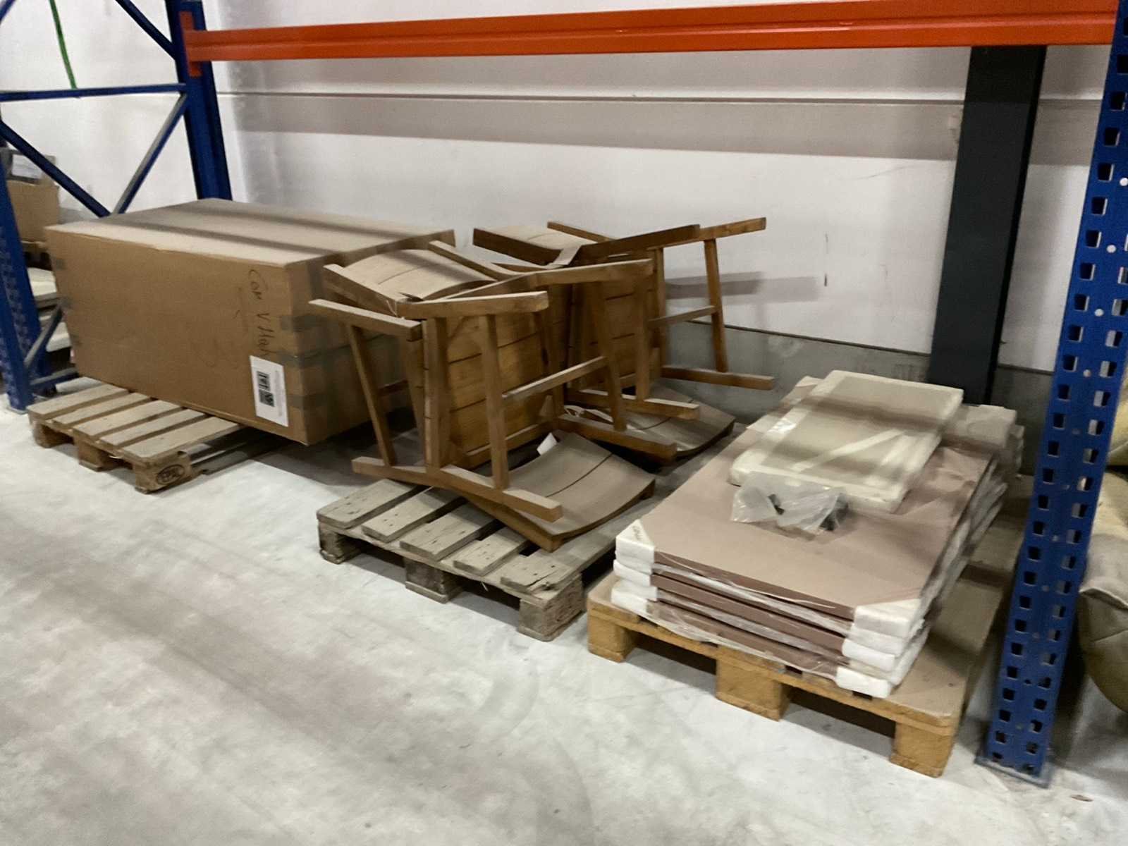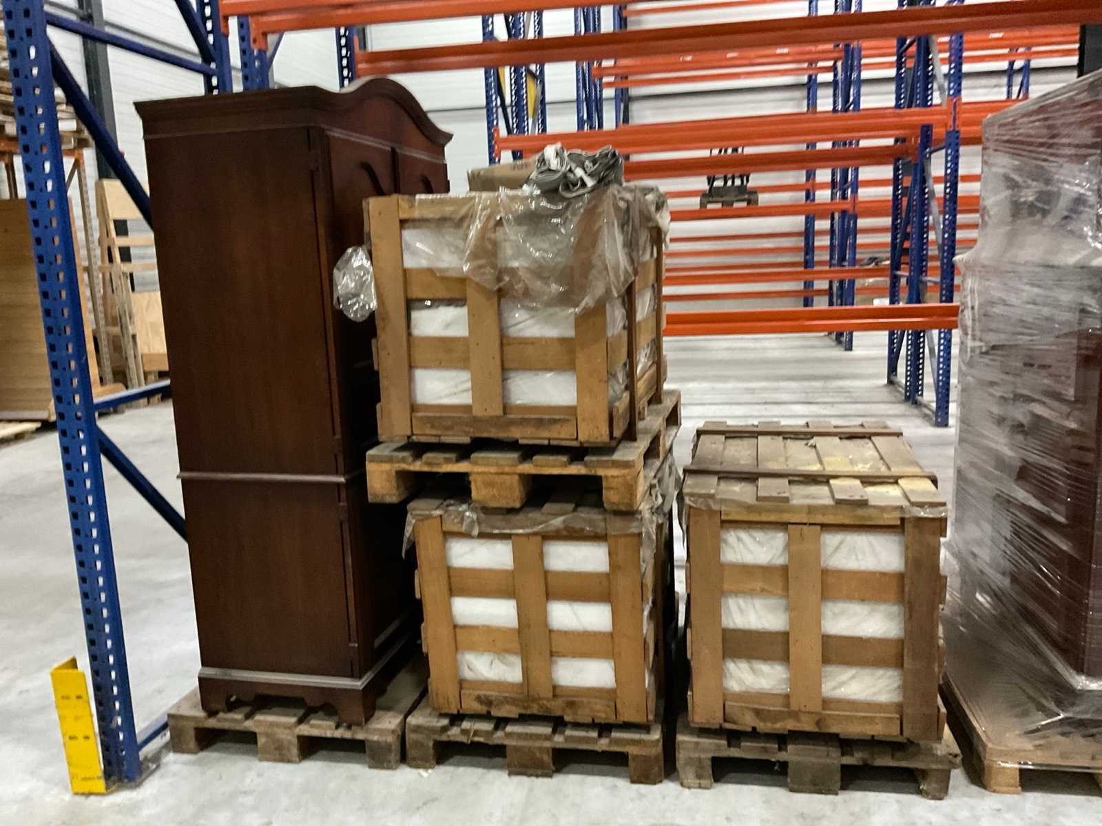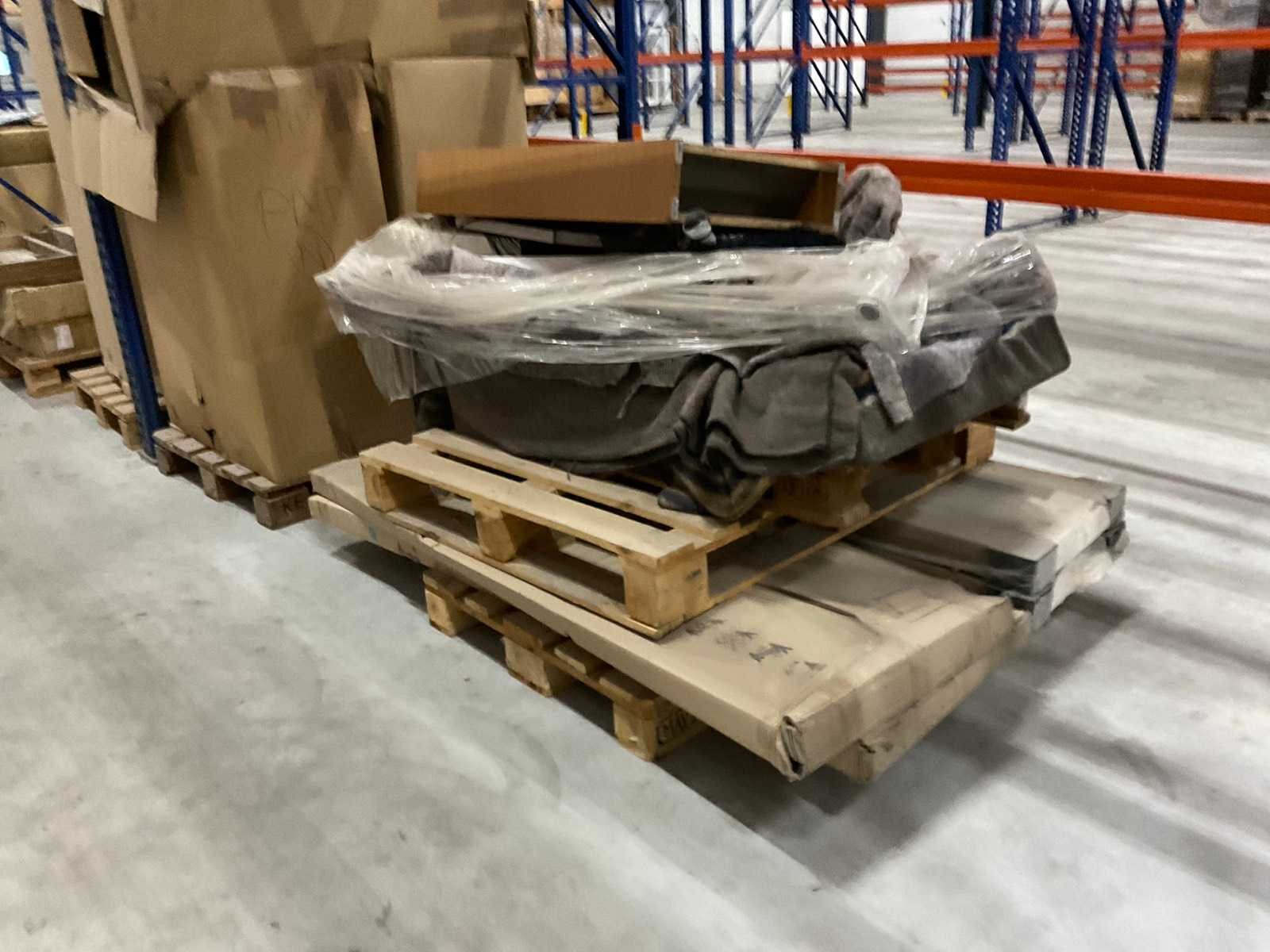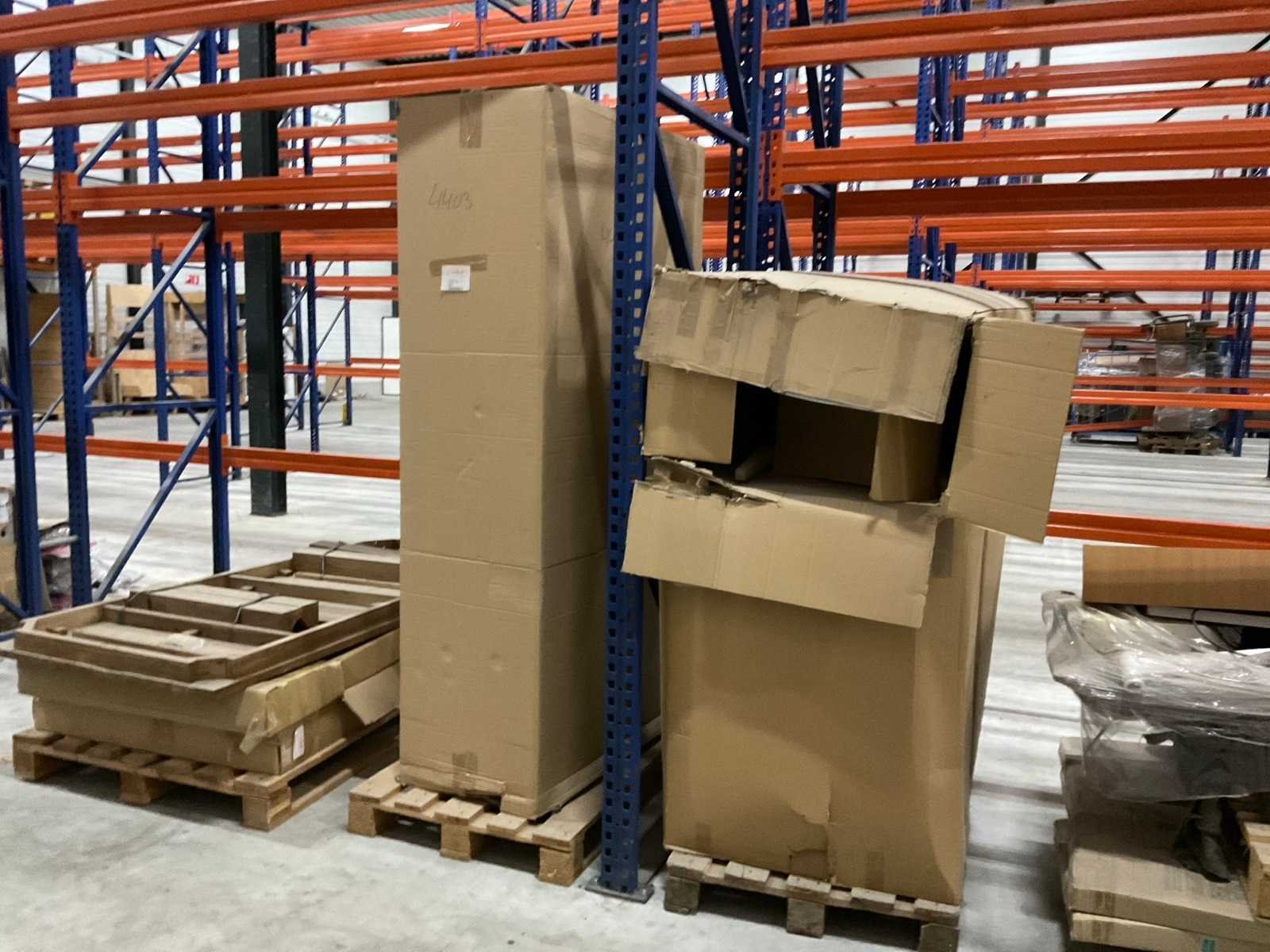 Diverse goederen in (3x) stellingdelen met zitmeubels, tafels, kasten, velgen, dakkoffer, etc. Inclusief: pallets en meubeltransportwagens