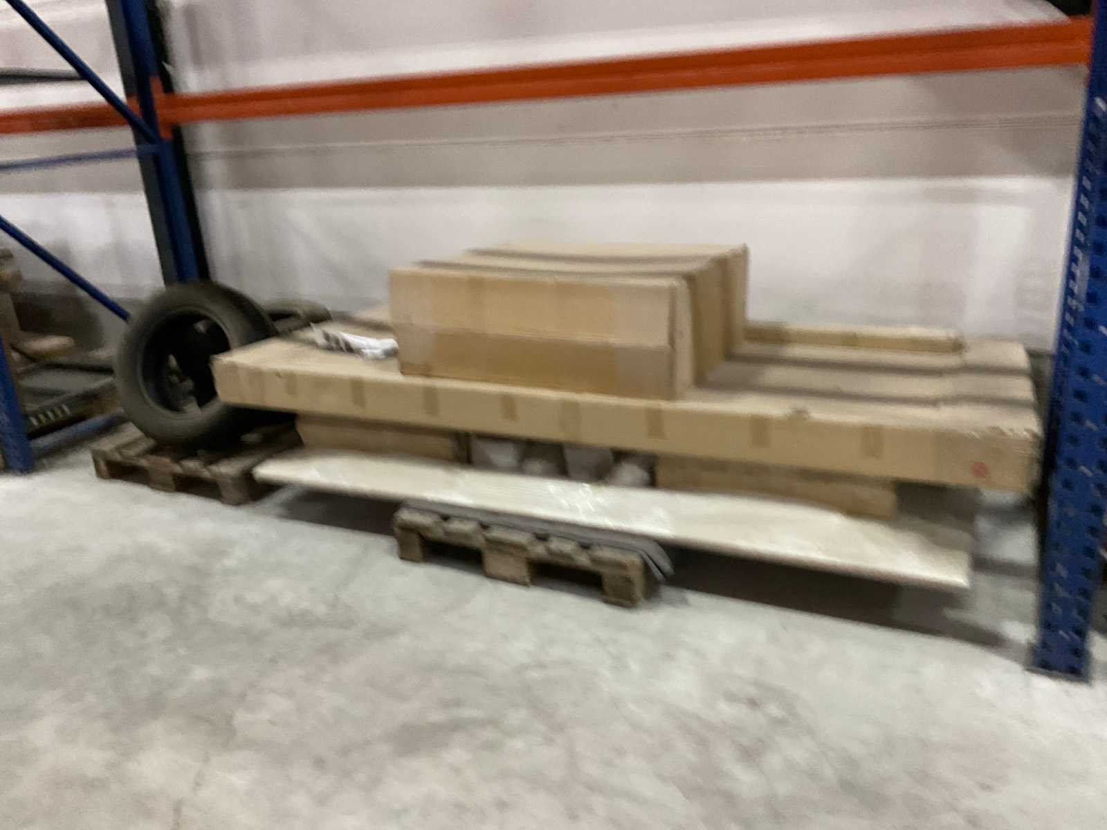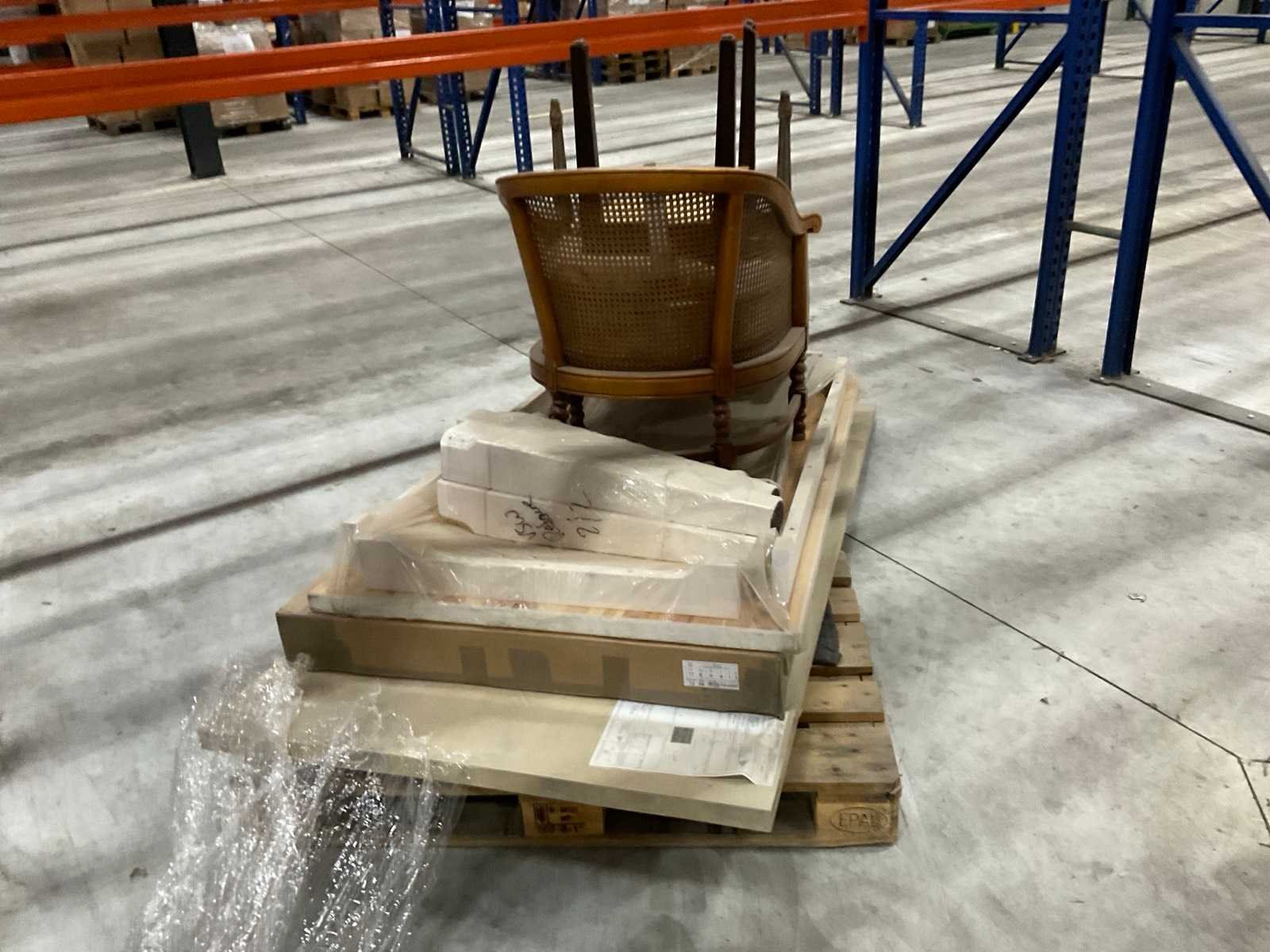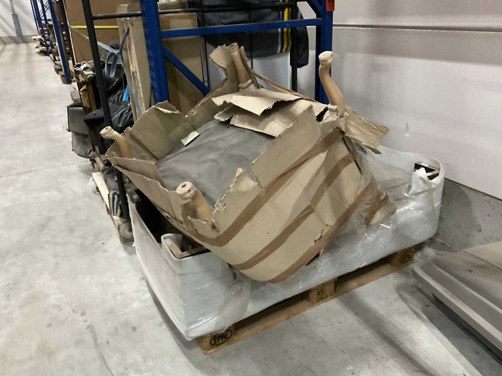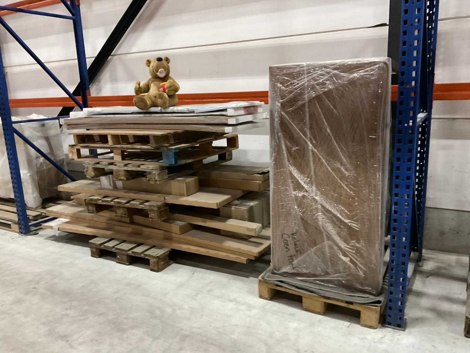 Diverse goederen in (3x) stellingdelen met zitmeubels, tafels, kasten, velgen, dakkoffer, etc. Inclusief: pallets en meubeltransportwagens