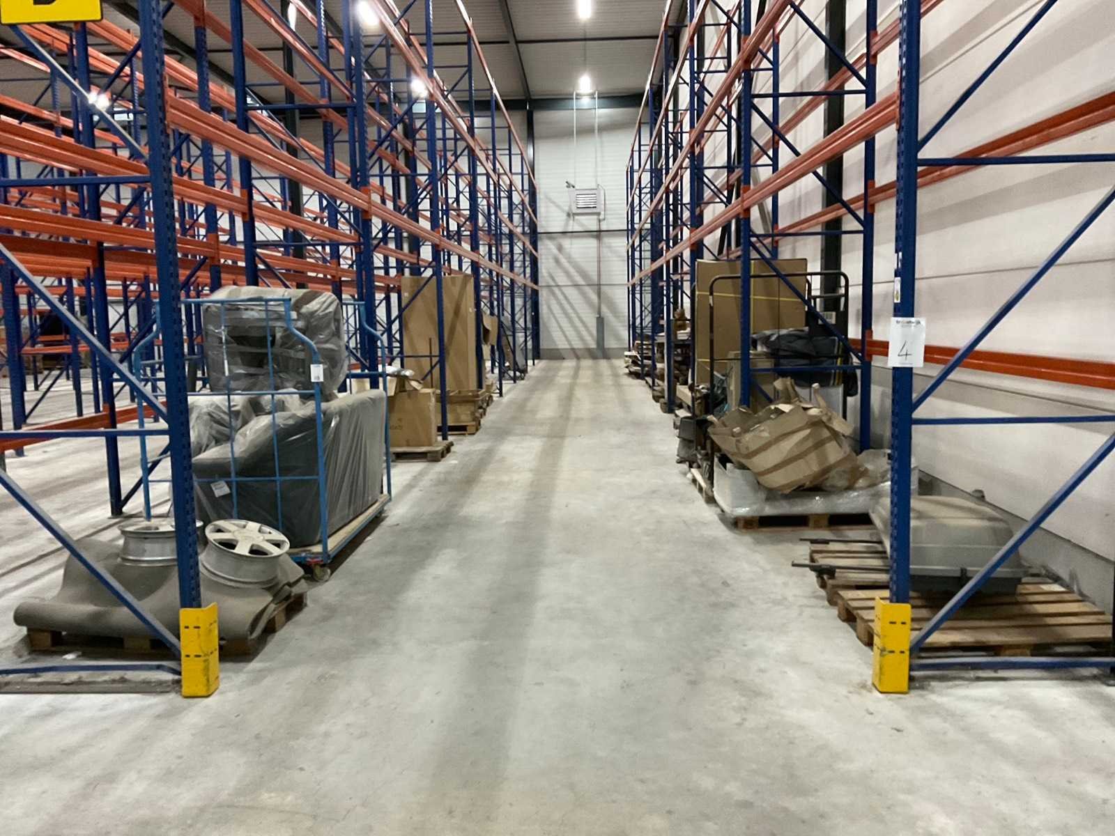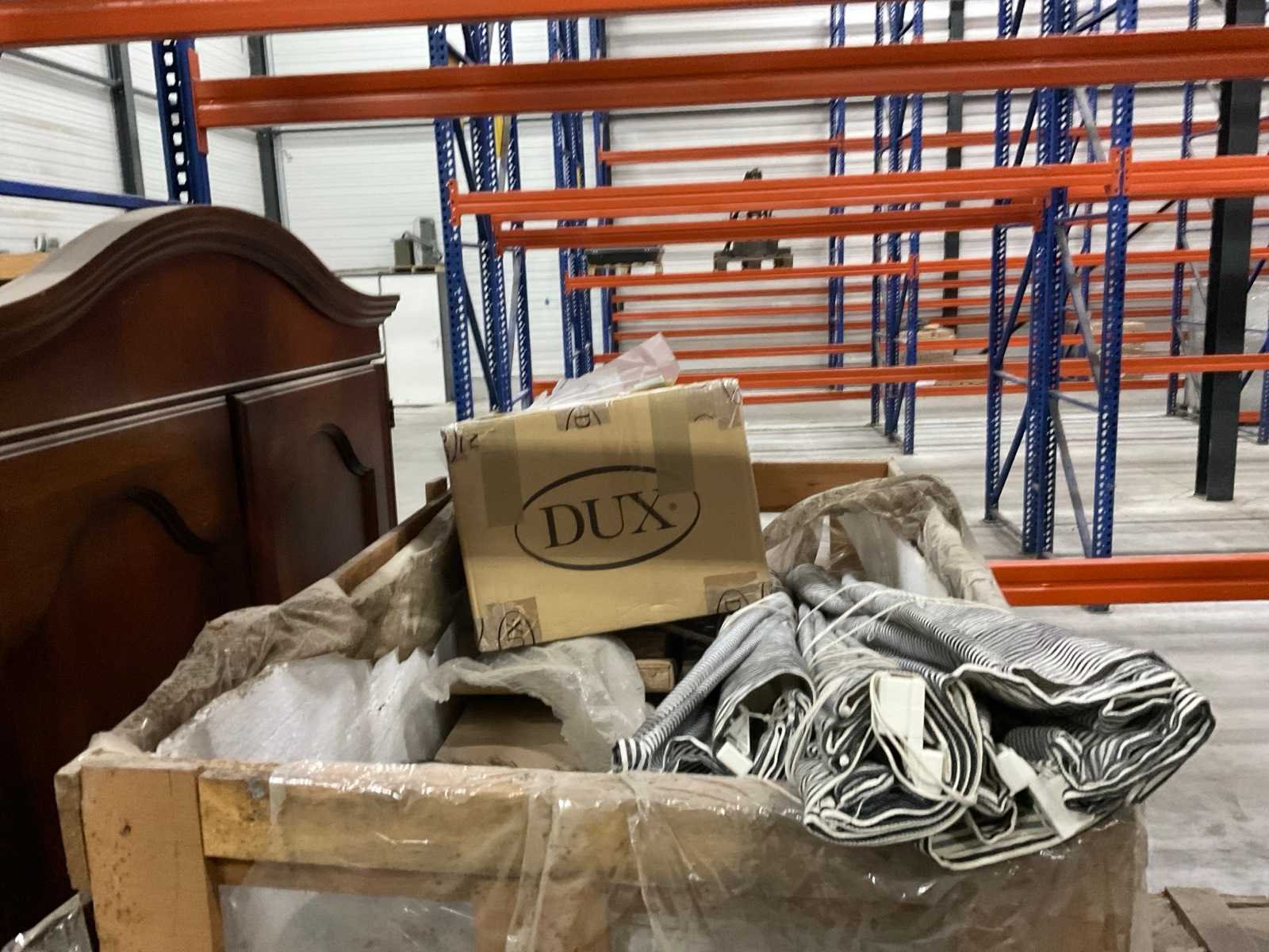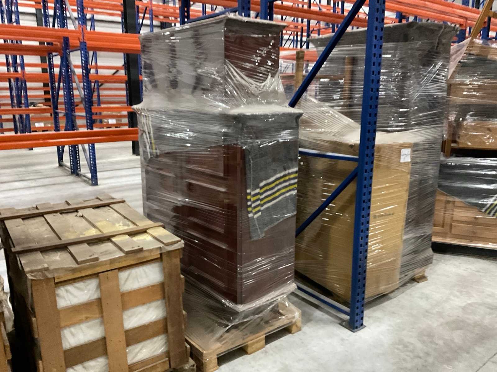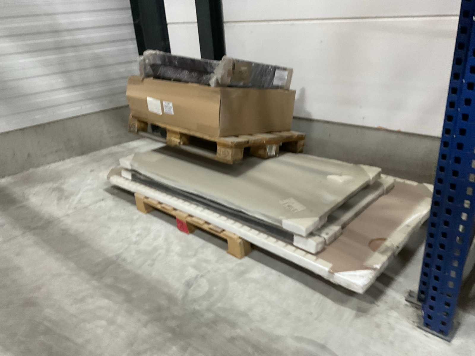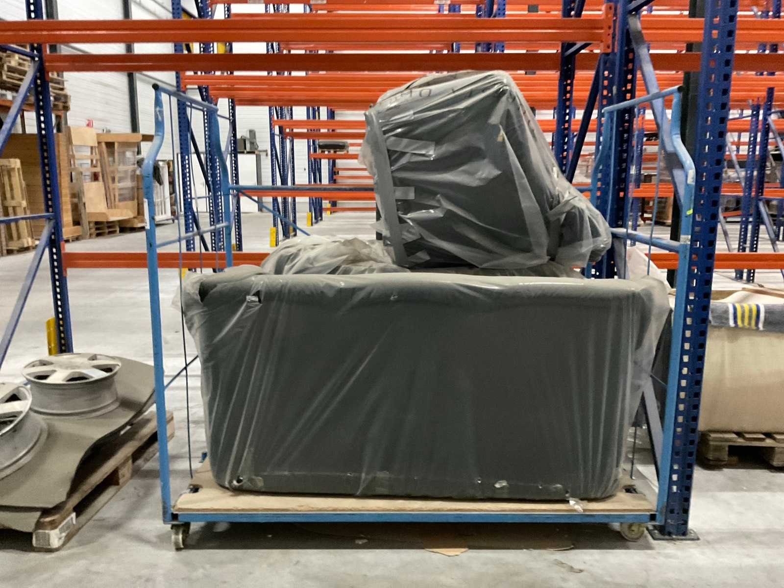 Diverse goederen in (3x) stellingdelen met zitmeubels, tafels, kasten, velgen, dakkoffer, etc. Inclusief: pallets en meubeltransportwagens