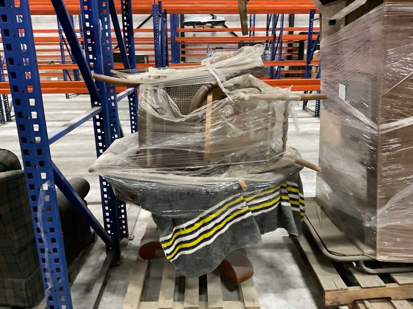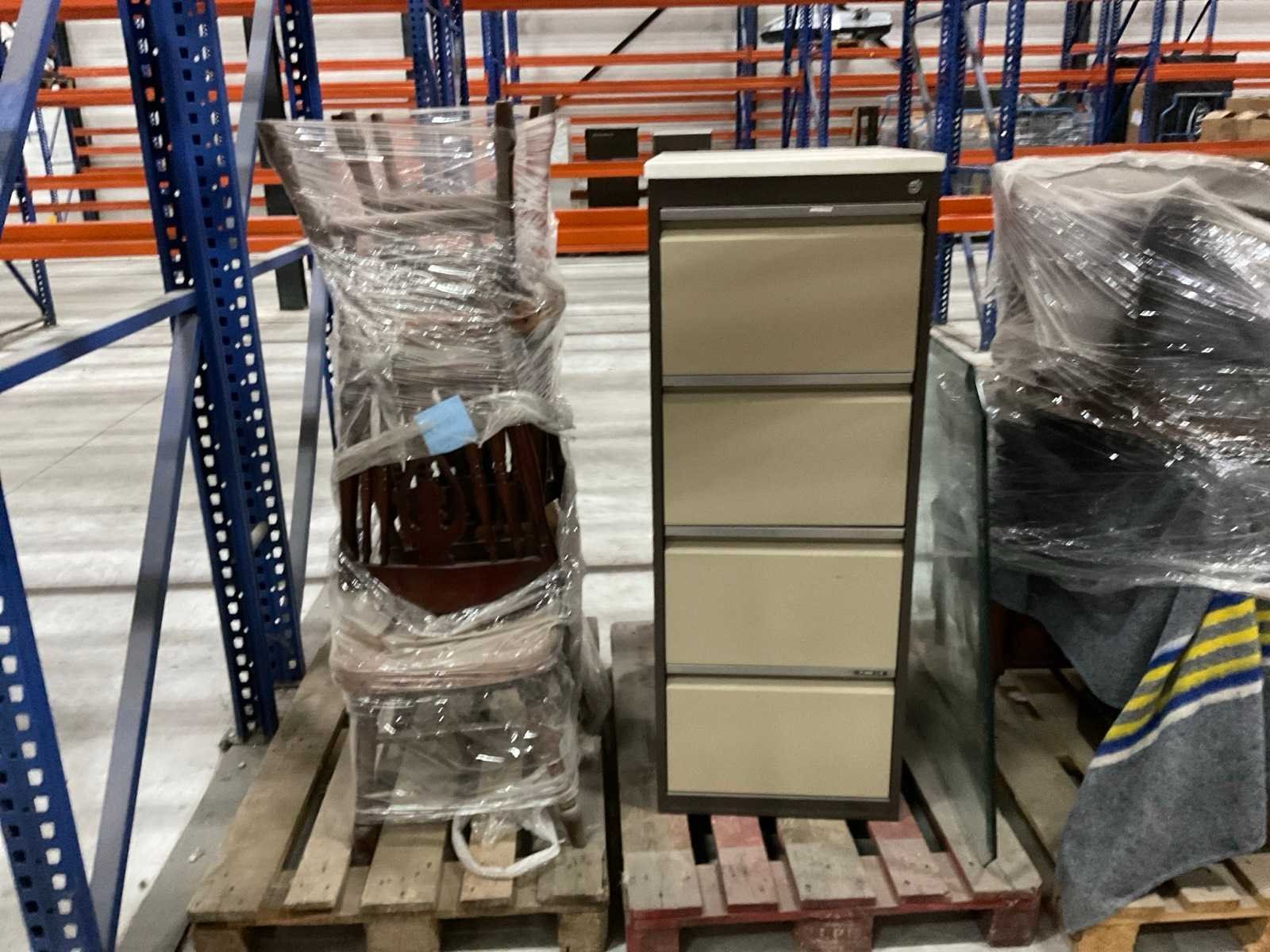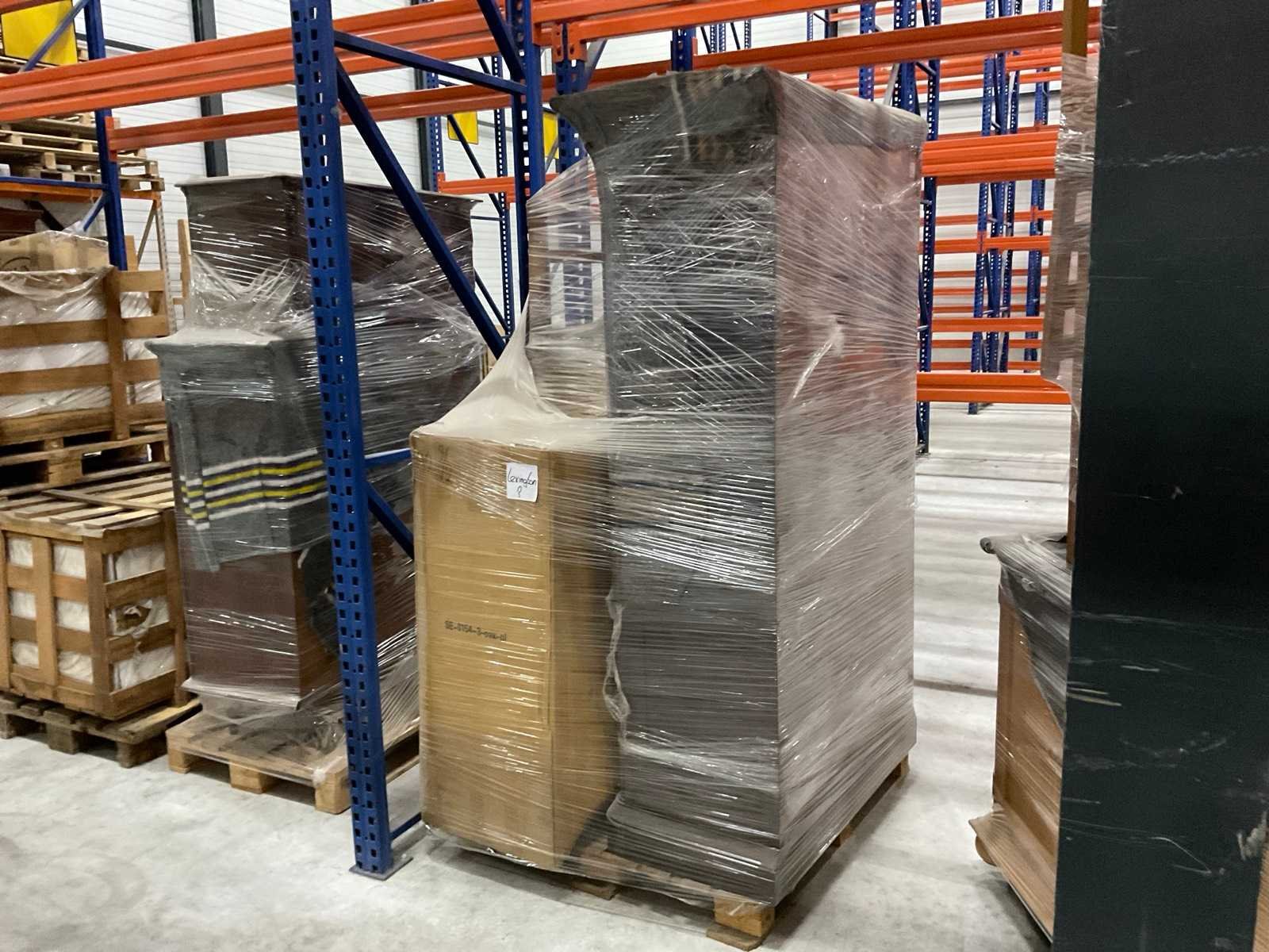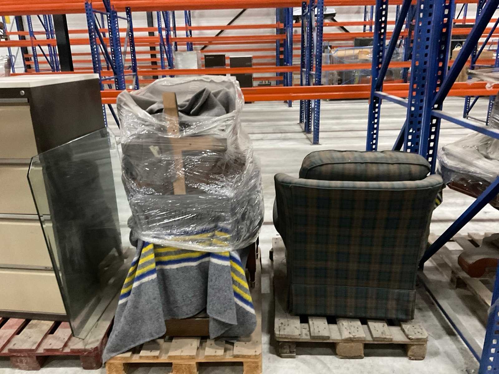 Diverse goederen in (3x) stellingdelen met zitmeubels, tafels, kasten, velgen, dakkoffer, etc. Inclusief: pallets en meubeltransportwagens