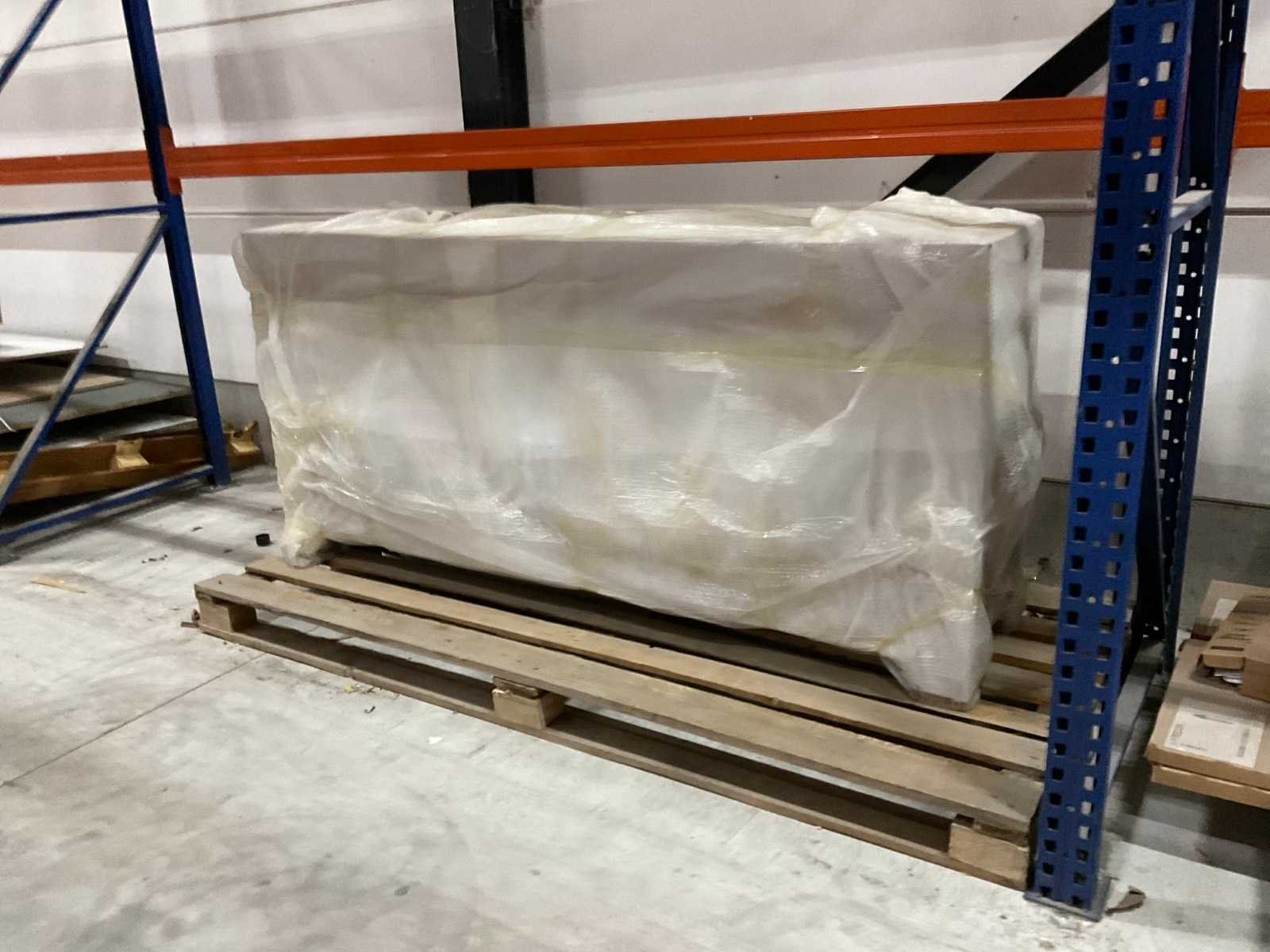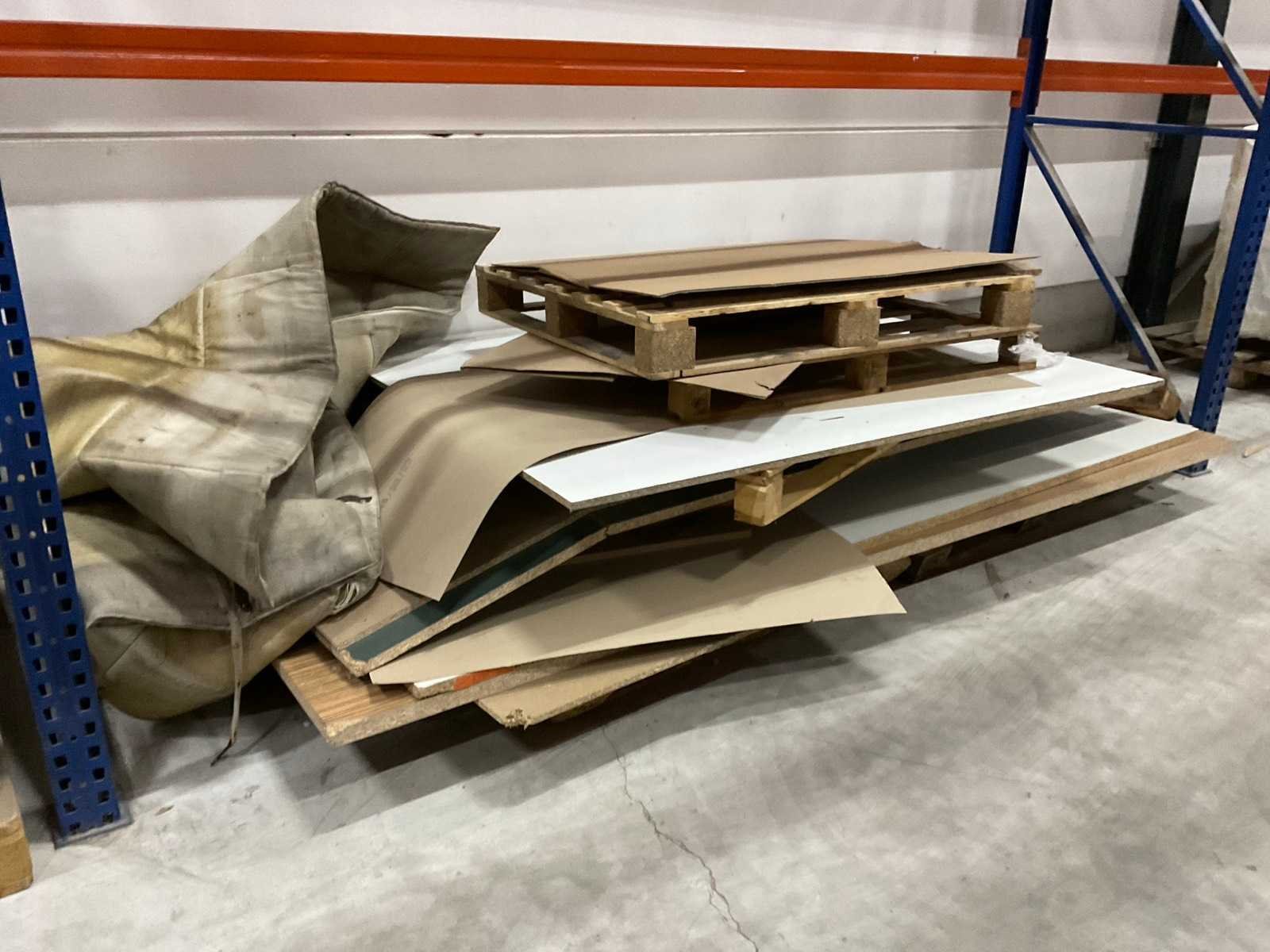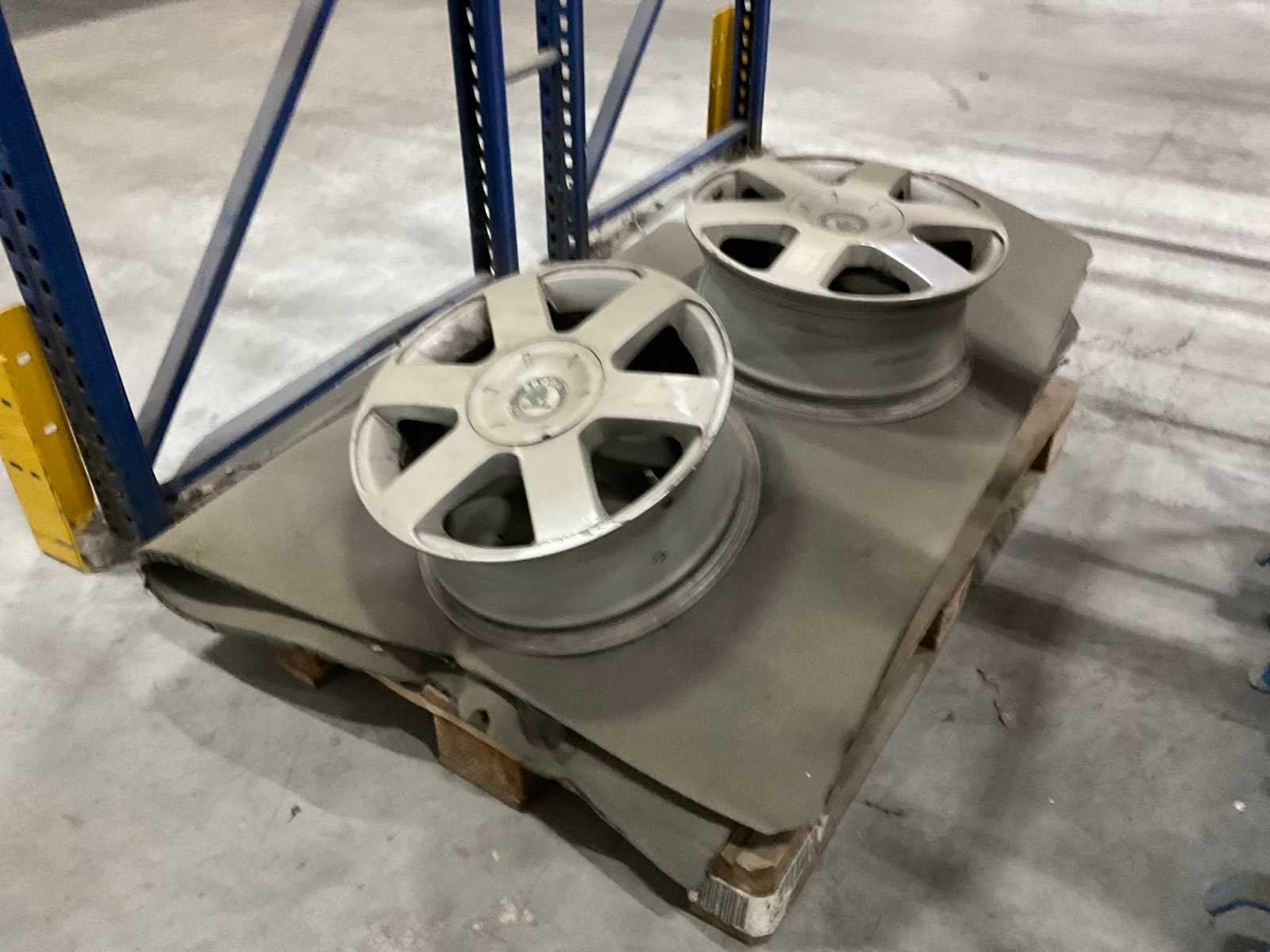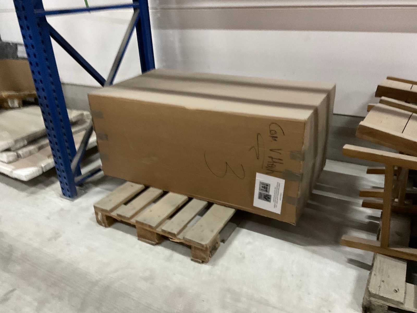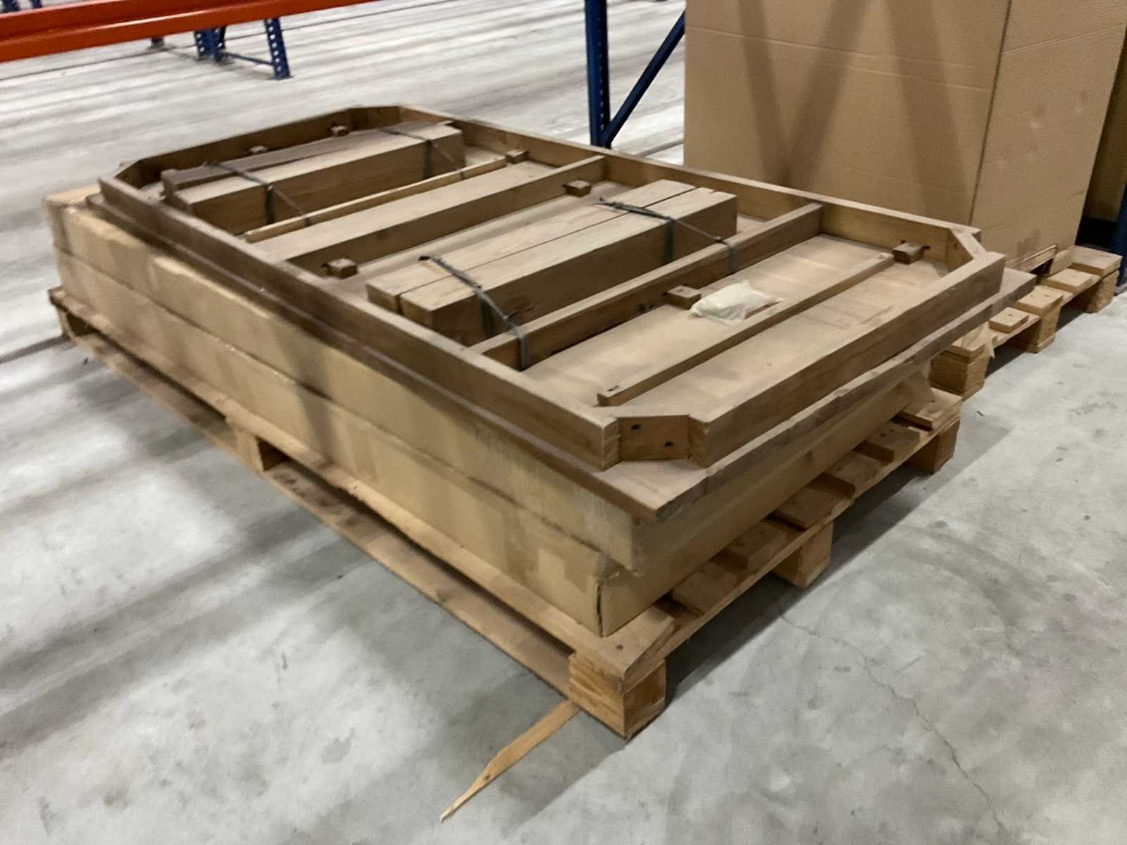 Diverse goederen in (3x) stellingdelen met zitmeubels, tafels, kasten, velgen, dakkoffer, etc. Inclusief: pallets en meubeltransportwagens