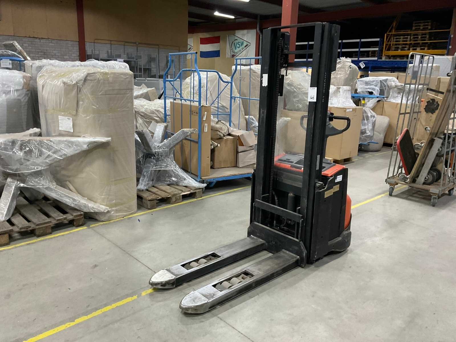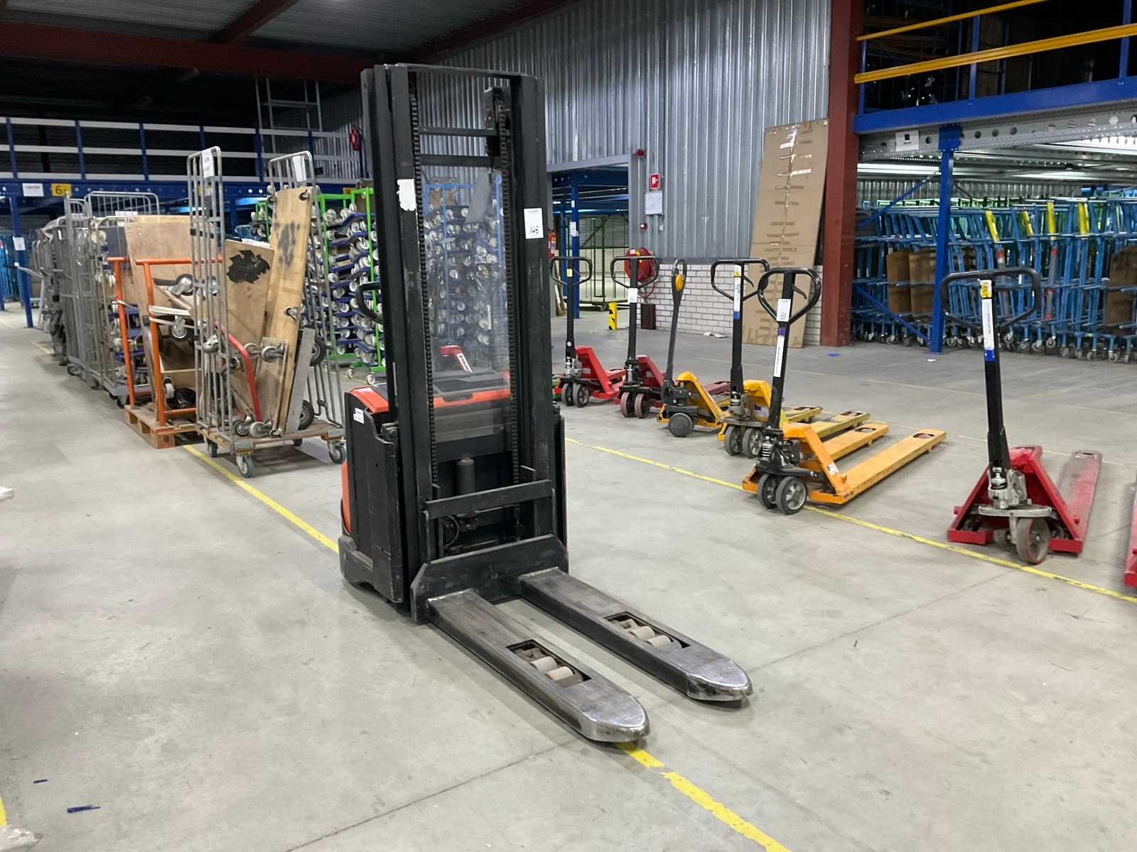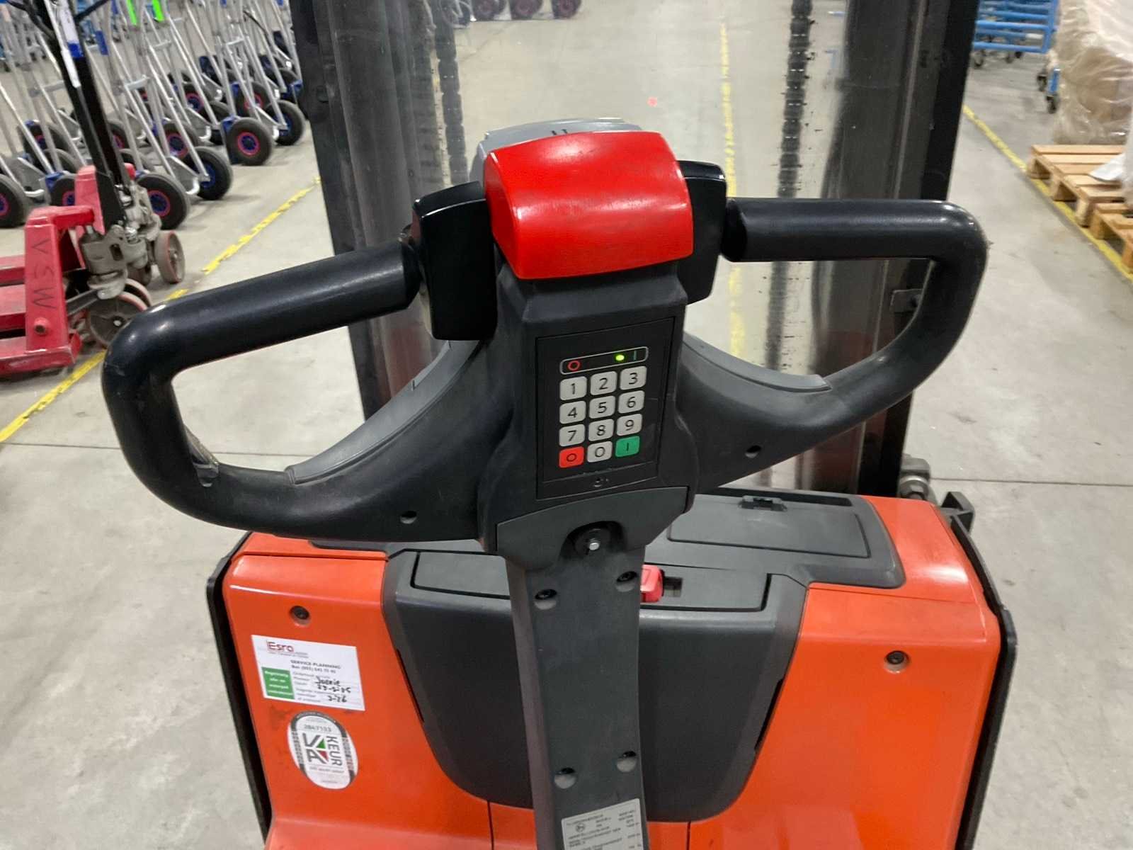 Inclusief: lader Merk: BT Type: SWE140L Bouwjaar: 2014 Serienummer: 6297008 Hefvermogen: 1400kg Hefhoogte: 2855mm Lepellengte: 115mm Minimale doorrijhoogte: 1960mm Totale afmeting L: 190mm Totale afmeting Breedte: 760mm Totale afmeting Hoogte: 1960mm