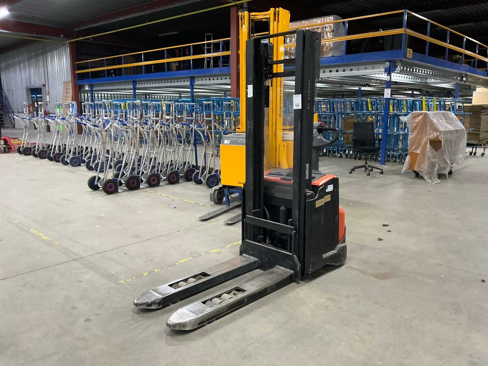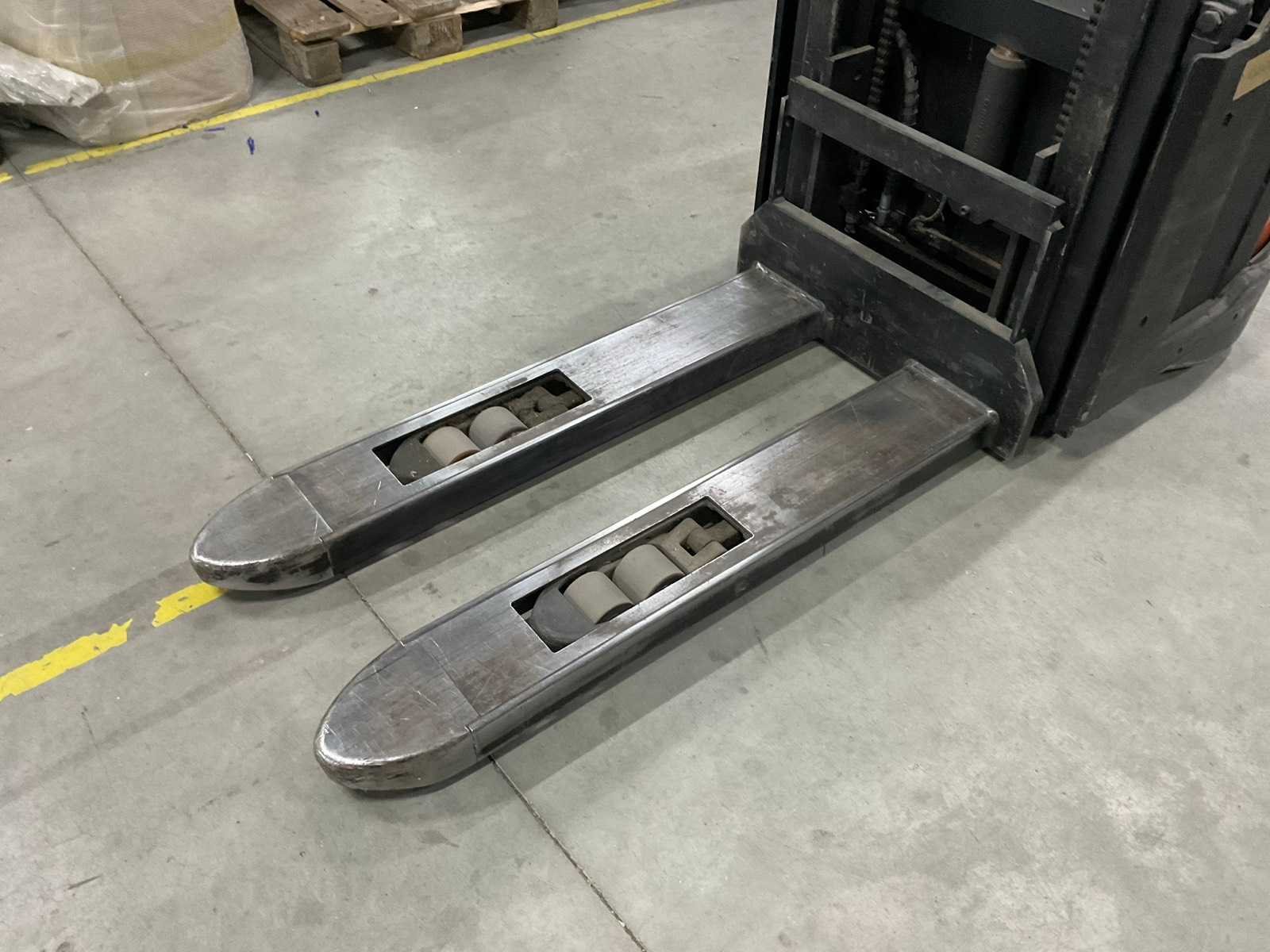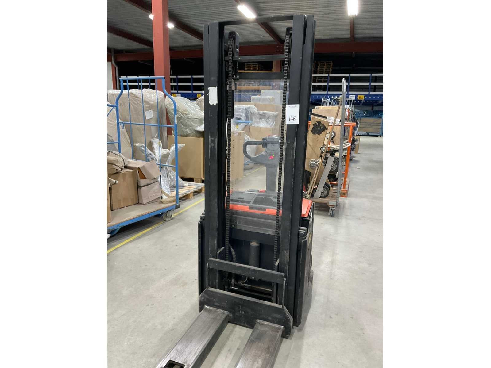 Inclusief: lader Merk: BT Type: SWE140L Bouwjaar: 2014 Serienummer: 6297008 Hefvermogen: 1400kg Hefhoogte: 2855mm Lepellengte: 115mm Minimale doorrijhoogte: 1960mm Totale afmeting L: 190mm Totale afmeting Breedte: 760mm Totale afmeting Hoogte: 1960mm