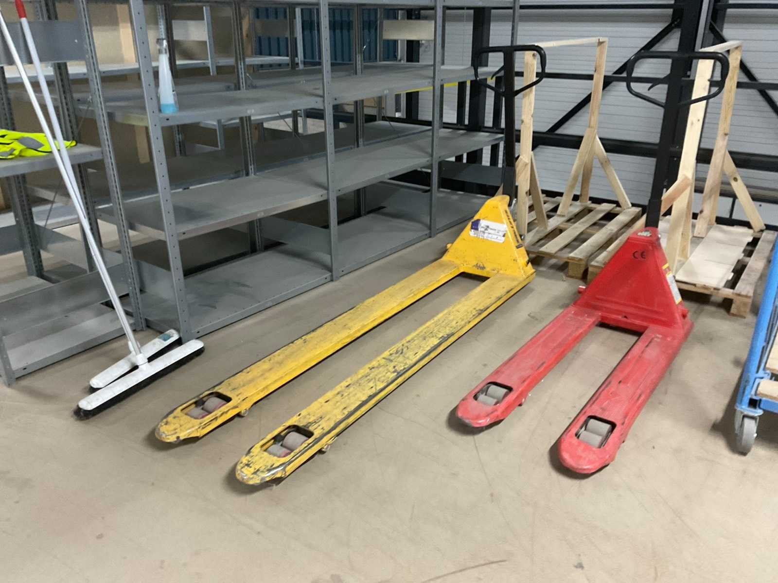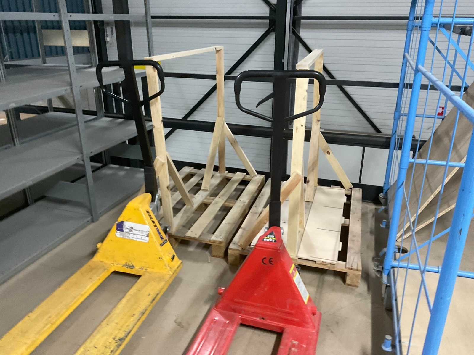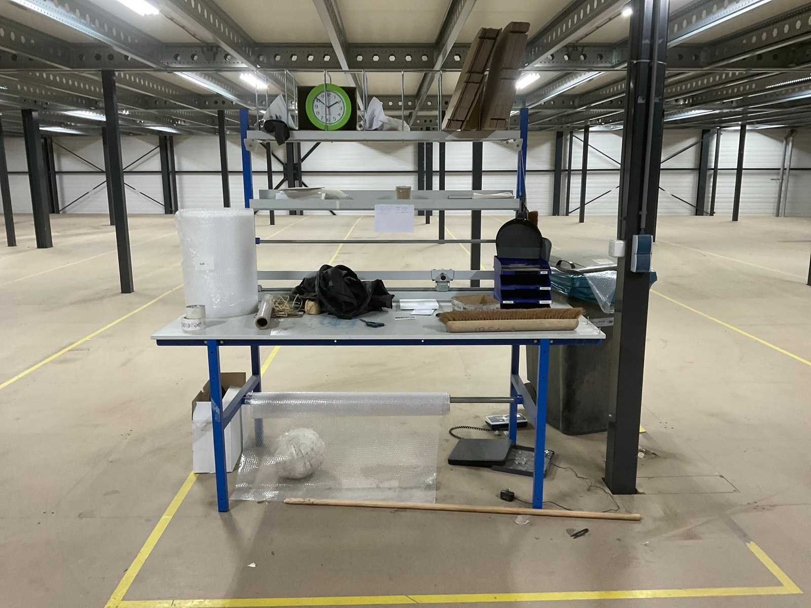 Bestaande uit: (2x) meubeltransportwagens, (2x) pallethefwagens, (10x) secties magazijnstelling 1000x600x2500mm, (1x) Inpaktafel met in houd, (1x) pallet vouwkarton (1200x800x620mm), (2x) meubelwagens met karton. Locatie: 1e etage Entresolvloer, lift aanwezig.