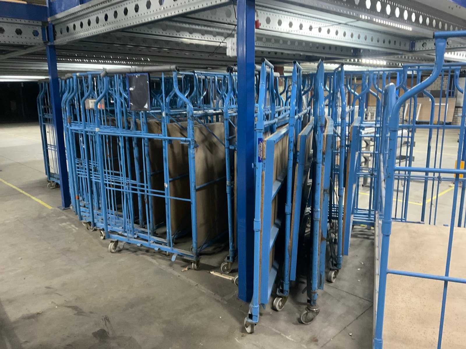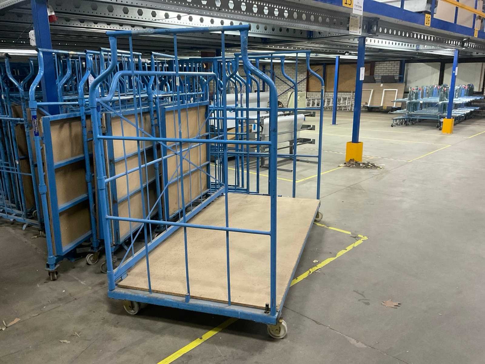 Bodem hout, Stapelbaar, Nestbaar. Voorzien van: zwenkwielen, plaatwerk, 1 kar met constructie en niet inklapbaar, 2x 230 cm breed. Afmeting l: 118cm Afmeting b: 113cm Afmeting h: 180cm
