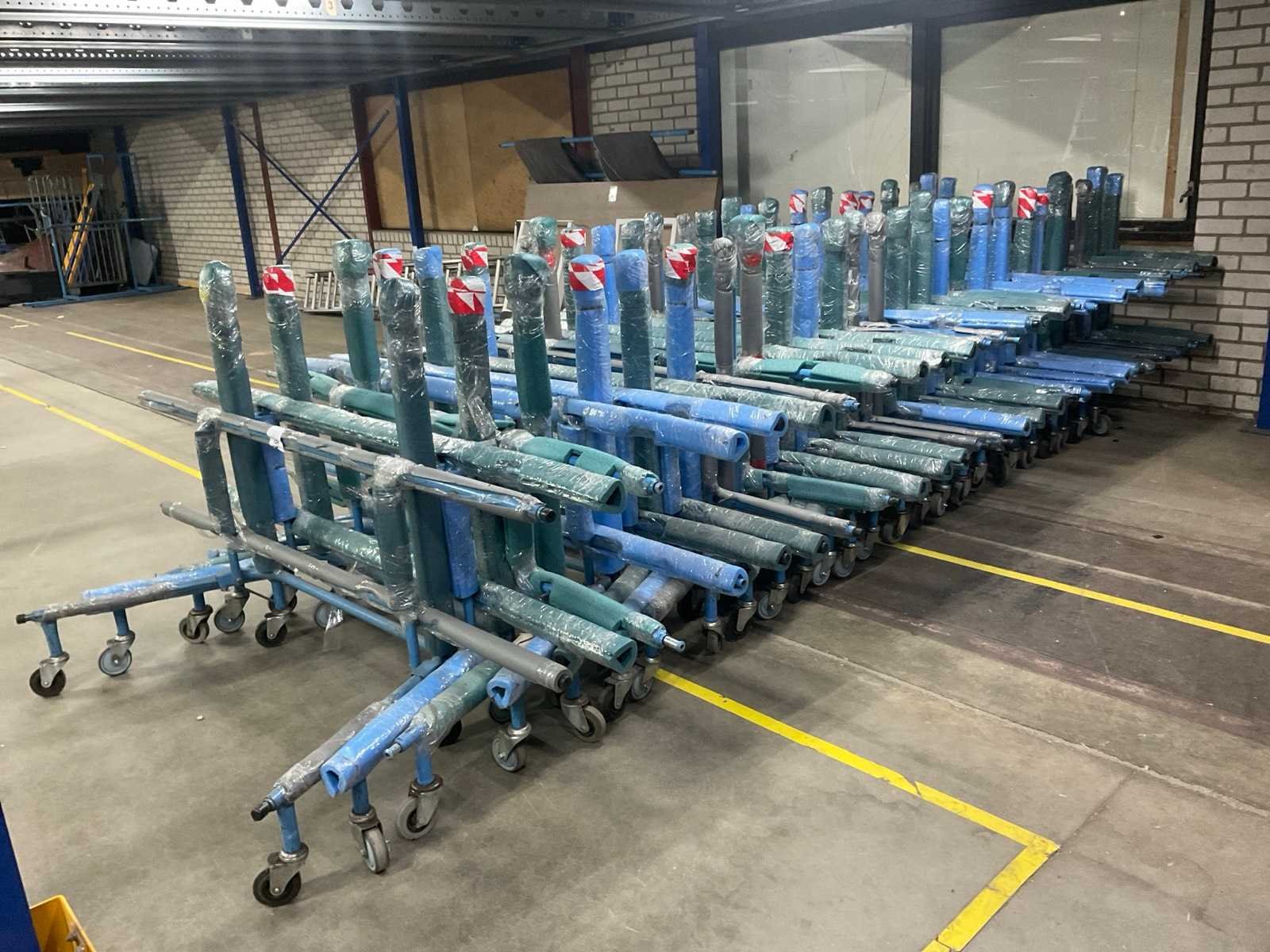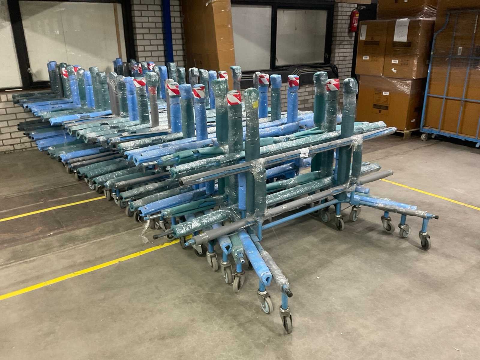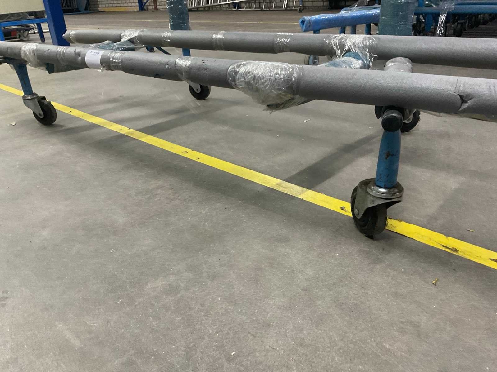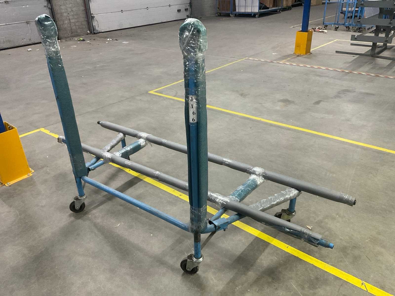 Materiaal: Buisstalen frame, Kleur: Blauw. Voorzien van: uitschuifbare stangen, zwenkwielen. Afmeting l: 200cm Afmeting b: 65cm Afmeting h: 120cm