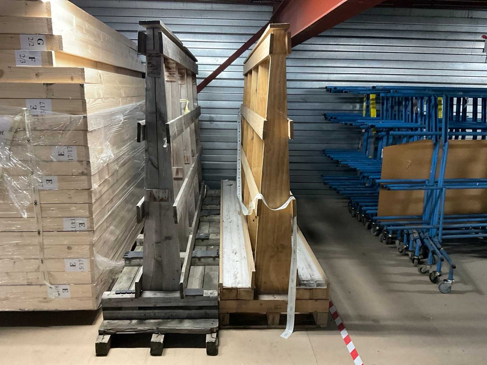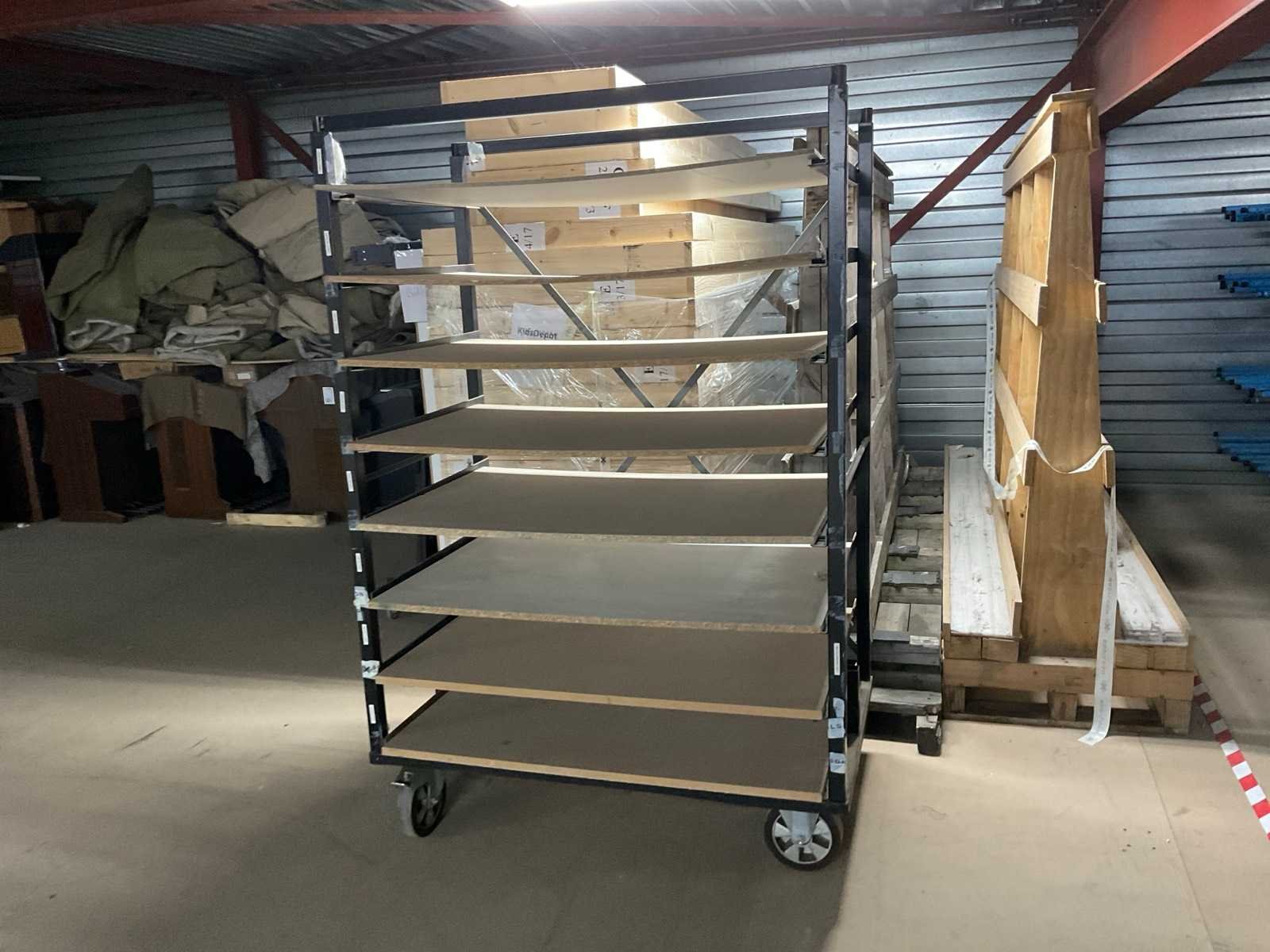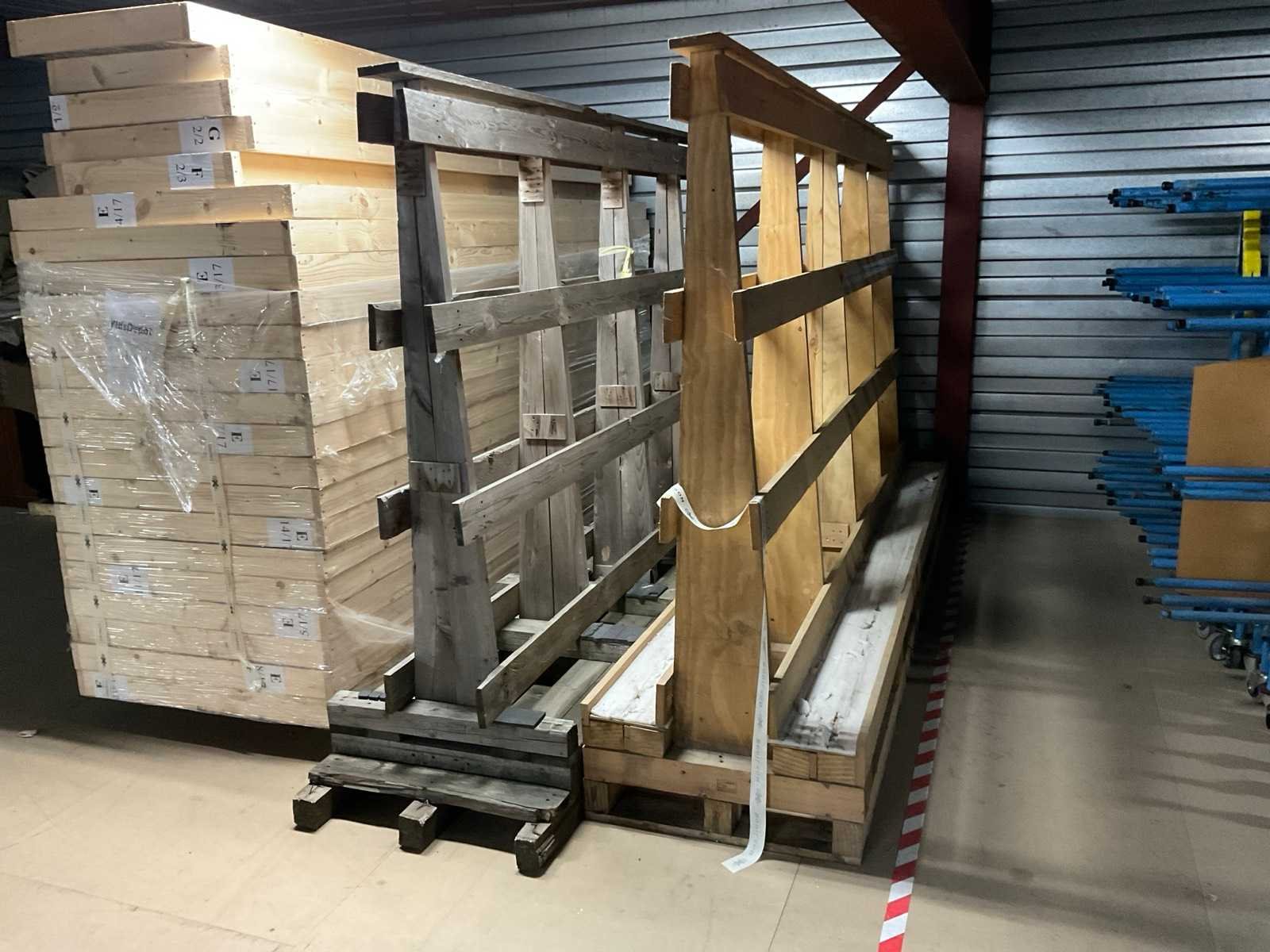 Bestaande uit: 10x L-frame 220x116x183 cm, 18x L-frame 140x64x173 cm, 16x 2-etage meubelwagen, 1x etage Magazijnwagen, 2x juk lengte circa 300 cm en hoogte 200 cm., 22x houten frame.