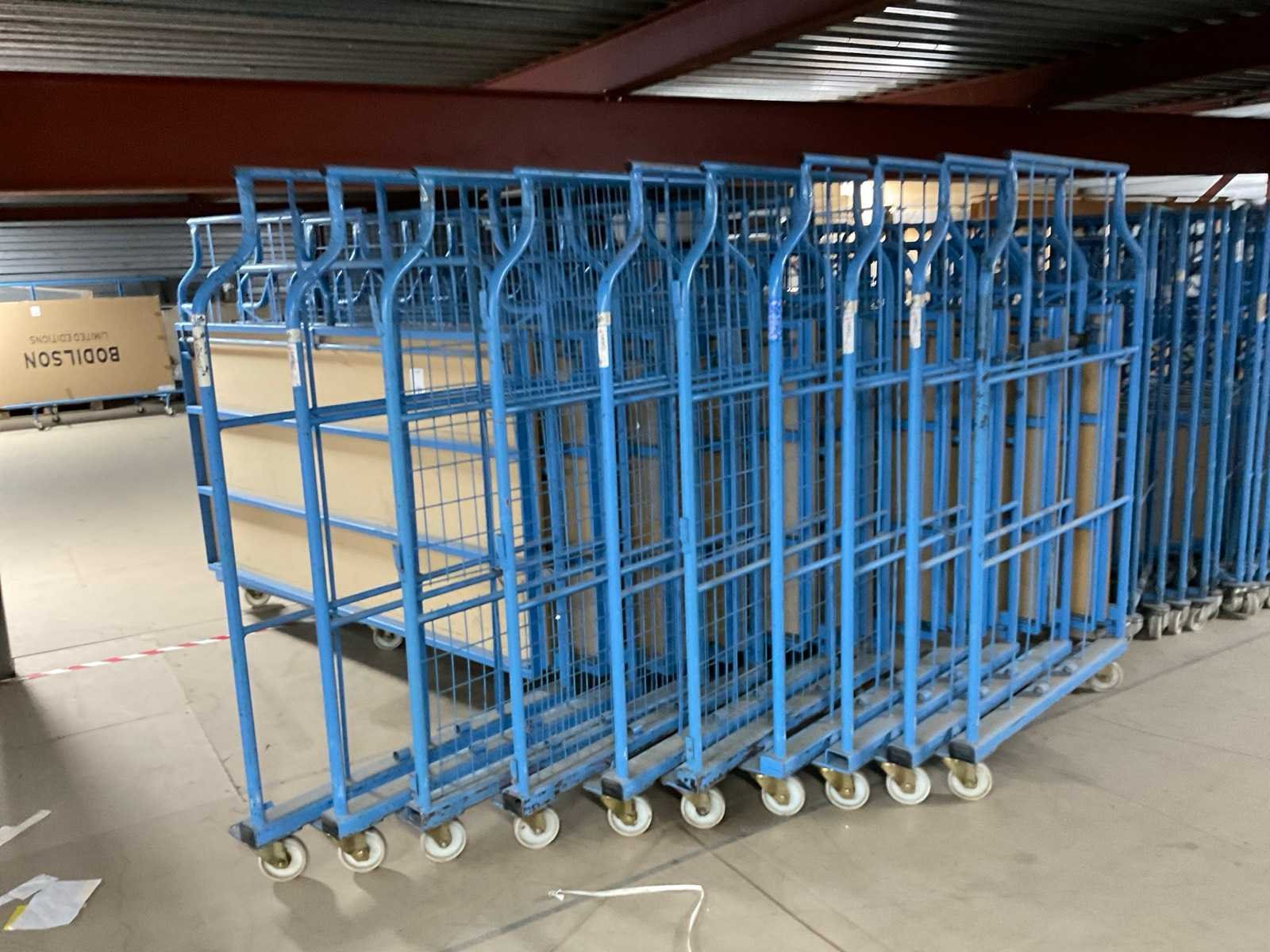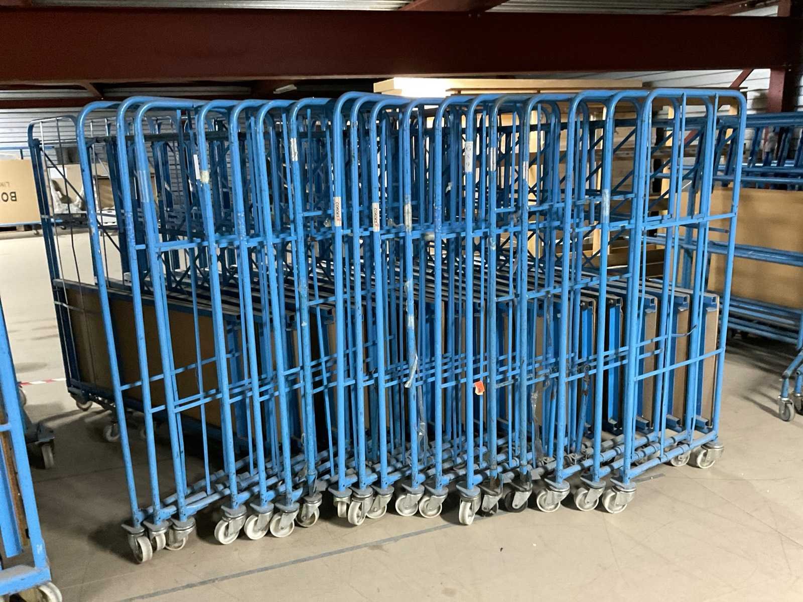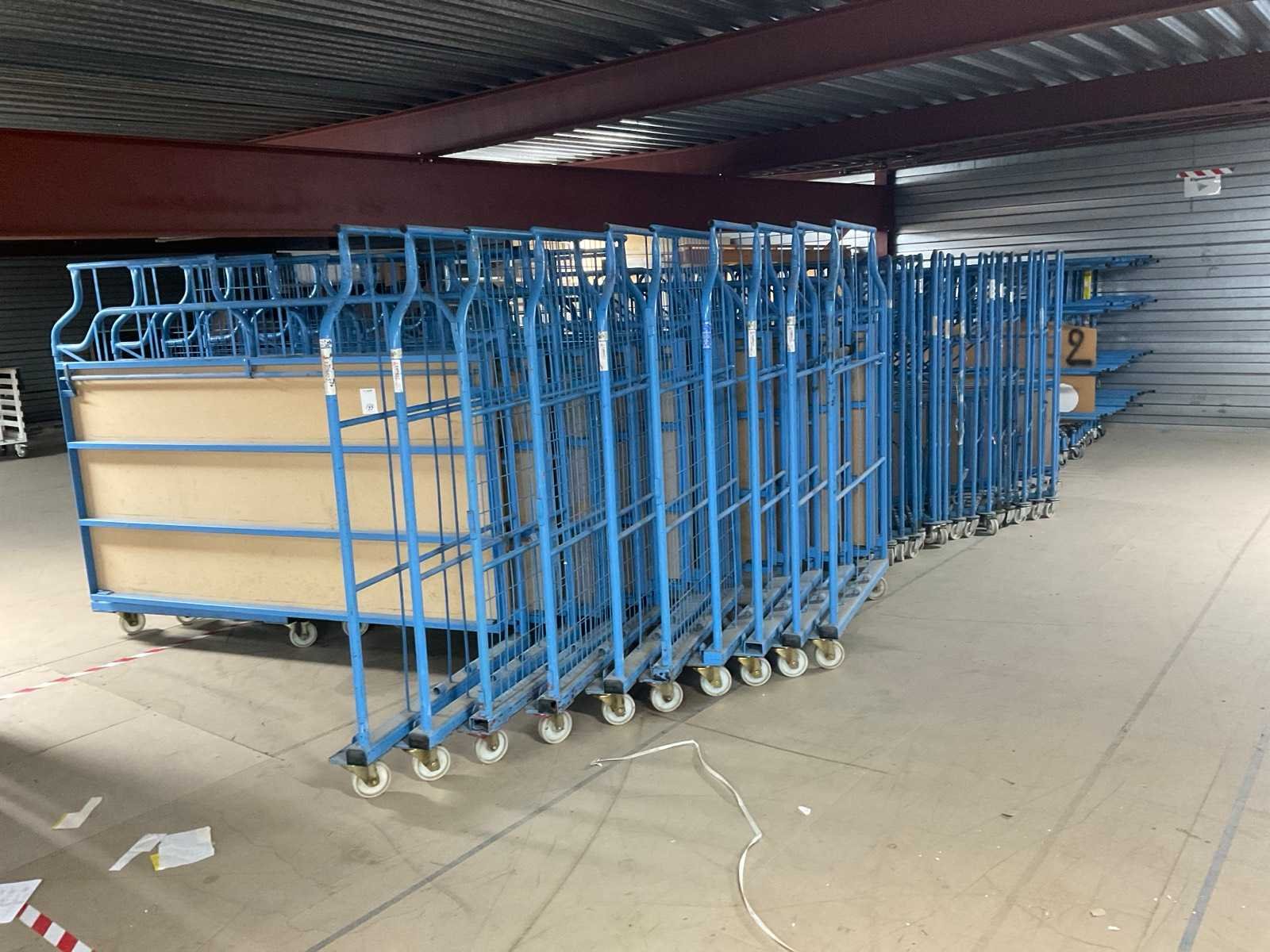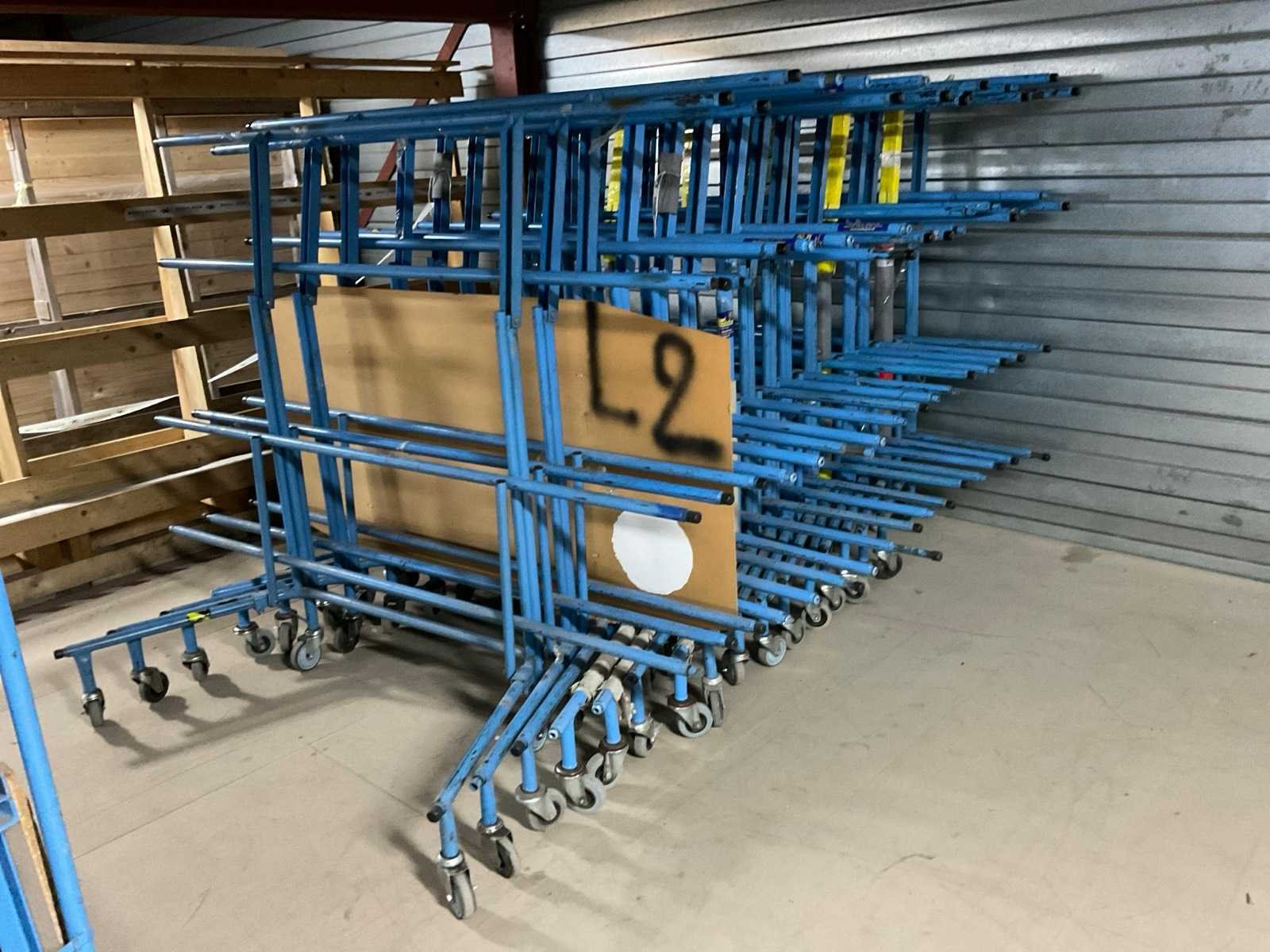 Bestaande uit: 10x L-frame 220x116x183 cm, 18x L-frame 140x64x173 cm, 16x 2-etage meubelwagen, 1x etage Magazijnwagen, 2x juk lengte circa 300 cm en hoogte 200 cm., 22x houten frame.