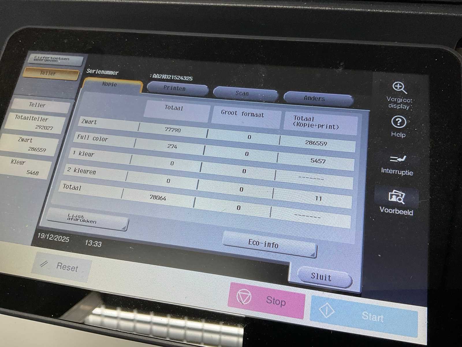 Tellerstand: 292000, Printsnelheid: 21-30 pagina’s per minuut. Voorzien van: 10” Kleurendisplay, Automatische documenteninvoer. Merk: Konica Minolta Type: Bizhub Model: C300i Kleur: Zwart / Wit Lengte: 70cm Breedte: 65cm Hoogte: 115cm