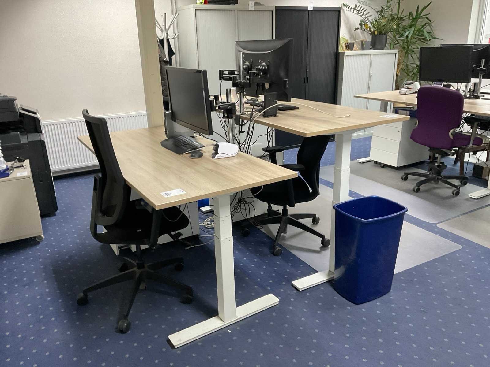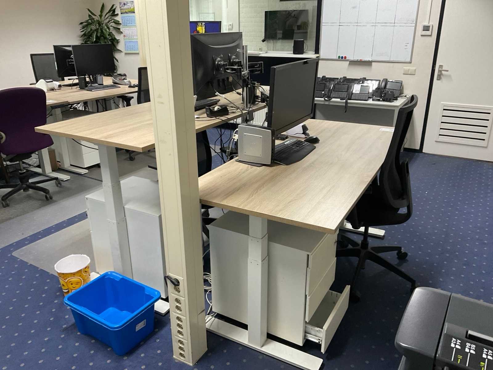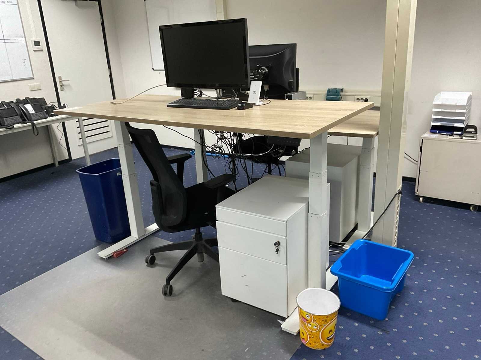 Bestaande uit: (1×) elektrisch in hoogte verstelbaar bureau (180x80 cm) (1×) mobiele bureaustoel (1×) mobiel ladenblok met inhoud. (2×) Iiyama monitoren, 27 inch Prullenbak