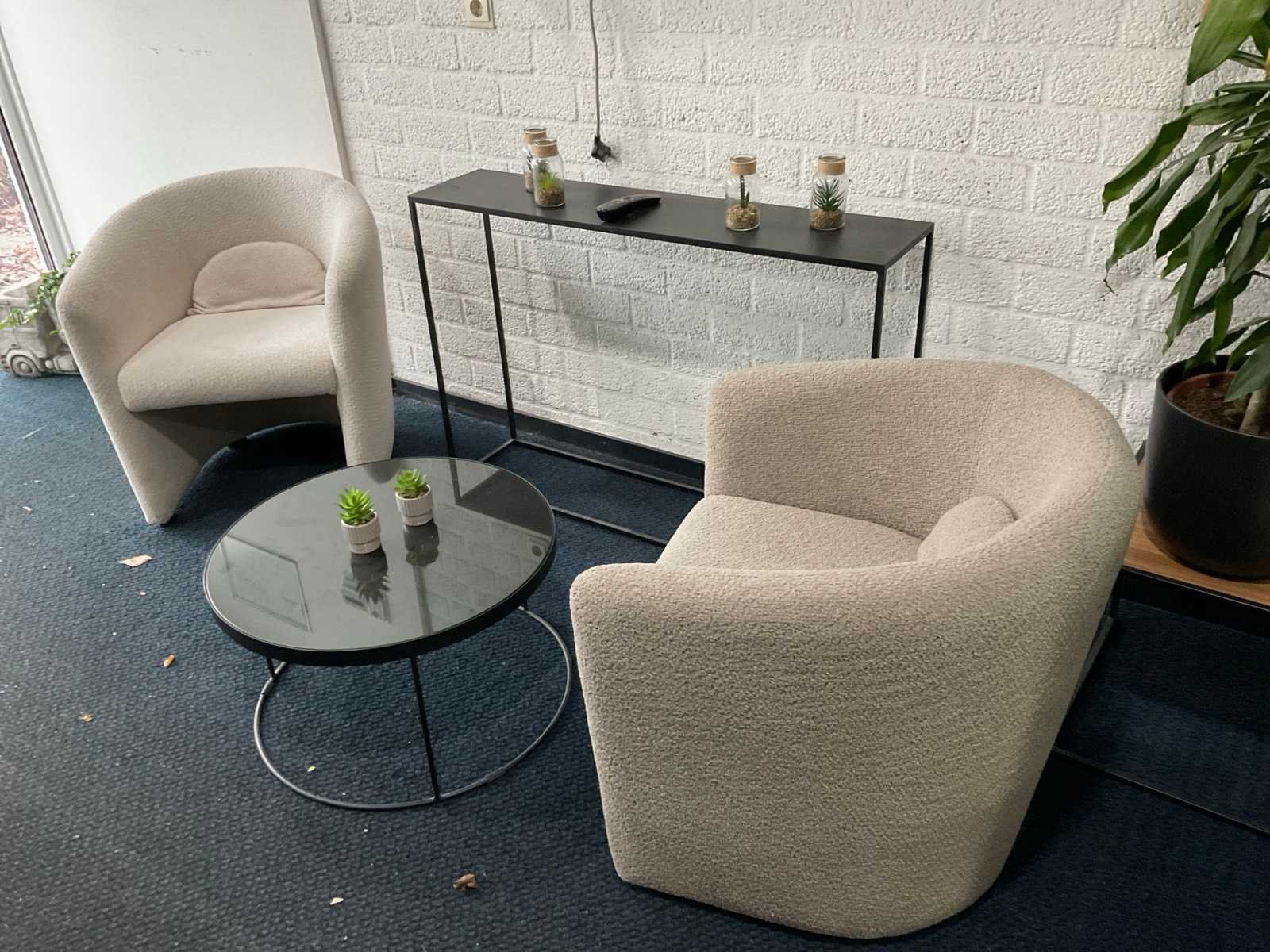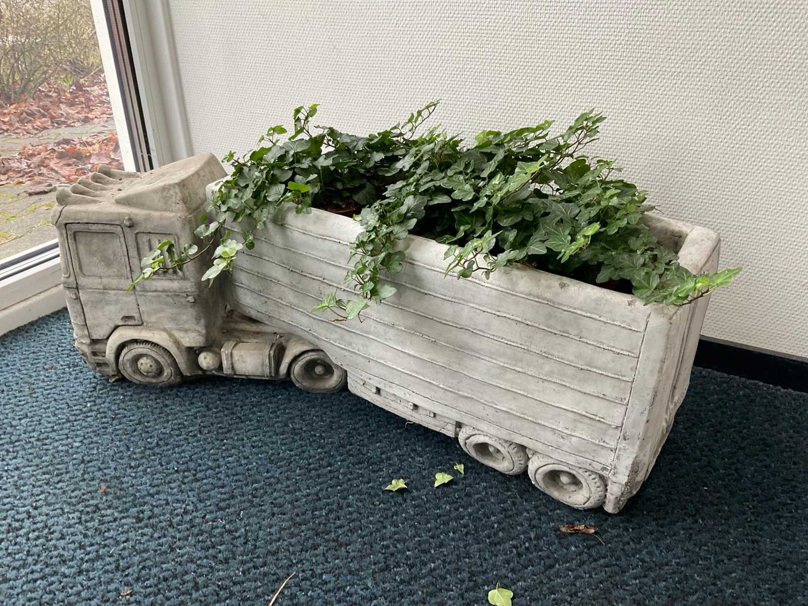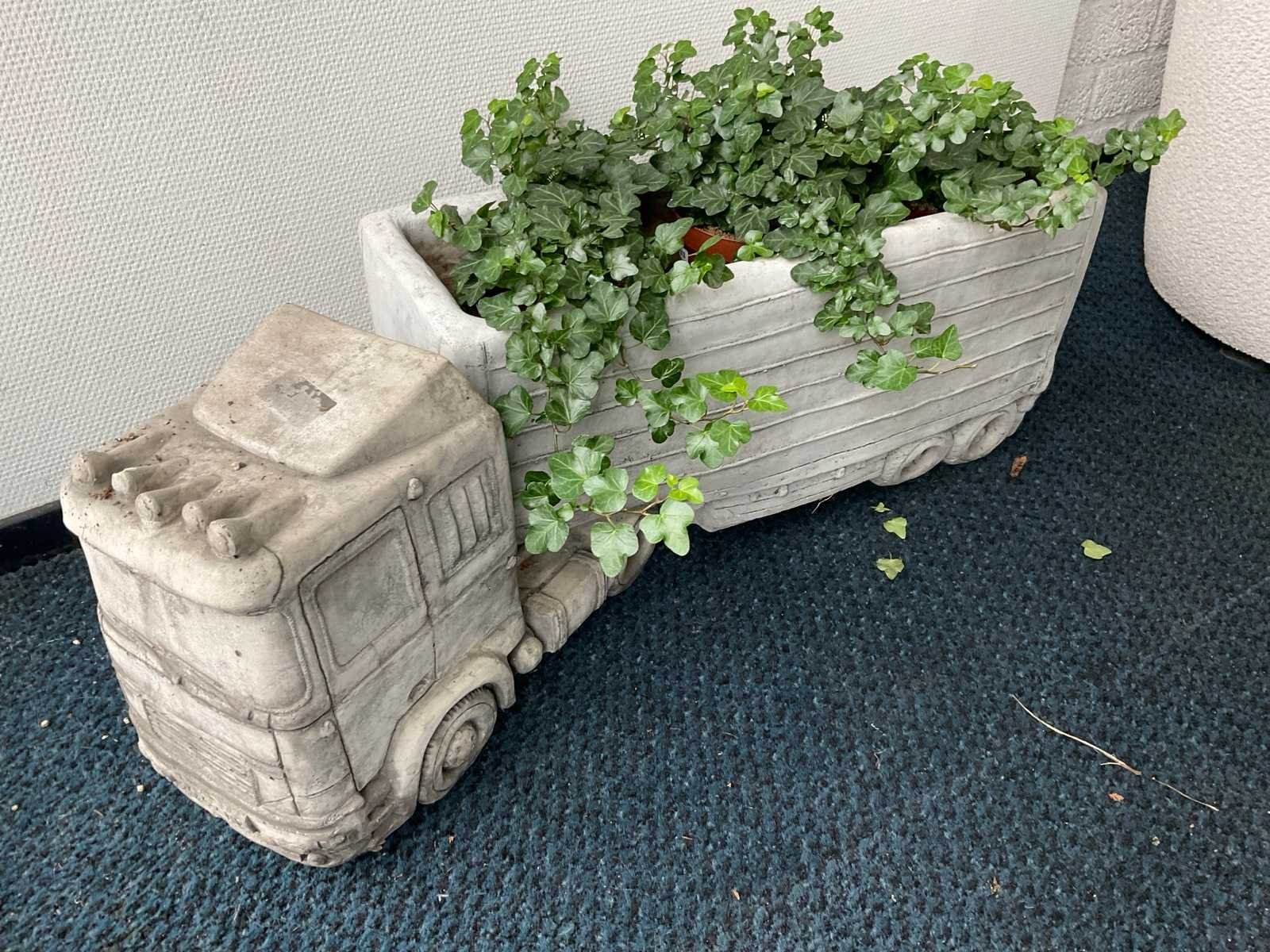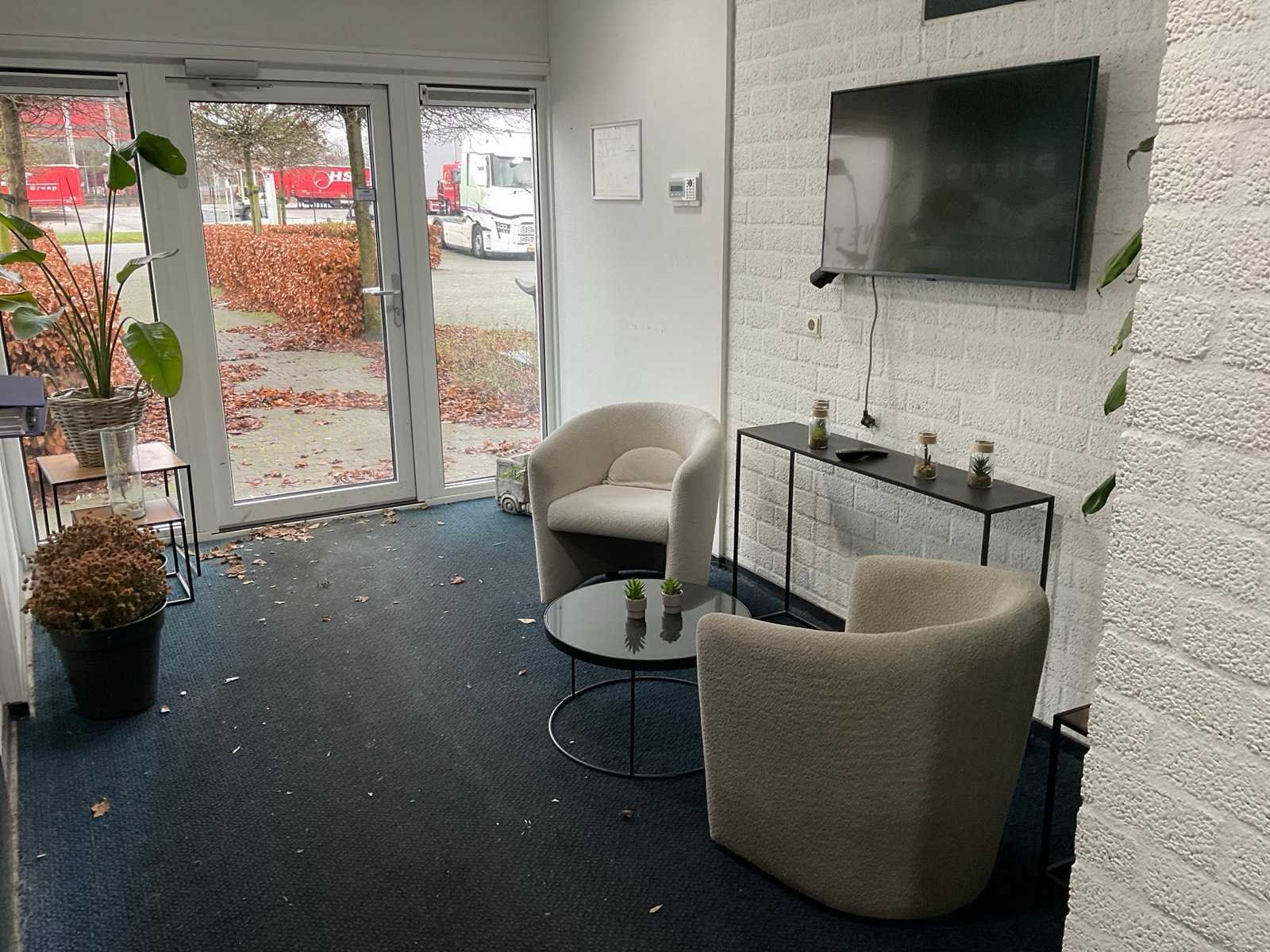 Bestaande uit: 2 fauteuil, 2 tafels, planten, 2 bijzettafels, vrachtwagen plantenbak, LG scherm (diagonaal 110 cm).