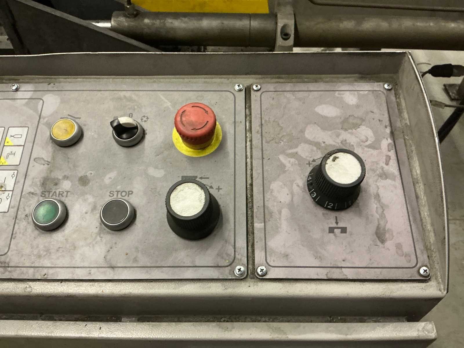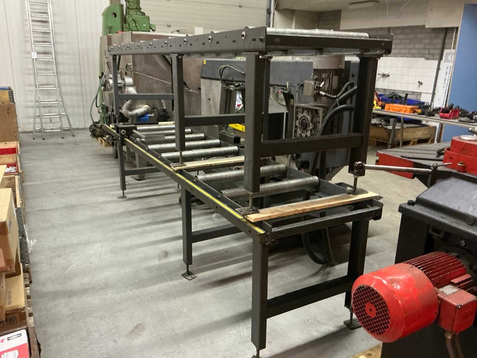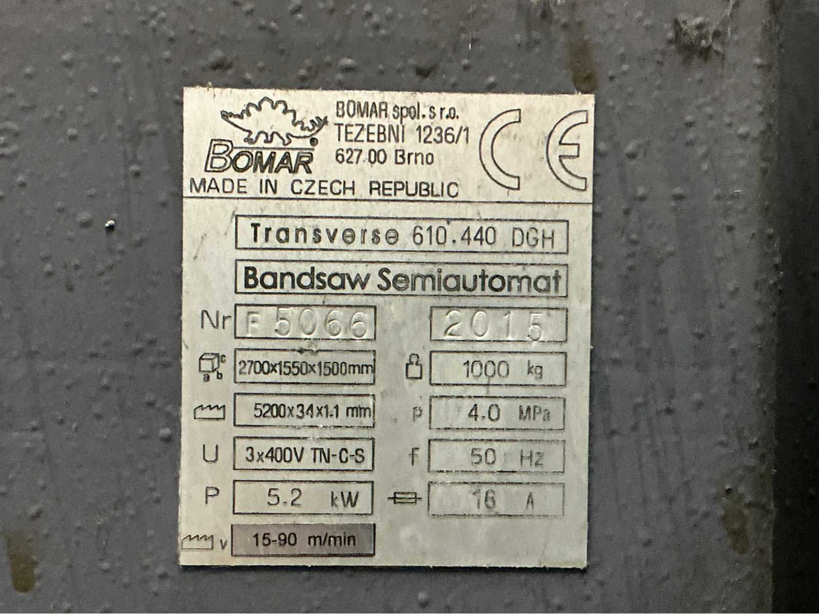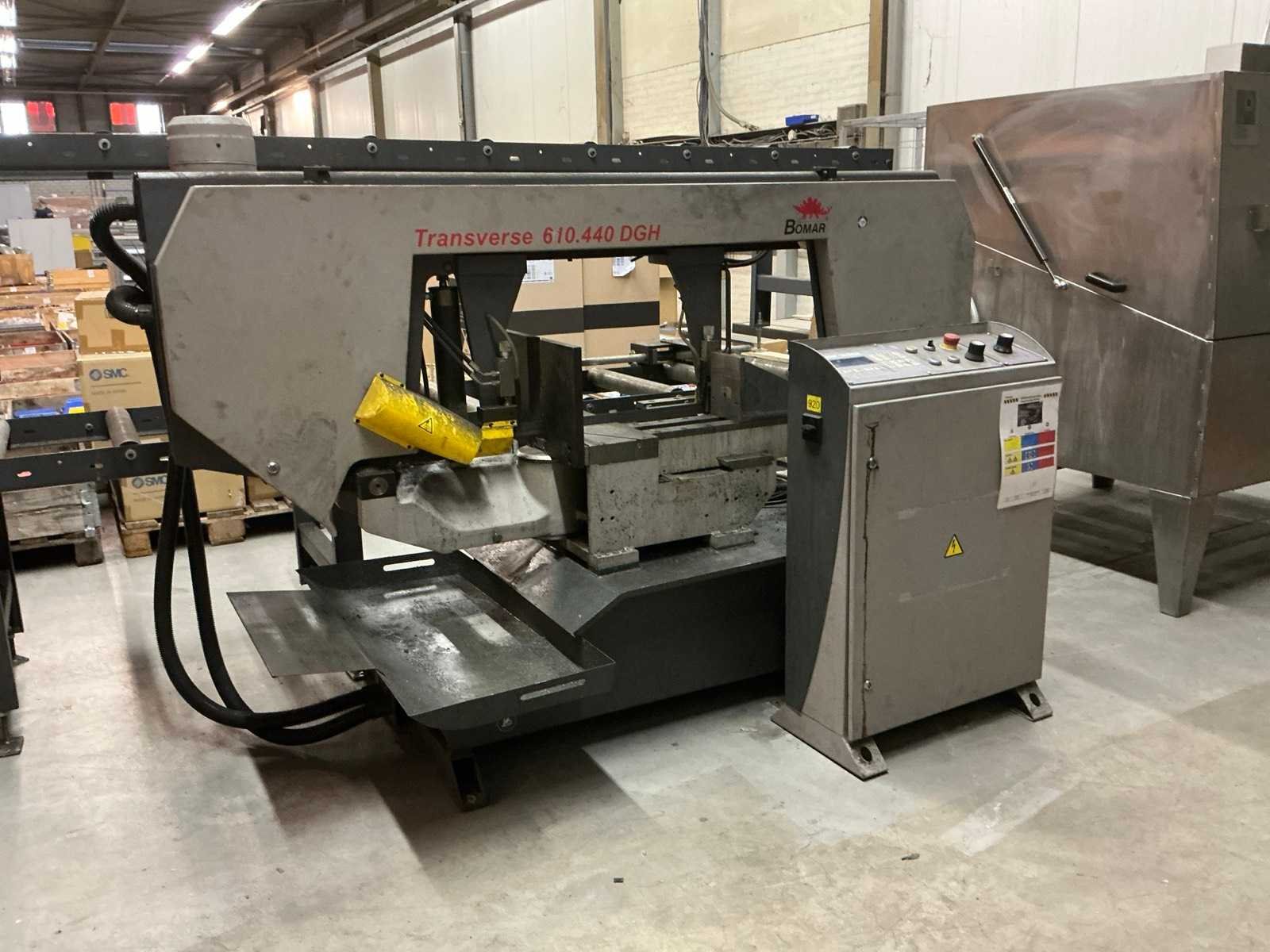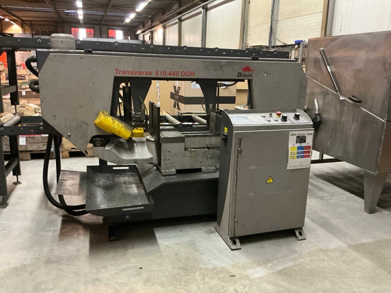 Hydraulische werkstukklem; met 2x rollenbaan 3000x720x790 mm; waarvan 1x rollenbaan met meetaanslag Merk: Bomar Type: Transverse 610.440 DGH Bouwjaar: 2015 Serienummer: F5066 Max. werkstukhoogte: 440mm Werkbreedte: 610mm Zaagblad afm. l: 5200mm Zaagblad afm. b: 34mm Zaagbladdikte: 1.1mm Motorvermogen (kW): 5.2kW Aansluiting: 400V Machinegewicht: 1000kg Afmeting l: 2700mm Afmeting b: 1550mm Afmeting h: 1500mm