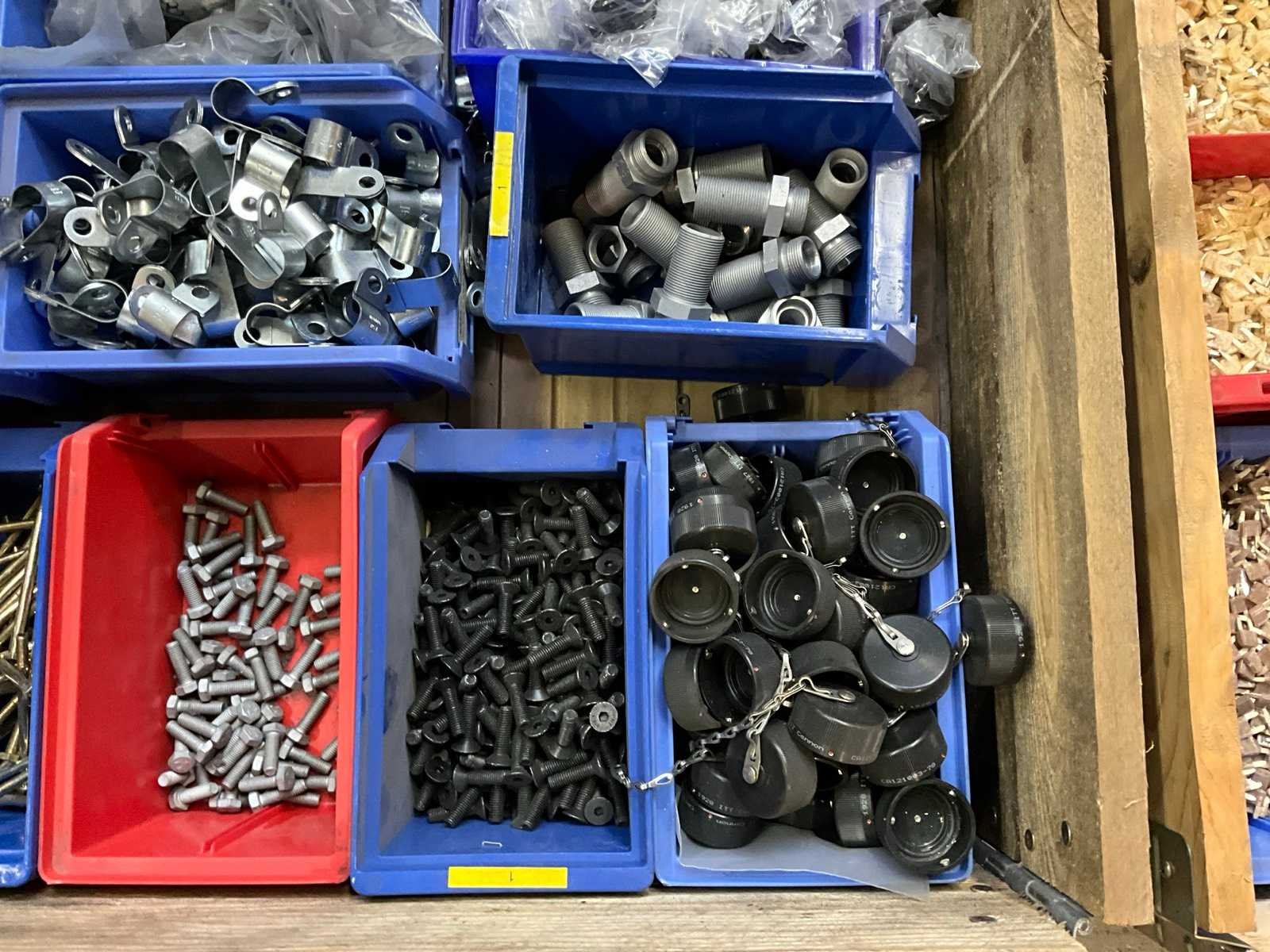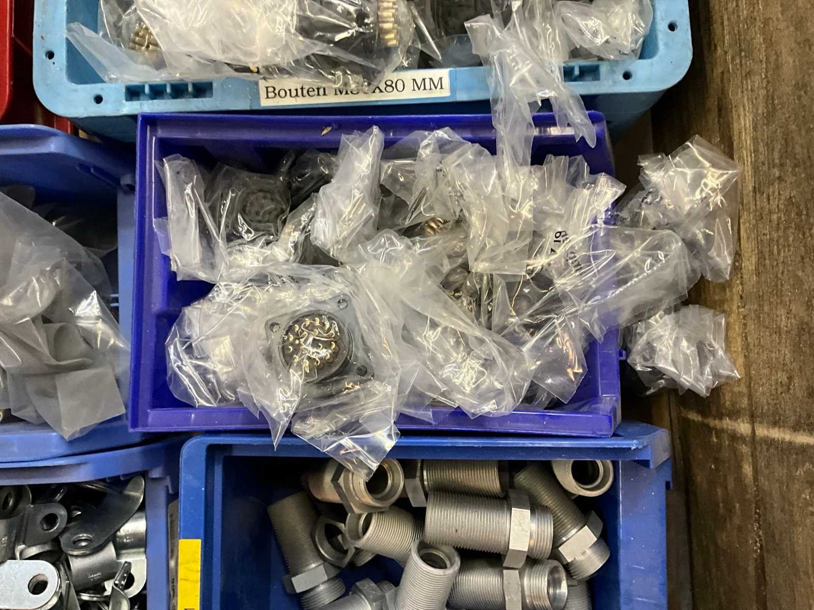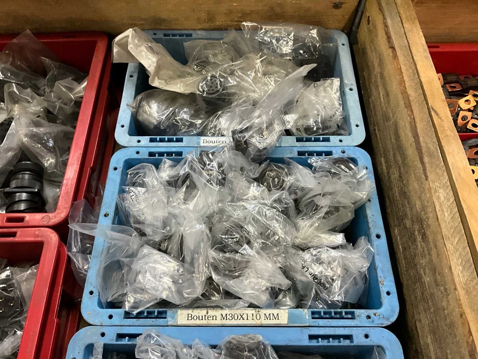 Bestaande uit 16x kunststof magazijnbak met divers bevestigingsmateriaal, connectoren etc