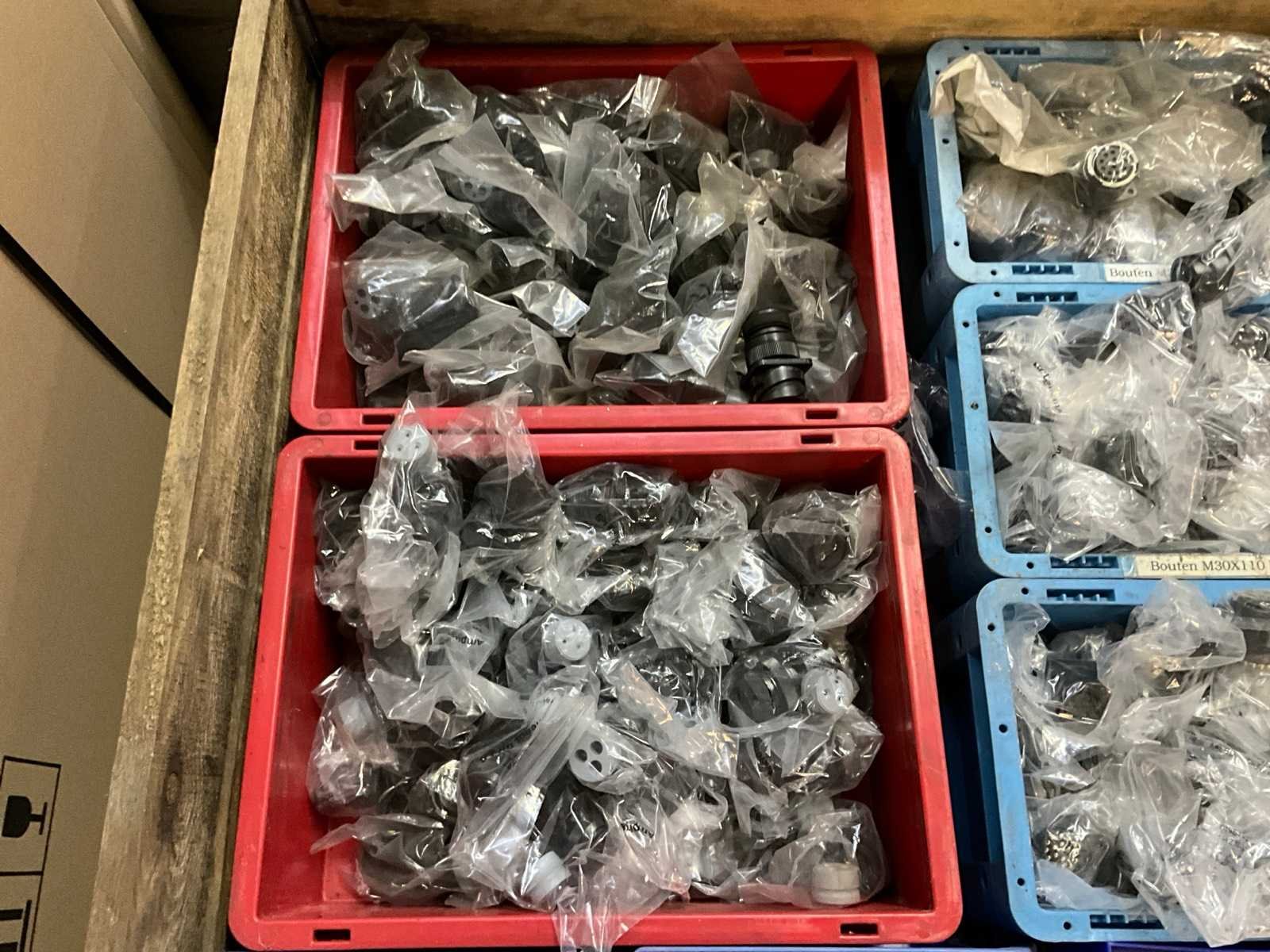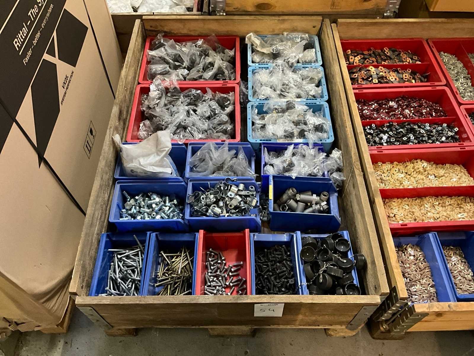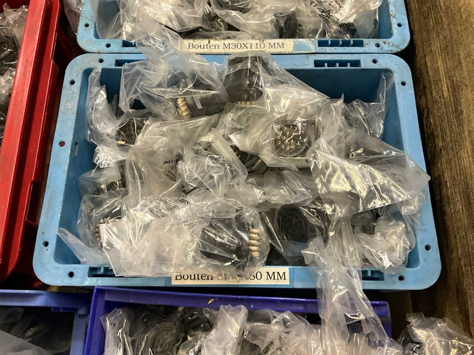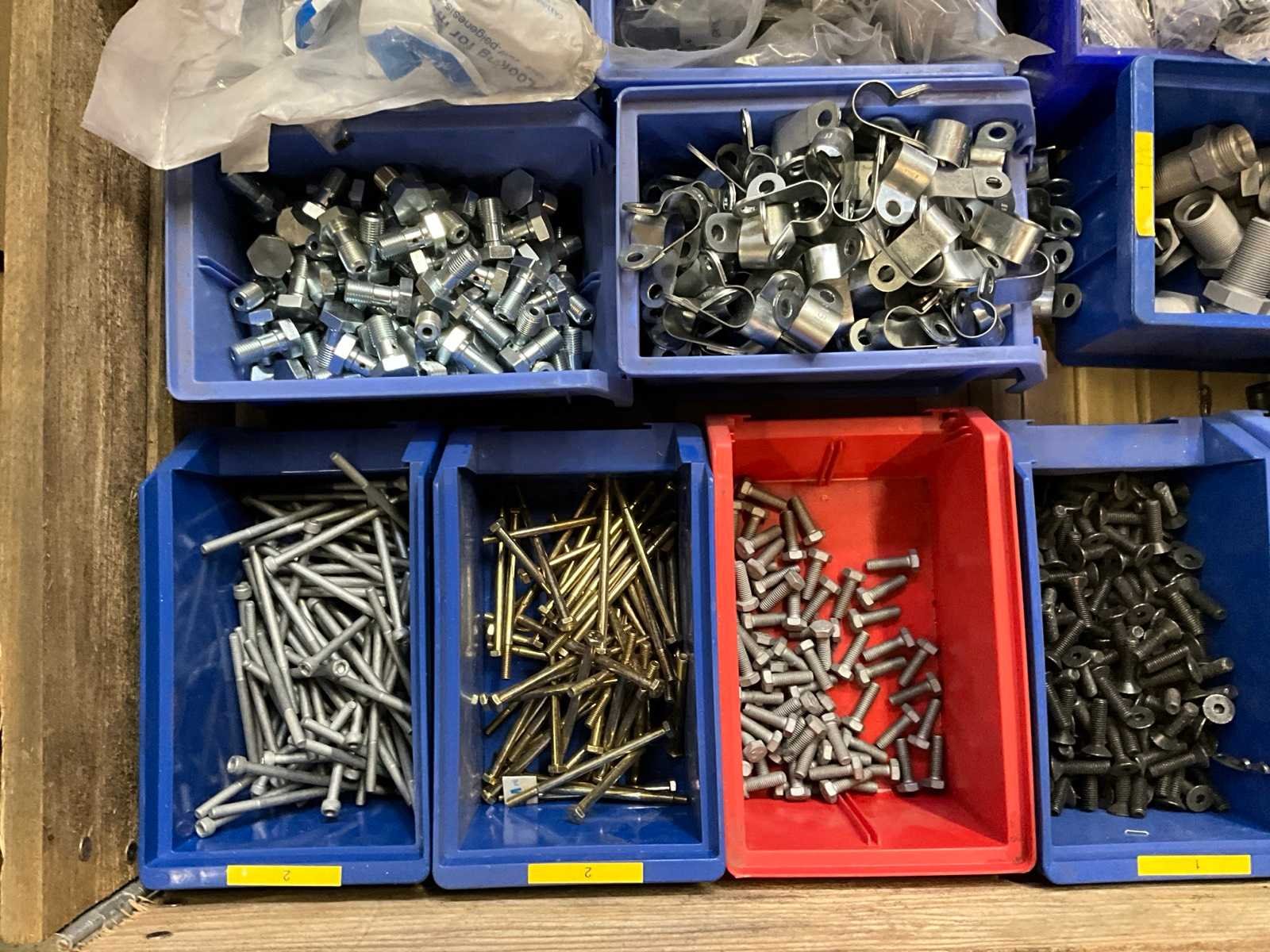 Bestaande uit 16x kunststof magazijnbak met divers bevestigingsmateriaal, connectoren etc