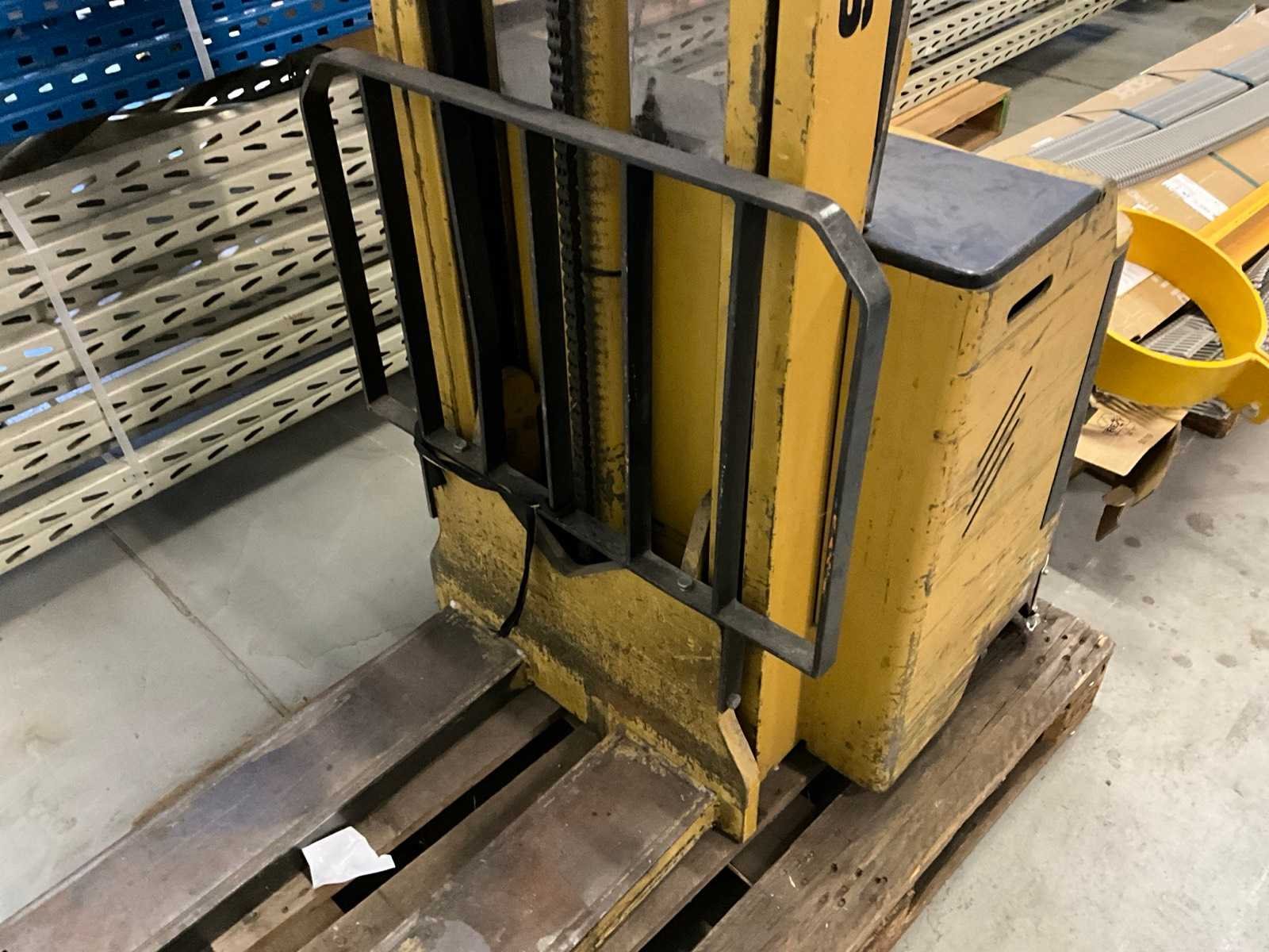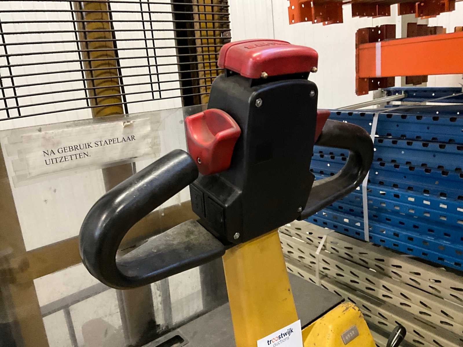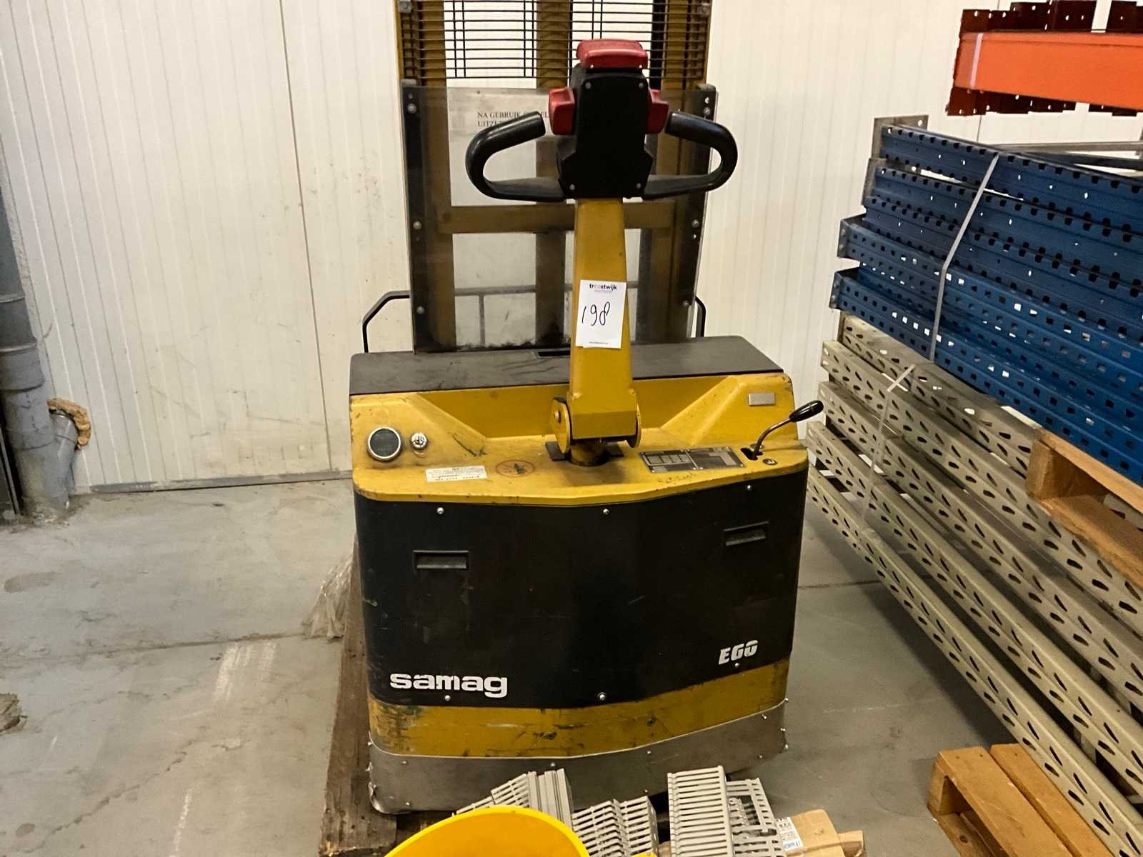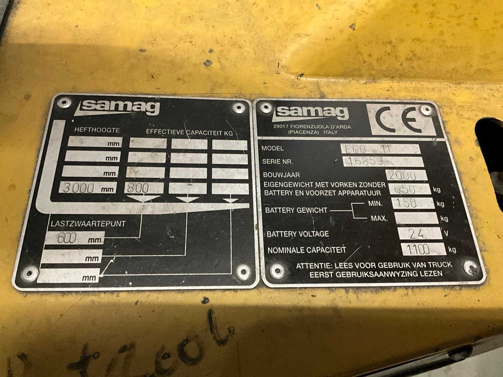 Zonder lader, accu leeg/defect Merk: Samag Type: EGO 11 Serienummer: 16859 Hefvermogen: 1100kg Hefhoogte: 2900mm Lepellengte: 1100mm Minimale doorrijhoogte: 2000mm Totale afmeting L: 1850mm Totale afmeting Breedte: 840mm Totale afmeting Hoogte: 2000mm