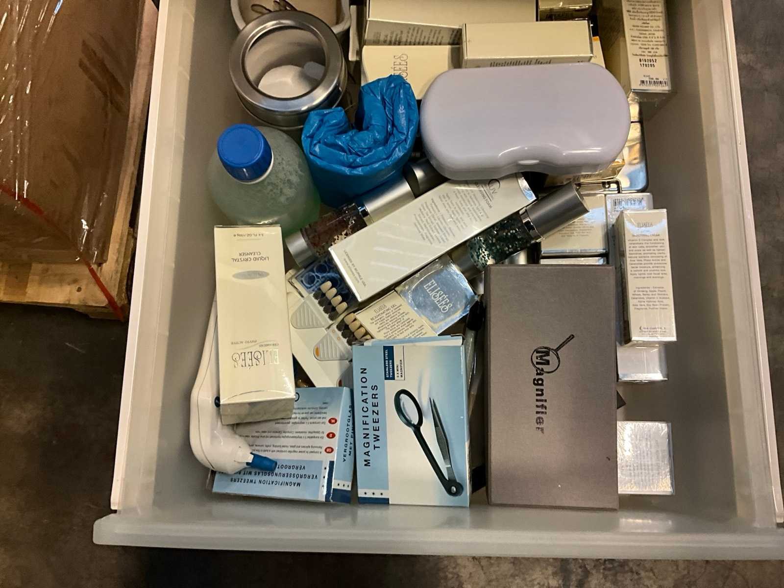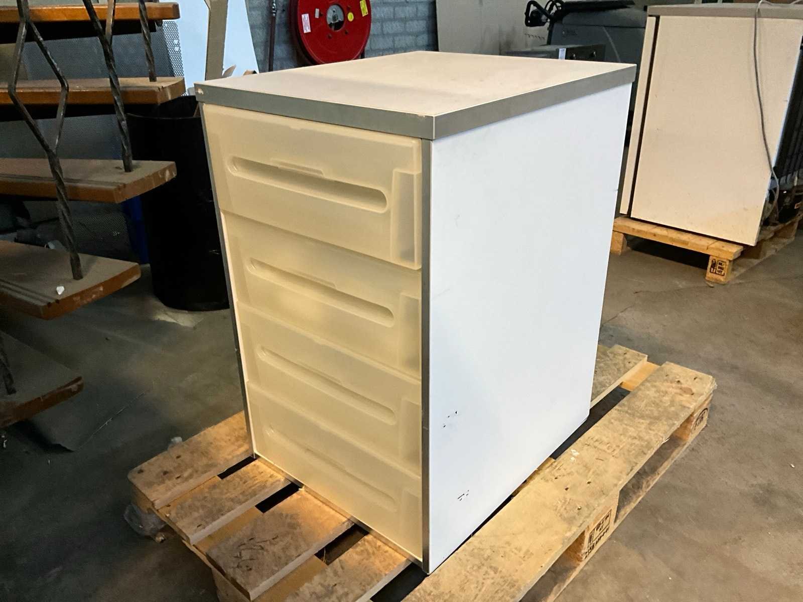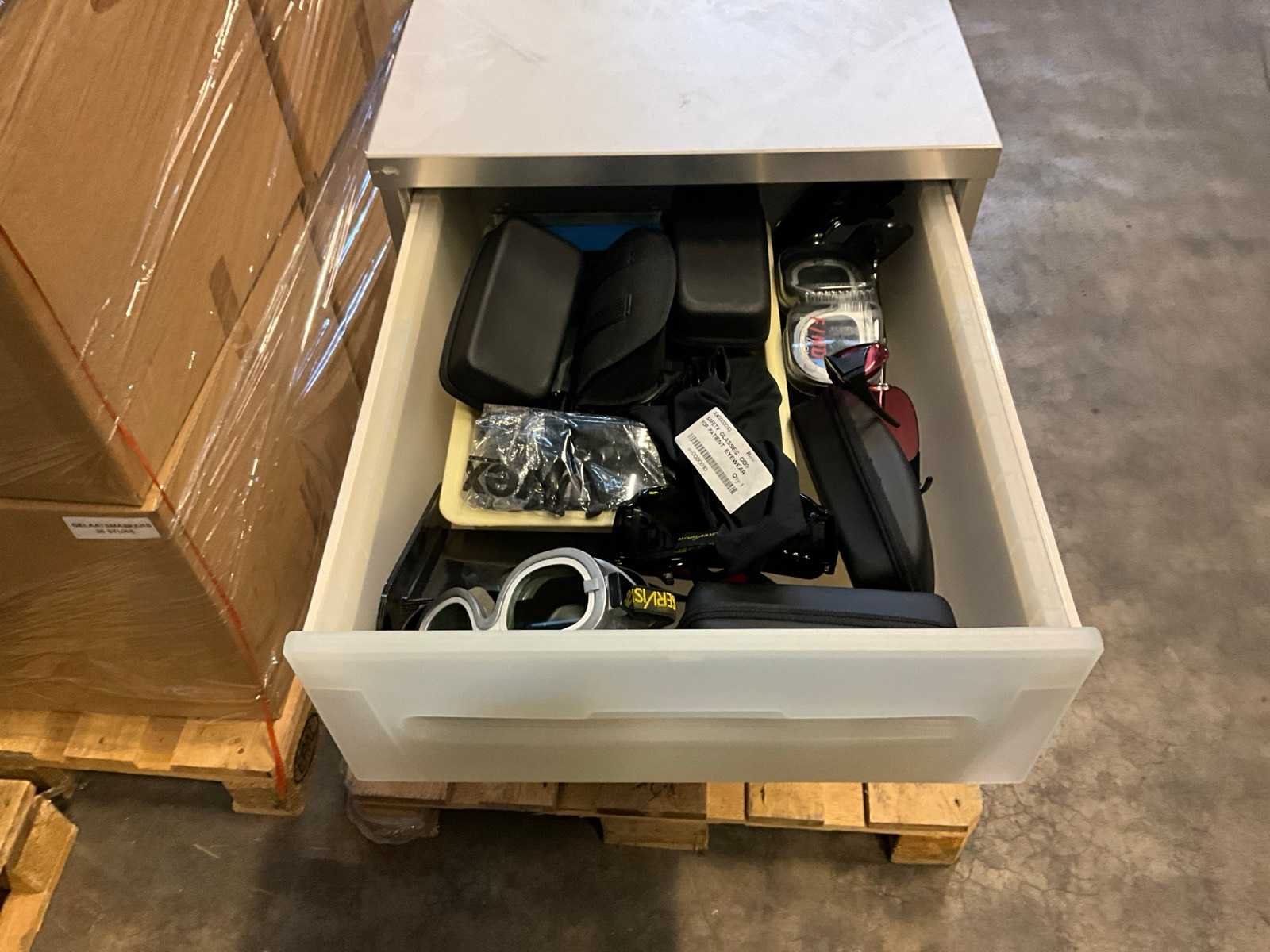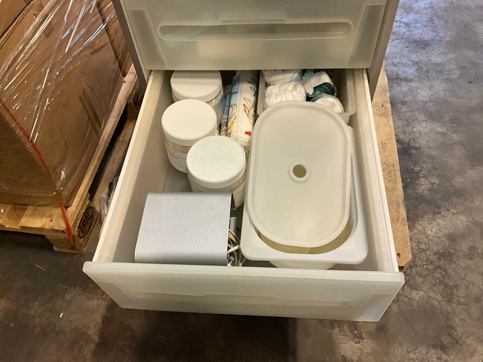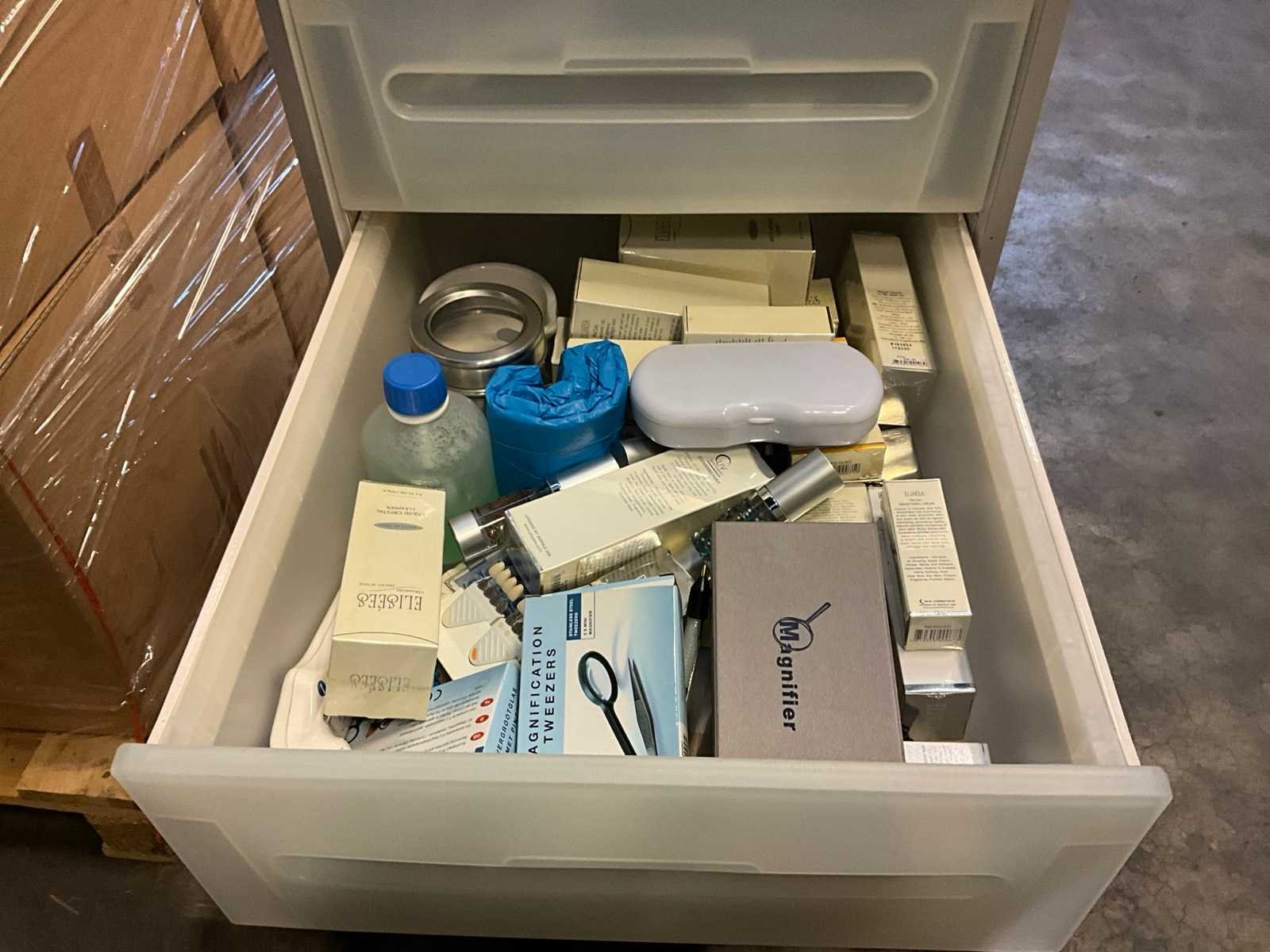 4x laden met inhoud, bestaande uit; oog bescherming, cosmetica, watten, 4x zwenkwiel Lengte: 60cm Breedte: 51cm Hoogte: 79cm Diepte: 54cm