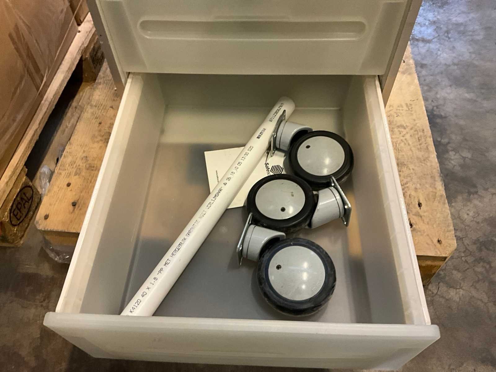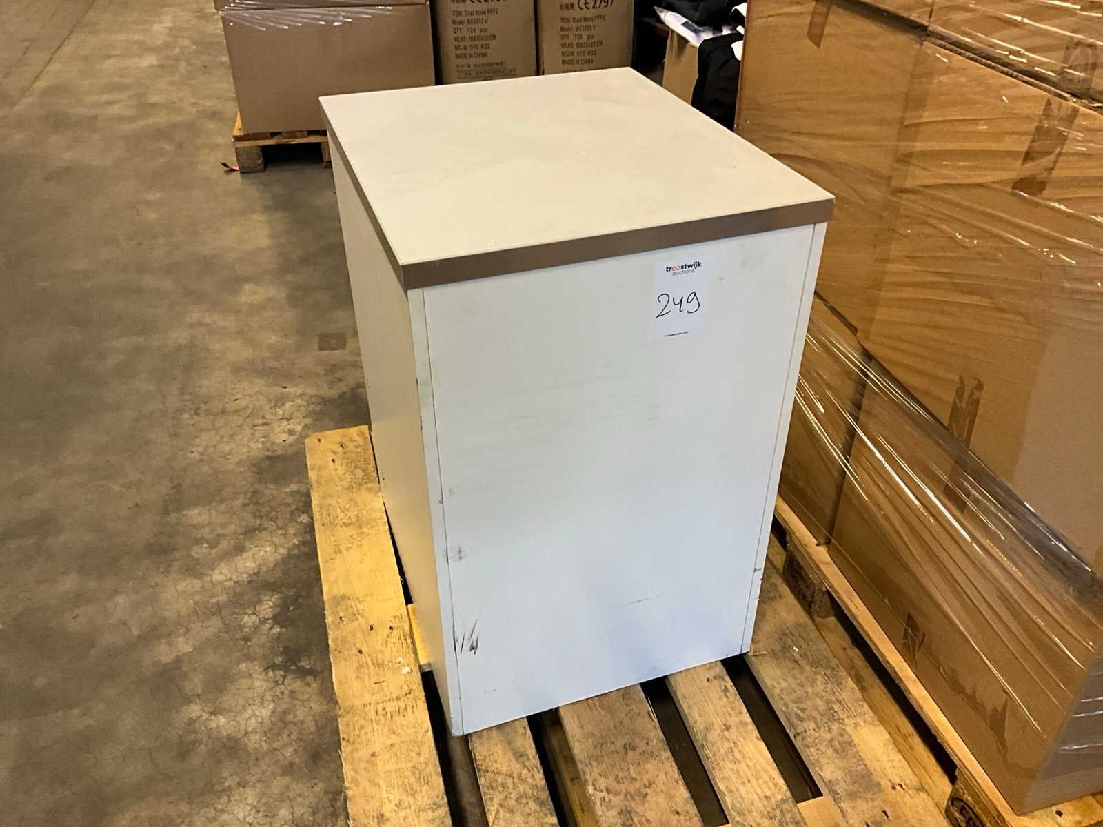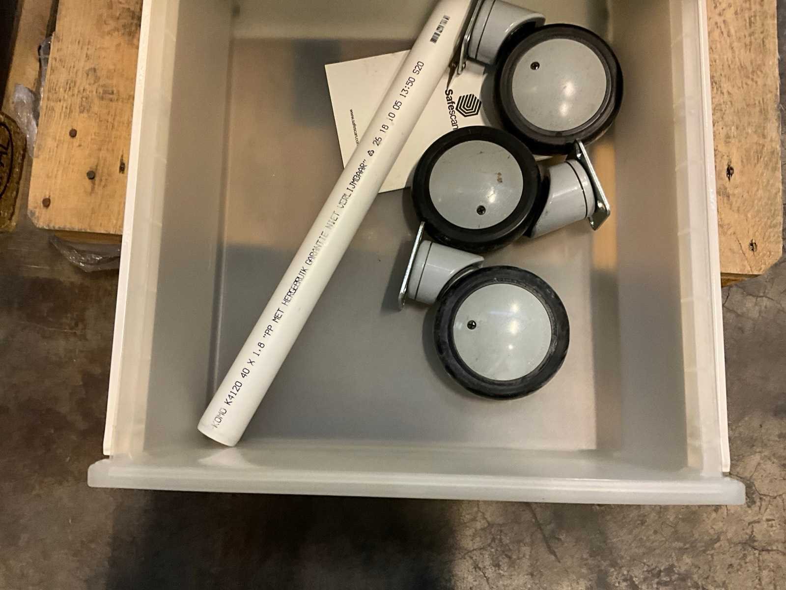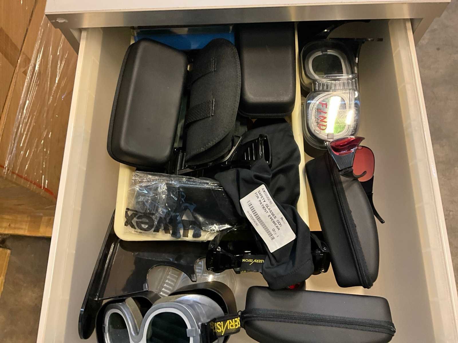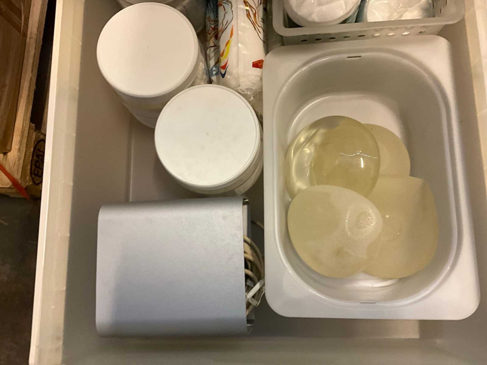 4x laden met inhoud, bestaande uit; oog bescherming, cosmetica, watten, 4x zwenkwiel Lengte: 60cm Breedte: 51cm Hoogte: 79cm Diepte: 54cm