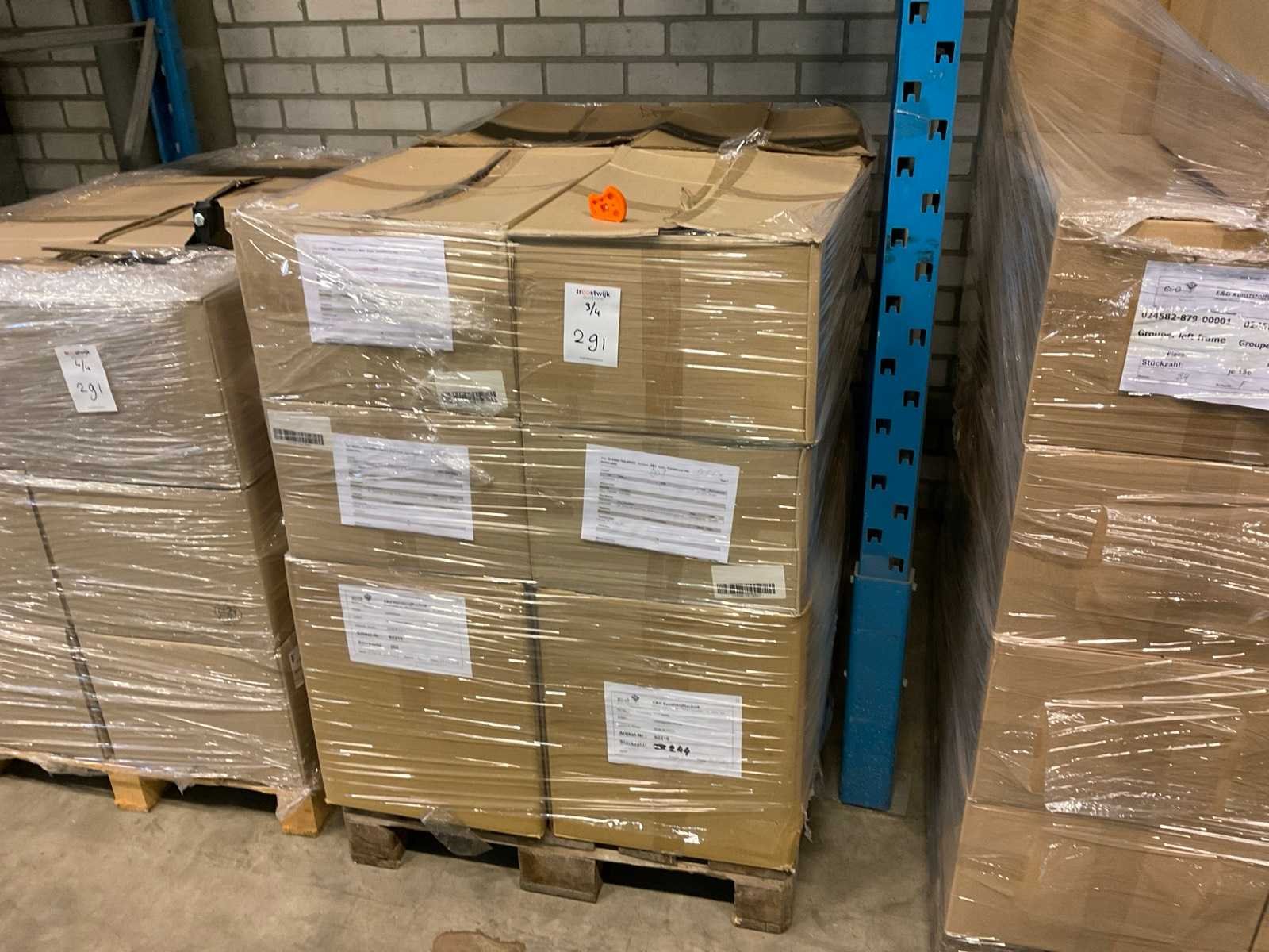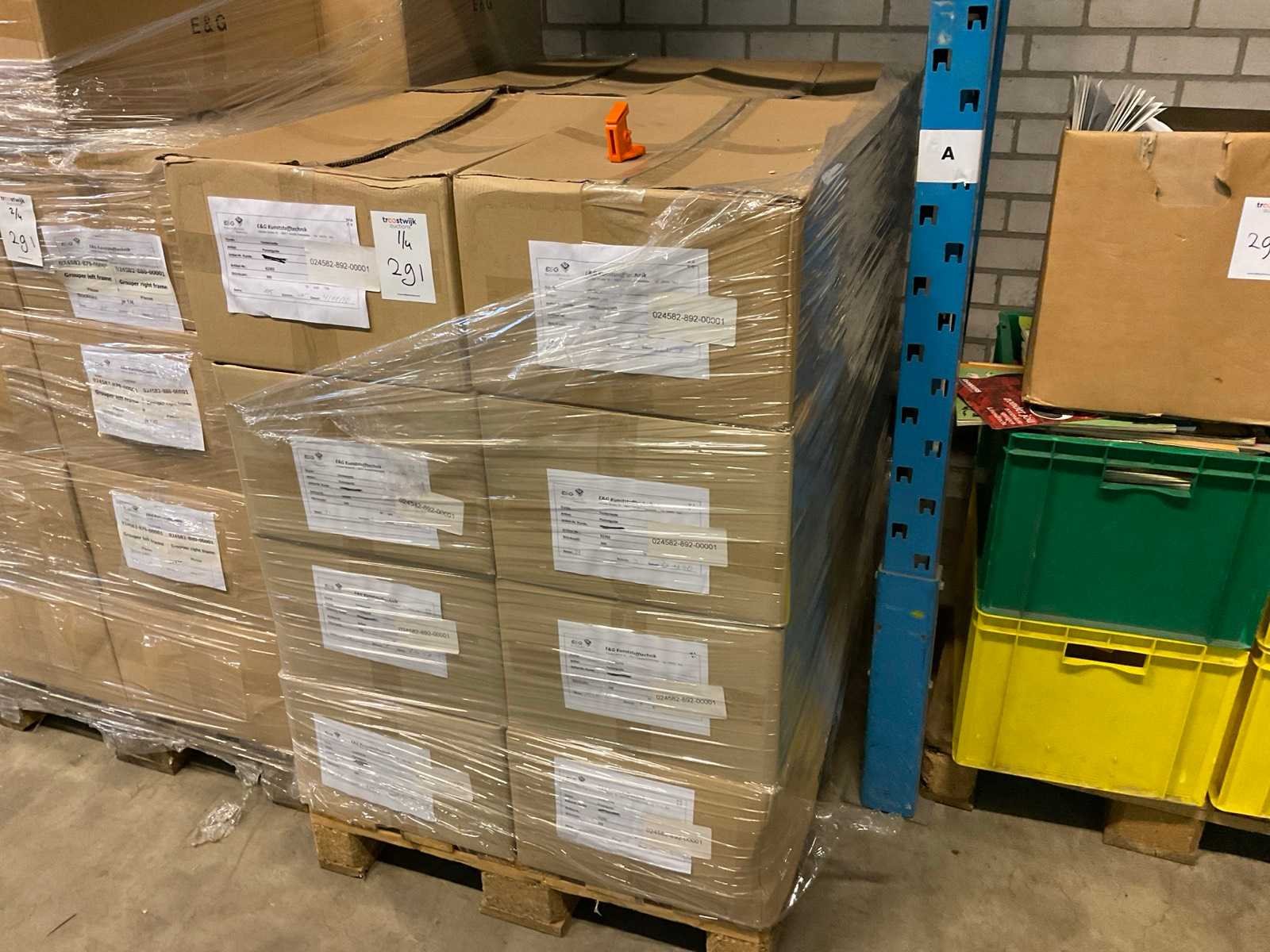 Op 4 euro pallets. Deze dienen geruild te worden. Pallet 1 circa 4500 stuks, pallet 2 circa 2250 stuks, pallet 3 circa 8500 stuks, pallet 4 circa 1500 stuks.