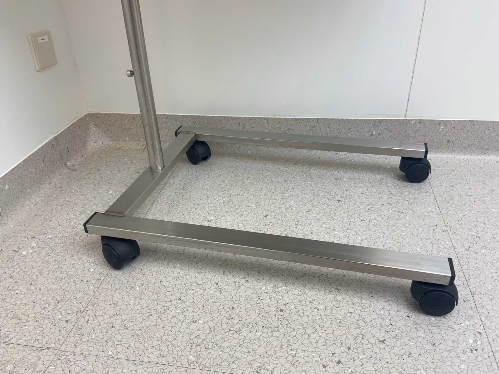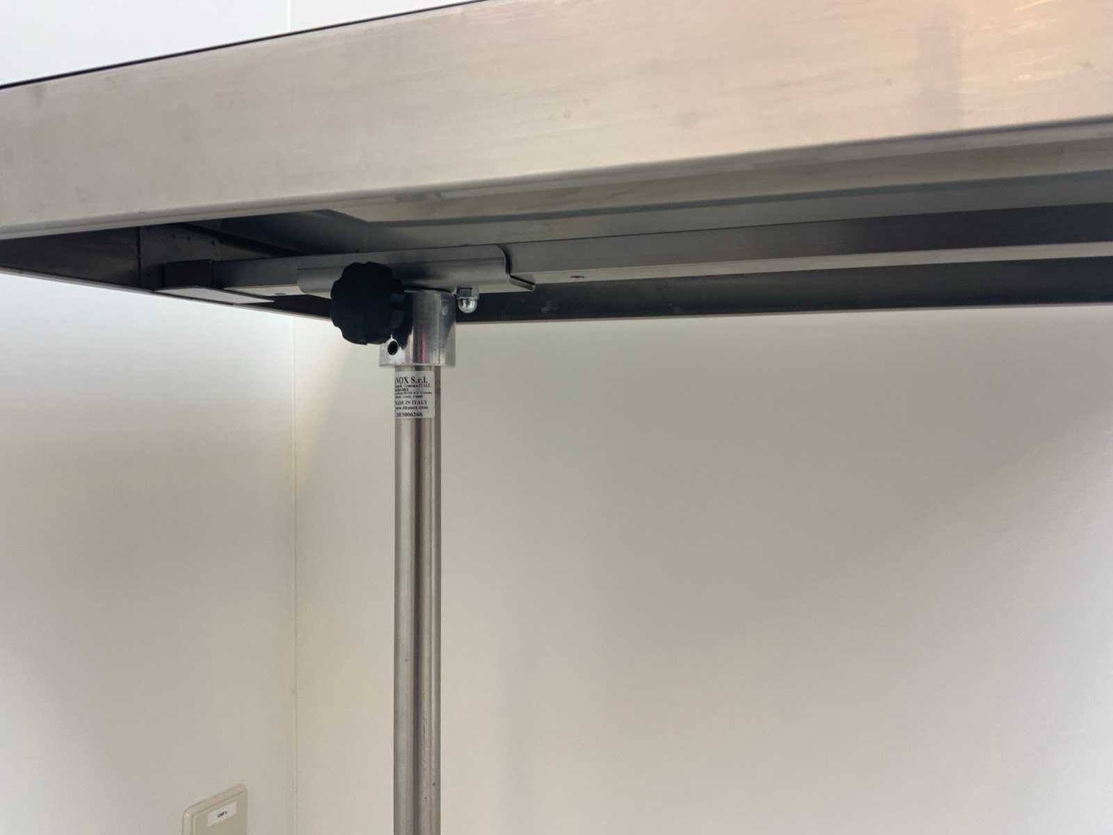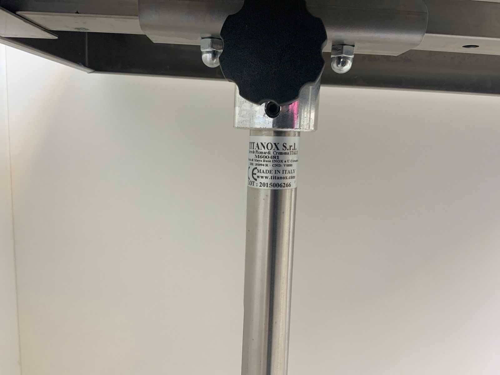 Middels een draaiknop in hoogte verstelbaar. Minimale hoogte 82 cm, maximale hoogte 114 cm. Merk: Titanox Lengte: 73cm Breedte: 48cm Materiaal: Rvs