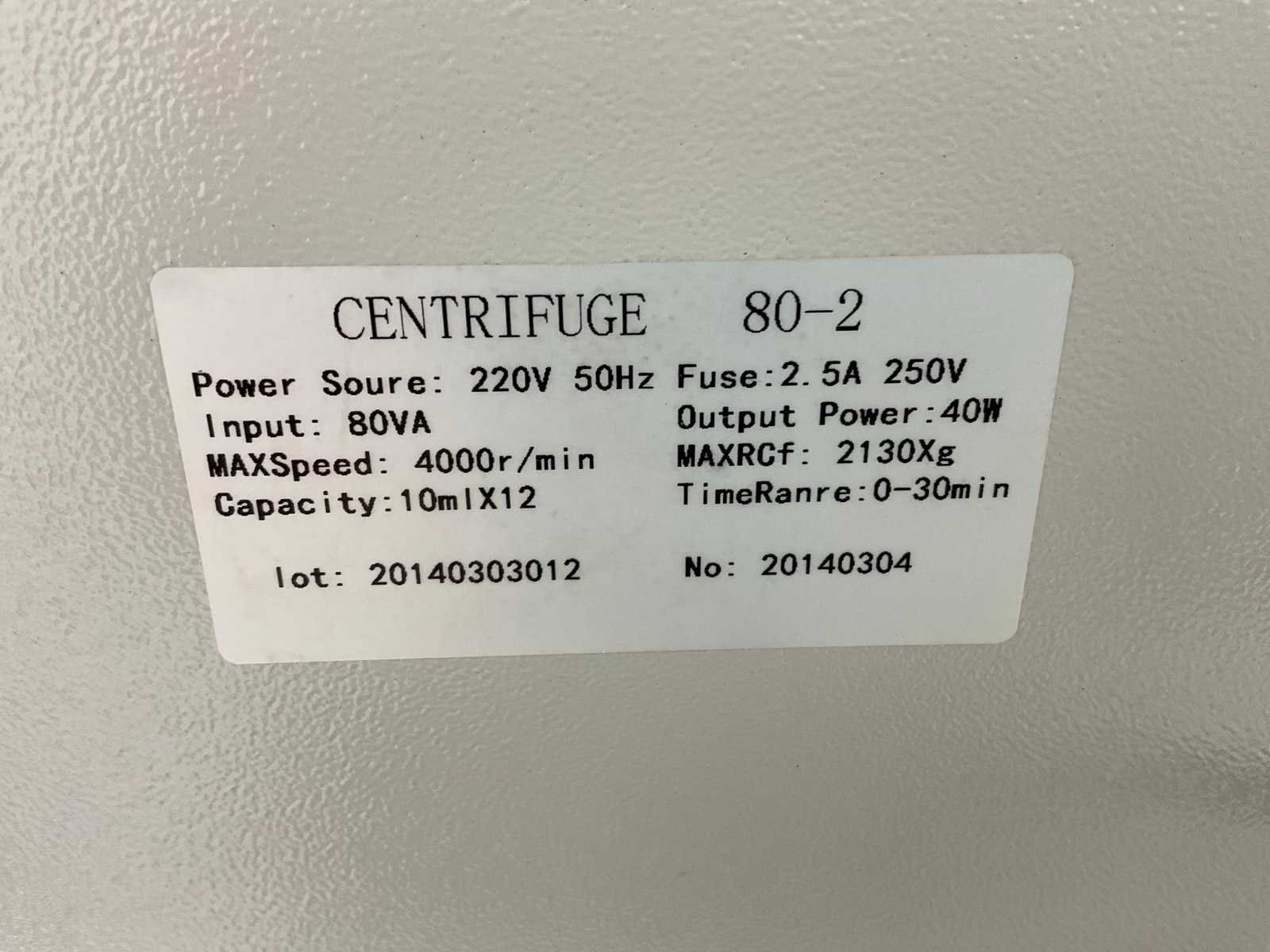 Max 4000 r/min Capaciteit 12x 10 ml Merk: Centrifuge Type: 80-2 Aansluiting: 220V Totale afmeting L: 280mm Totale afmeting Breedte: 340mm Totale afmeting Hoogte: 330mm