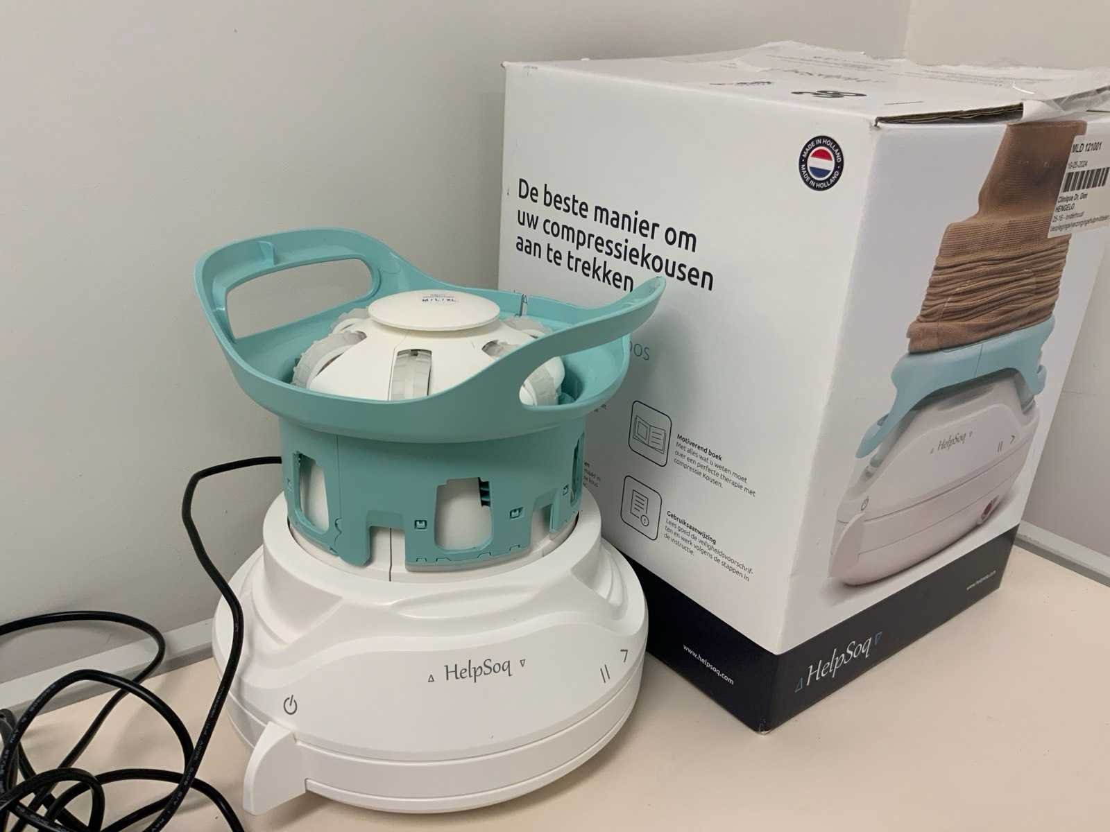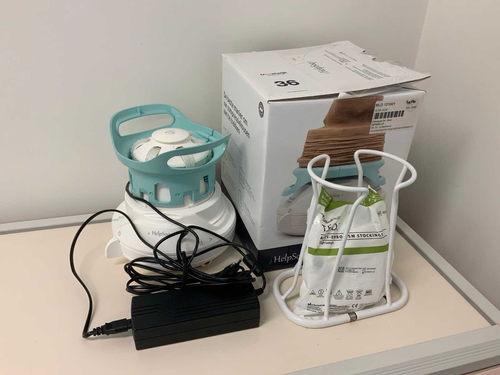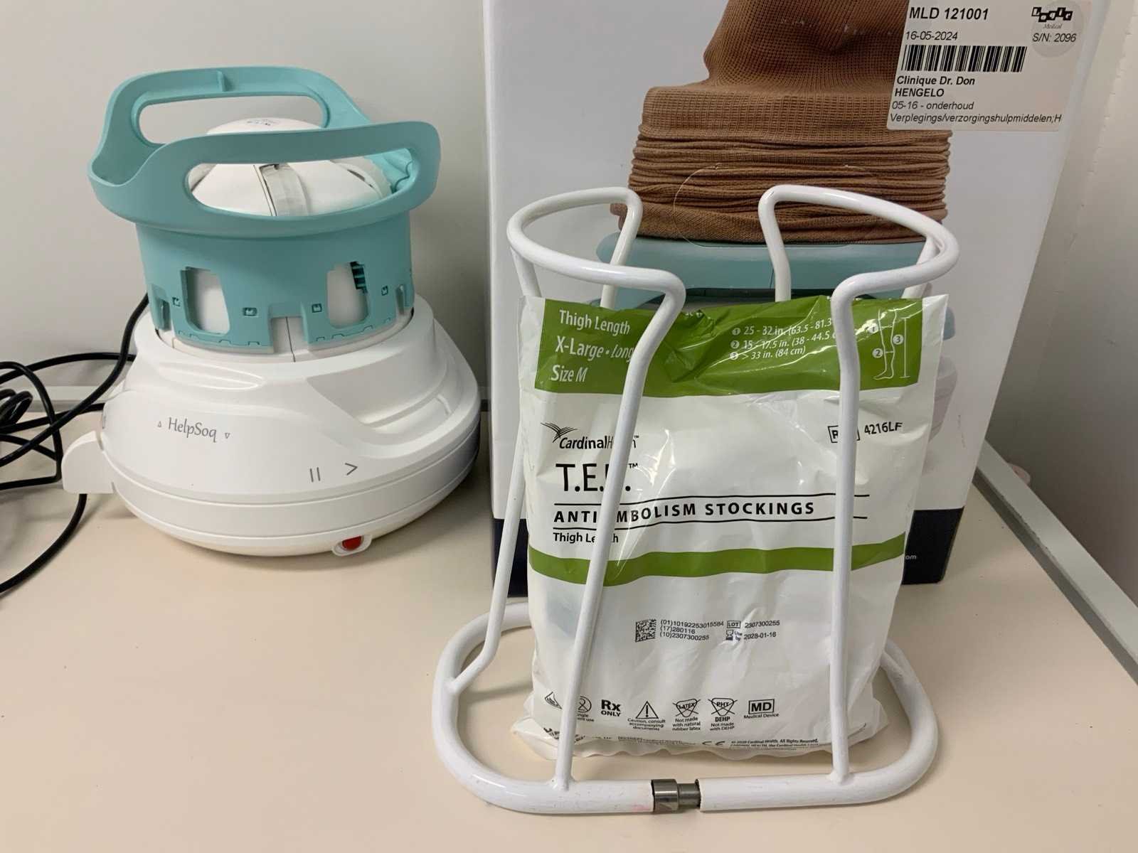 Dit kavel bevat: -een elektrische machine voor het aantrekken van compressiekousen, voorzien van voedingskabel. -rekje voor het makkelijker aandoen van compressiekousen. -T.E.D. Kousen thigh length. Merk: Helpsoq