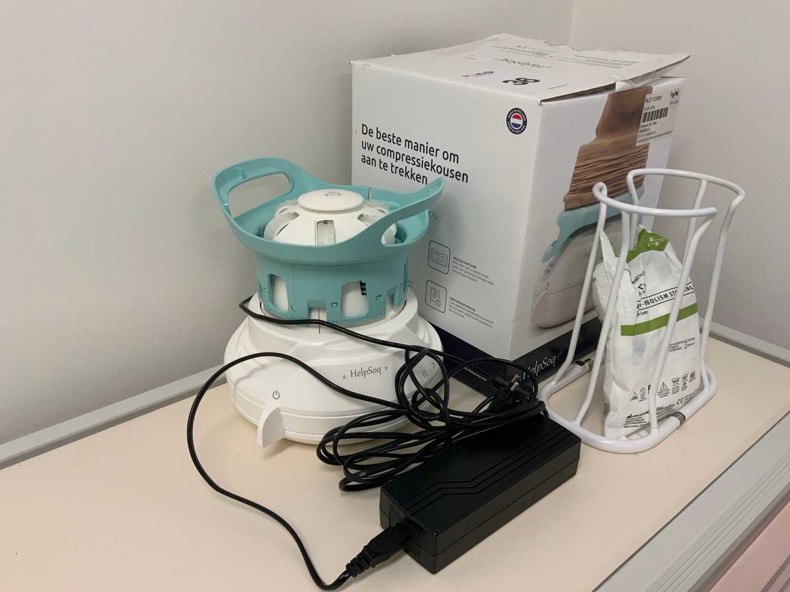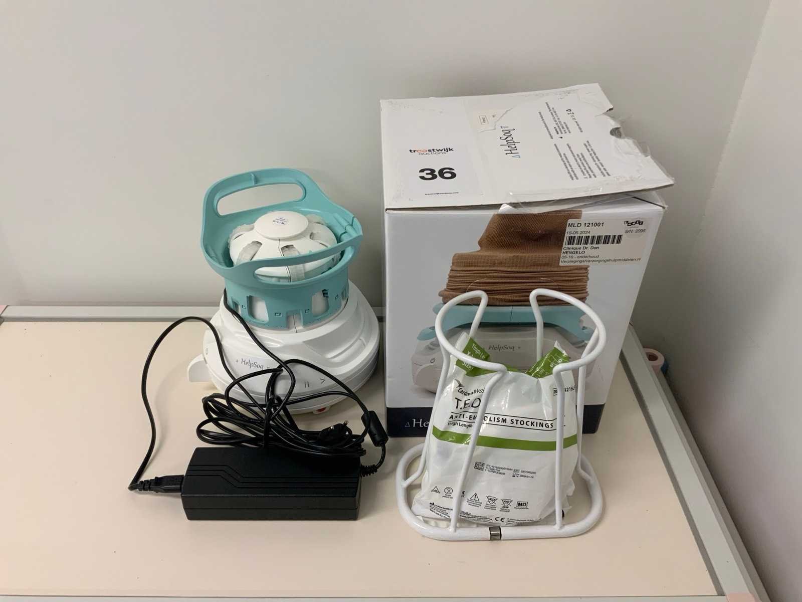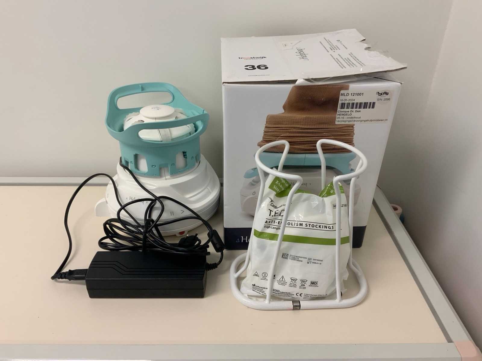 Dit kavel bevat: -een elektrische machine voor het aantrekken van compressiekousen, voorzien van voedingskabel. -rekje voor het makkelijker aandoen van compressiekousen. -T.E.D. Kousen thigh length. Merk: Helpsoq