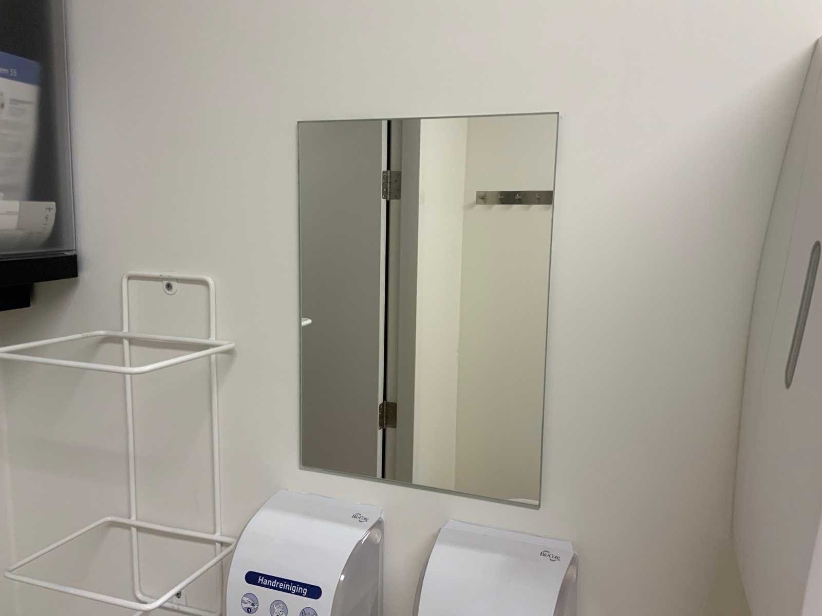 Bestaande uit: -handdoek dispenser -pompje voor handdesinfectie -pompje voor handreiniging -wandrekje -spiegel Merk: Kimberly-Clark/ Deb Kleur: Wit