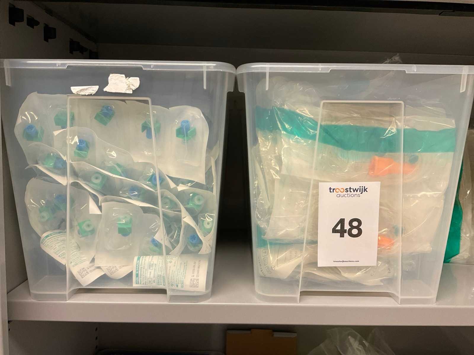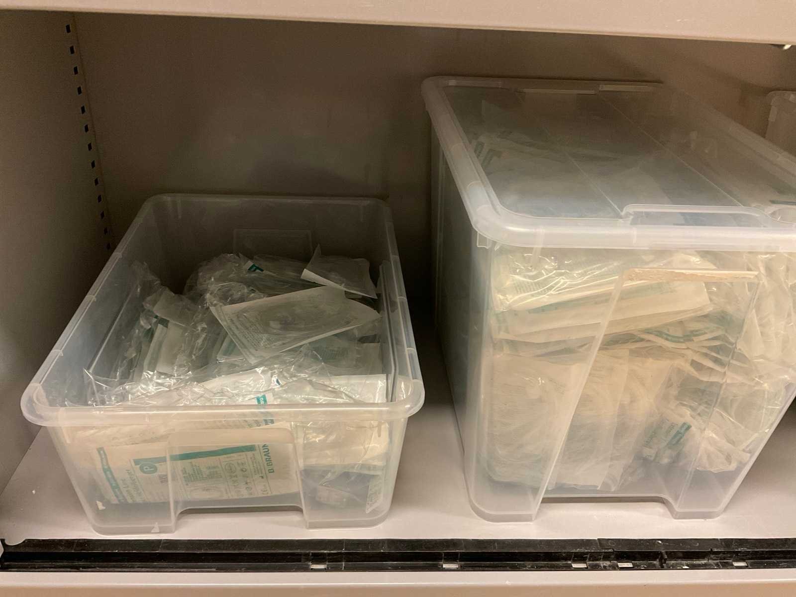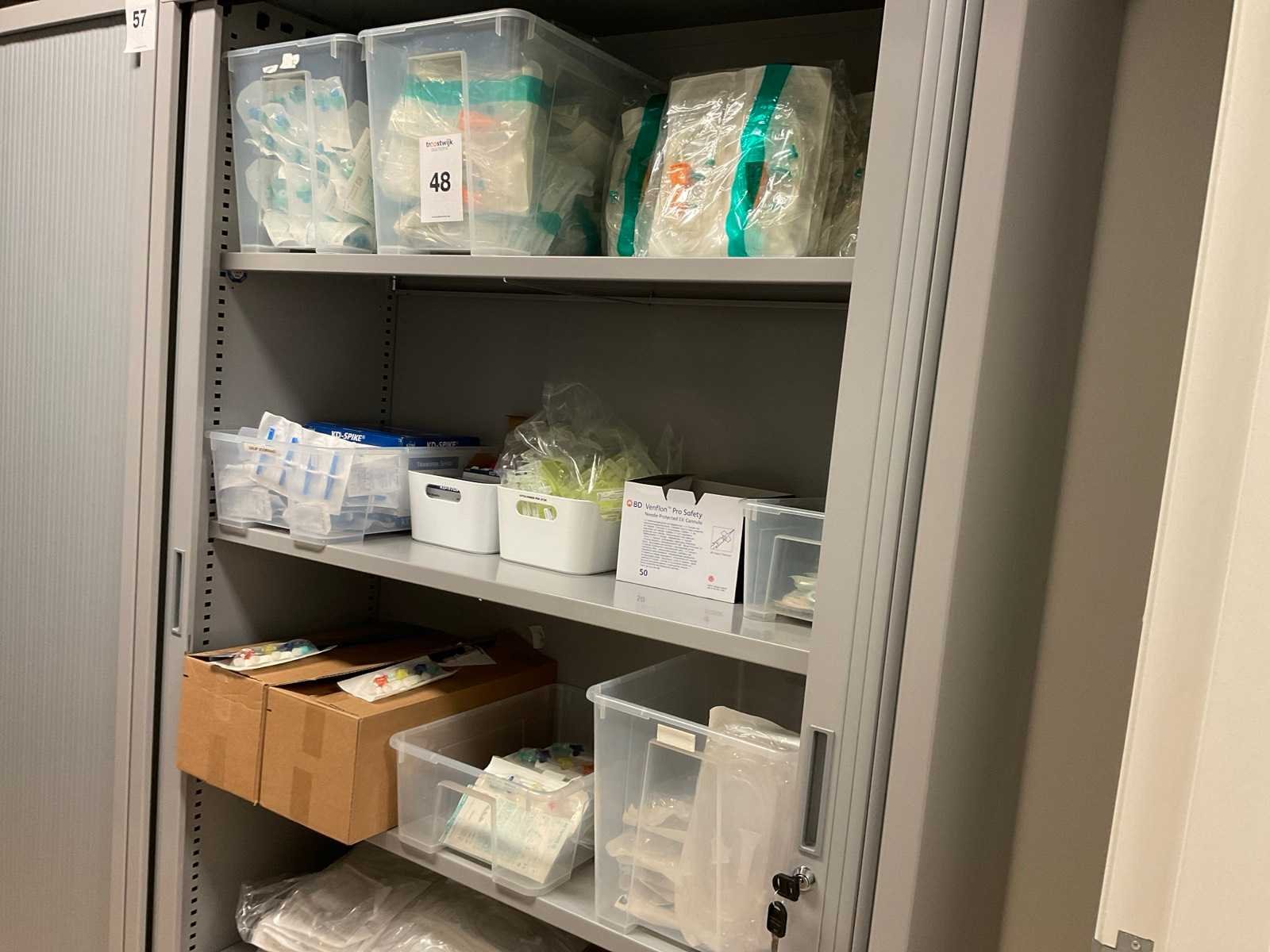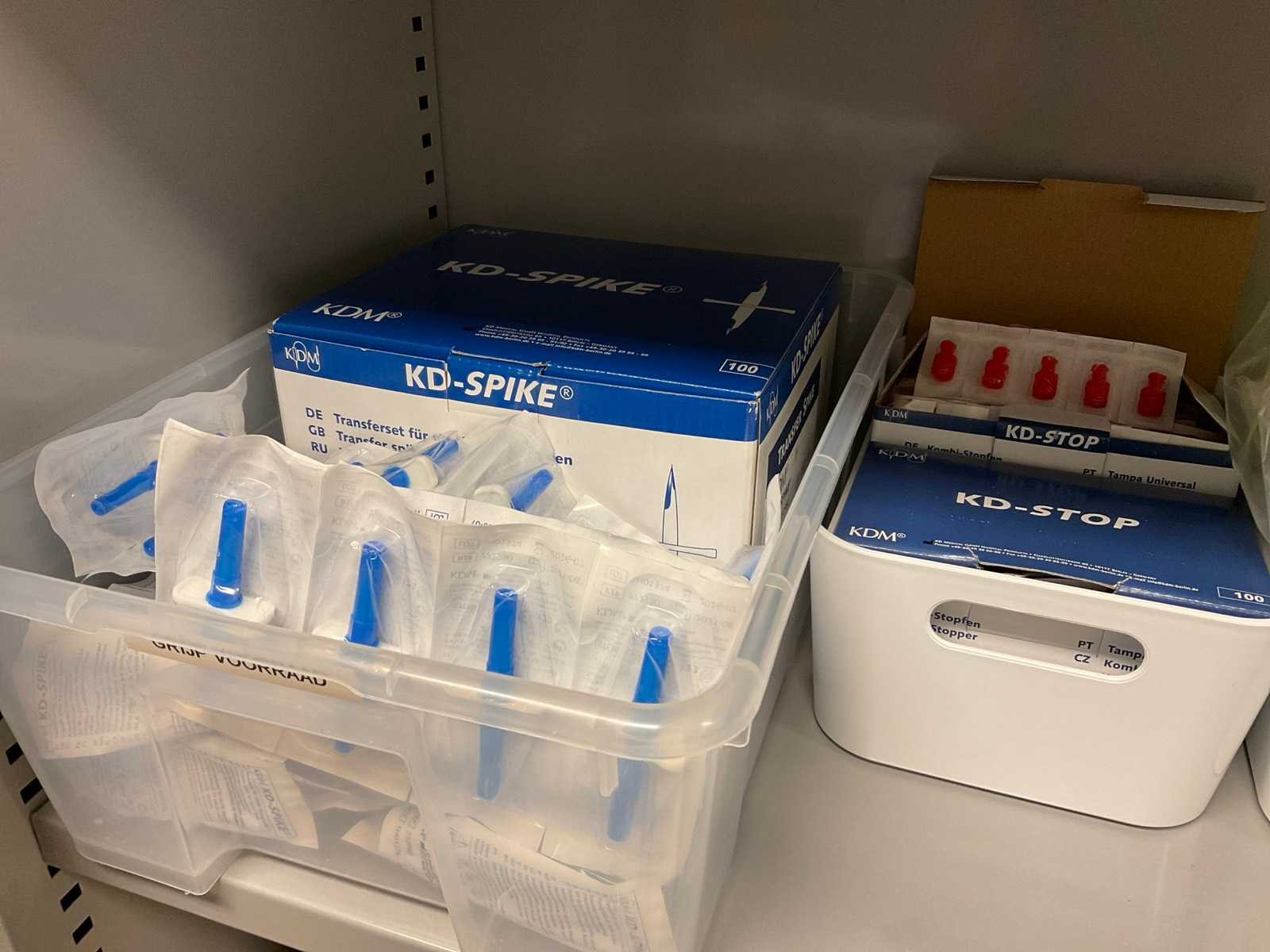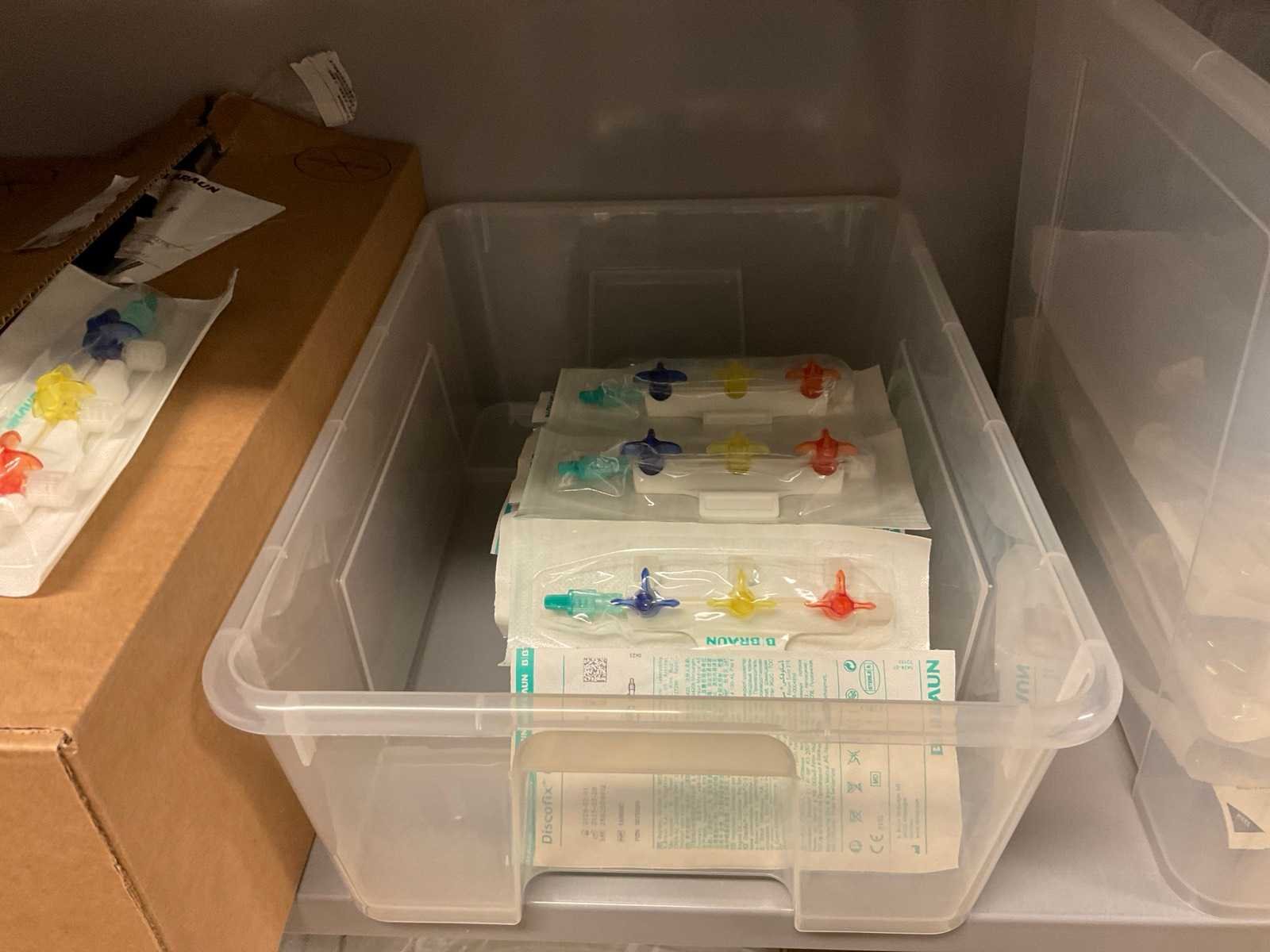 Inhoud kast bestaande uit kunststof bakken met voorraad waaronder infuuslijnen, infuus zijlijnen, driewegkraantjes, stoppen, venflons, vlindernaaldjes Archiefkast niet inbegrepen