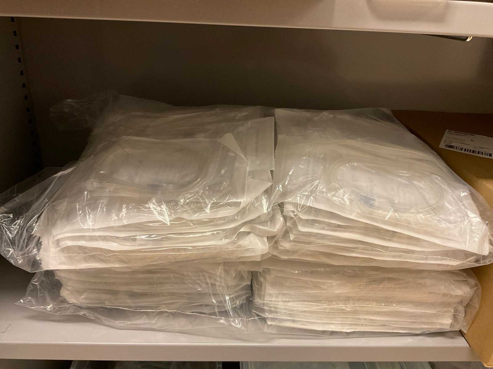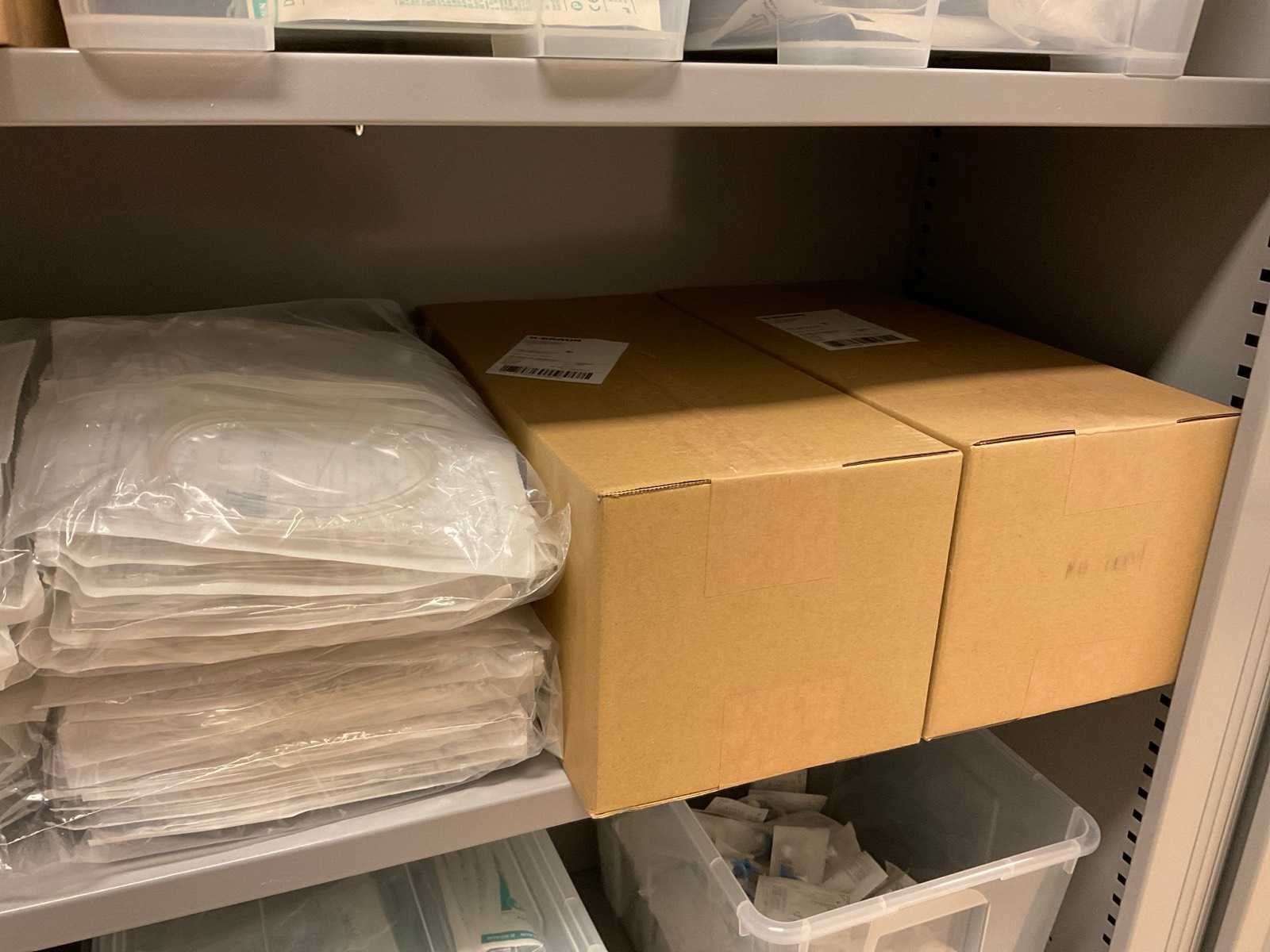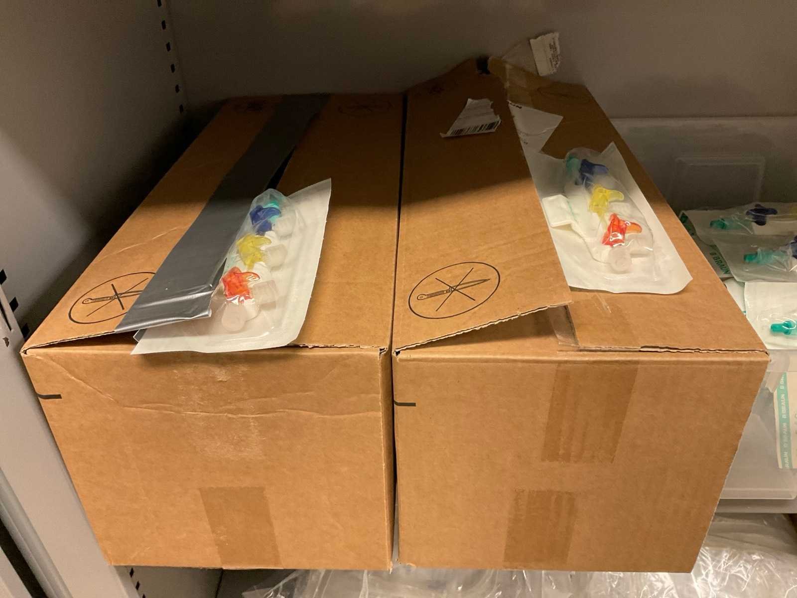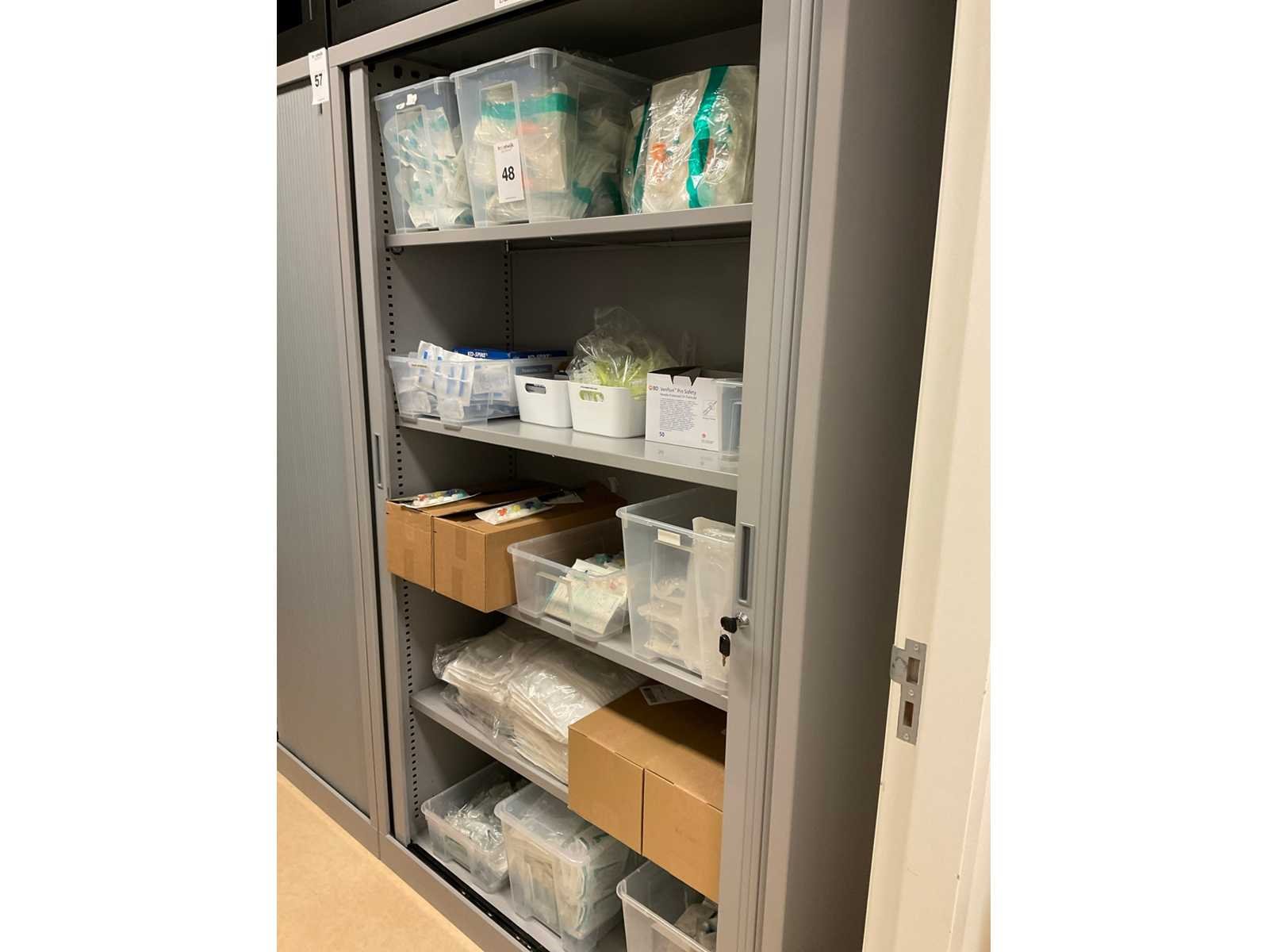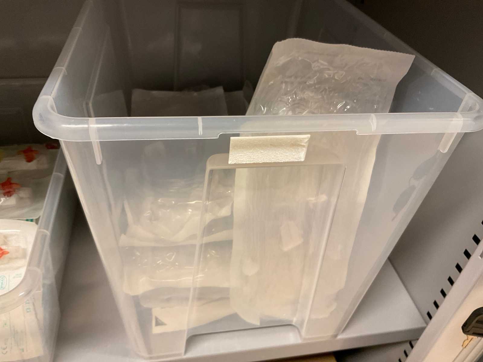 Inhoud kast bestaande uit kunststof bakken met voorraad waaronder infuuslijnen, infuus zijlijnen, driewegkraantjes, stoppen, venflons, vlindernaaldjes Archiefkast niet inbegrepen