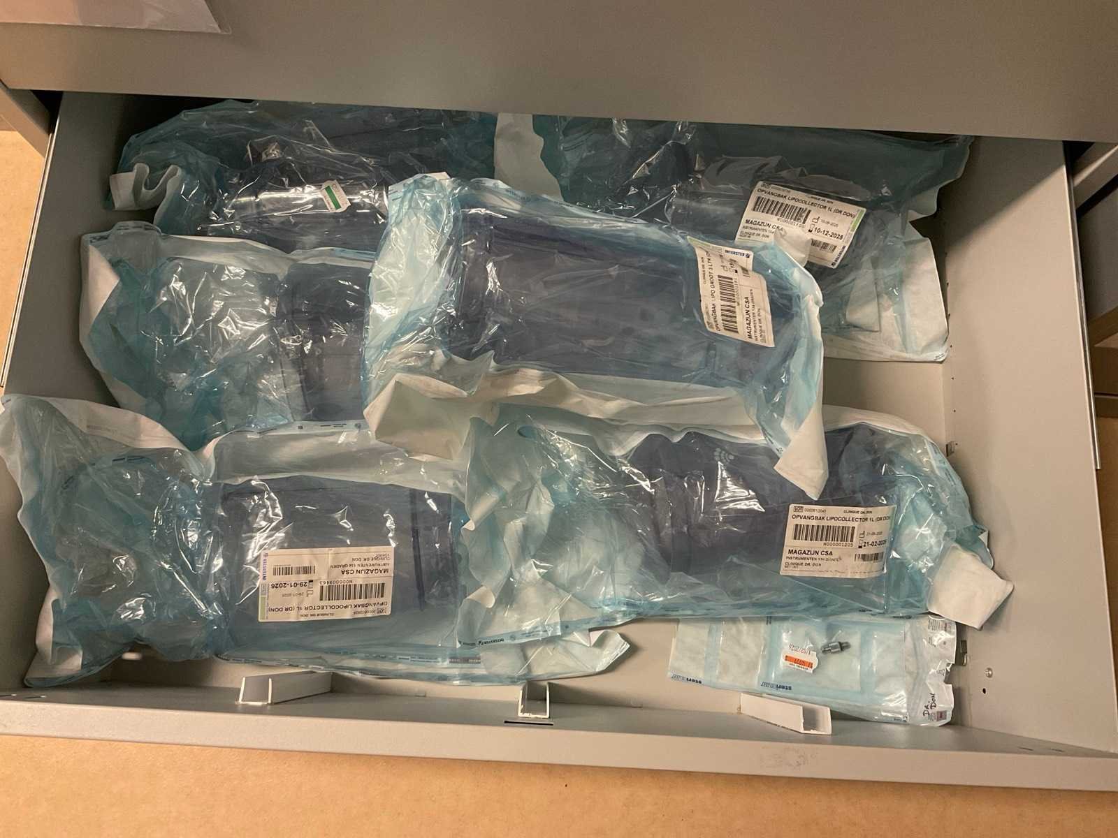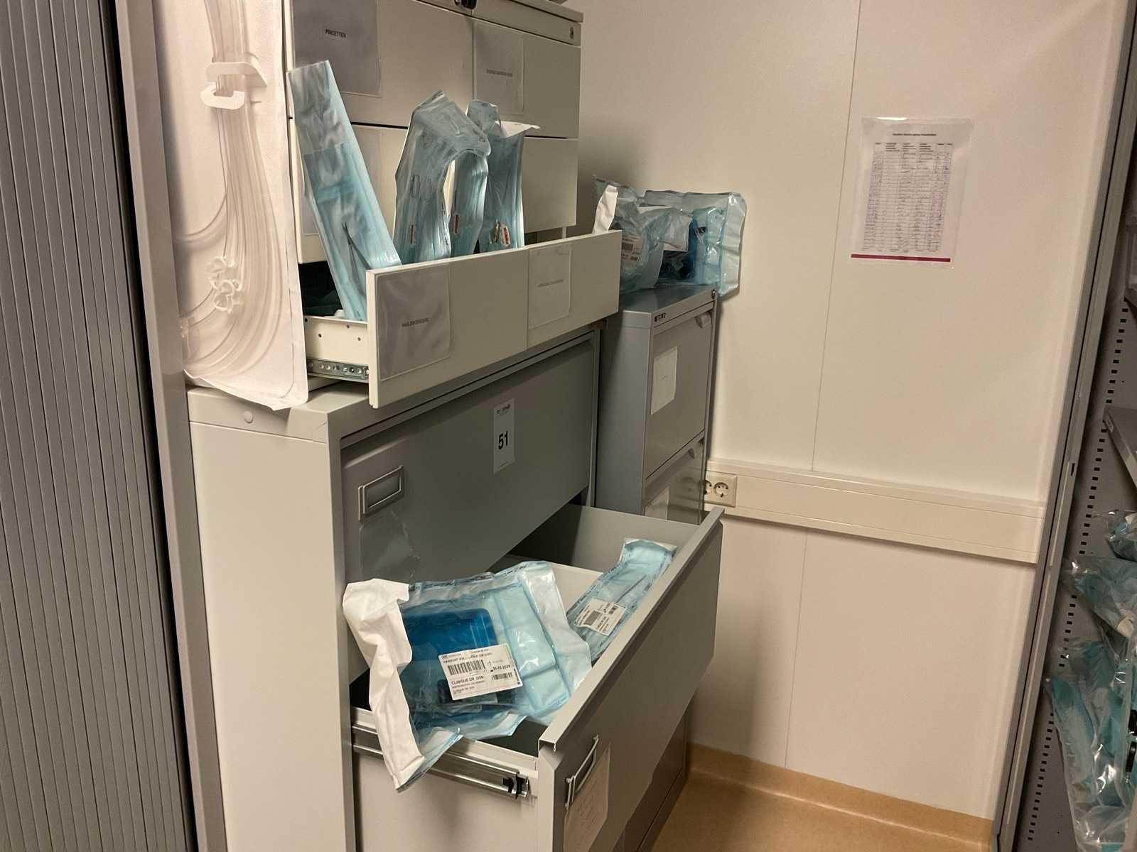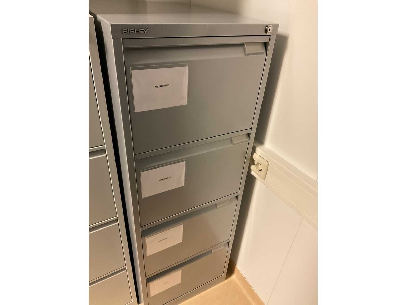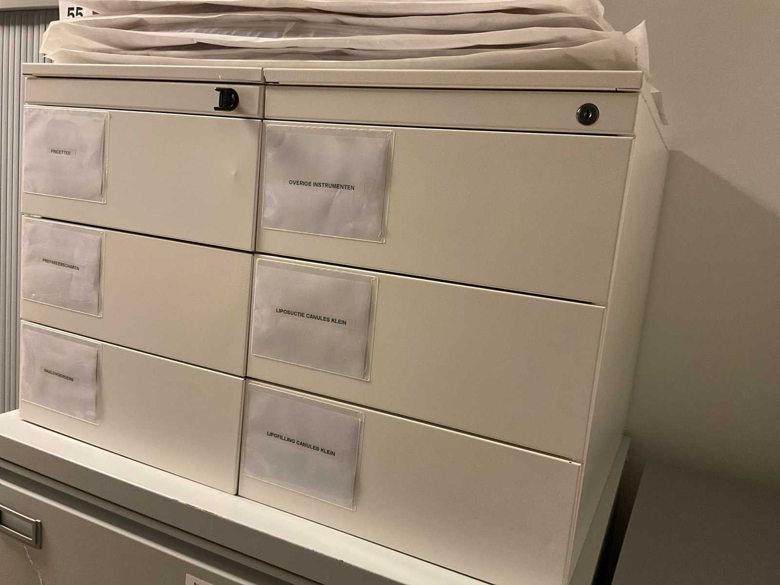 Bestaande uit Bisley archief kast met inhoud waaronder bipolaire pincetten, nierbekken, liposuctie opvang bakken Ladenkast afm ca. 84x62x133 cm met inhoud bestaande uit diverse canules 2 ladeblokken met inhoud waaronder diverse instrumenten en liposuctie applicator
