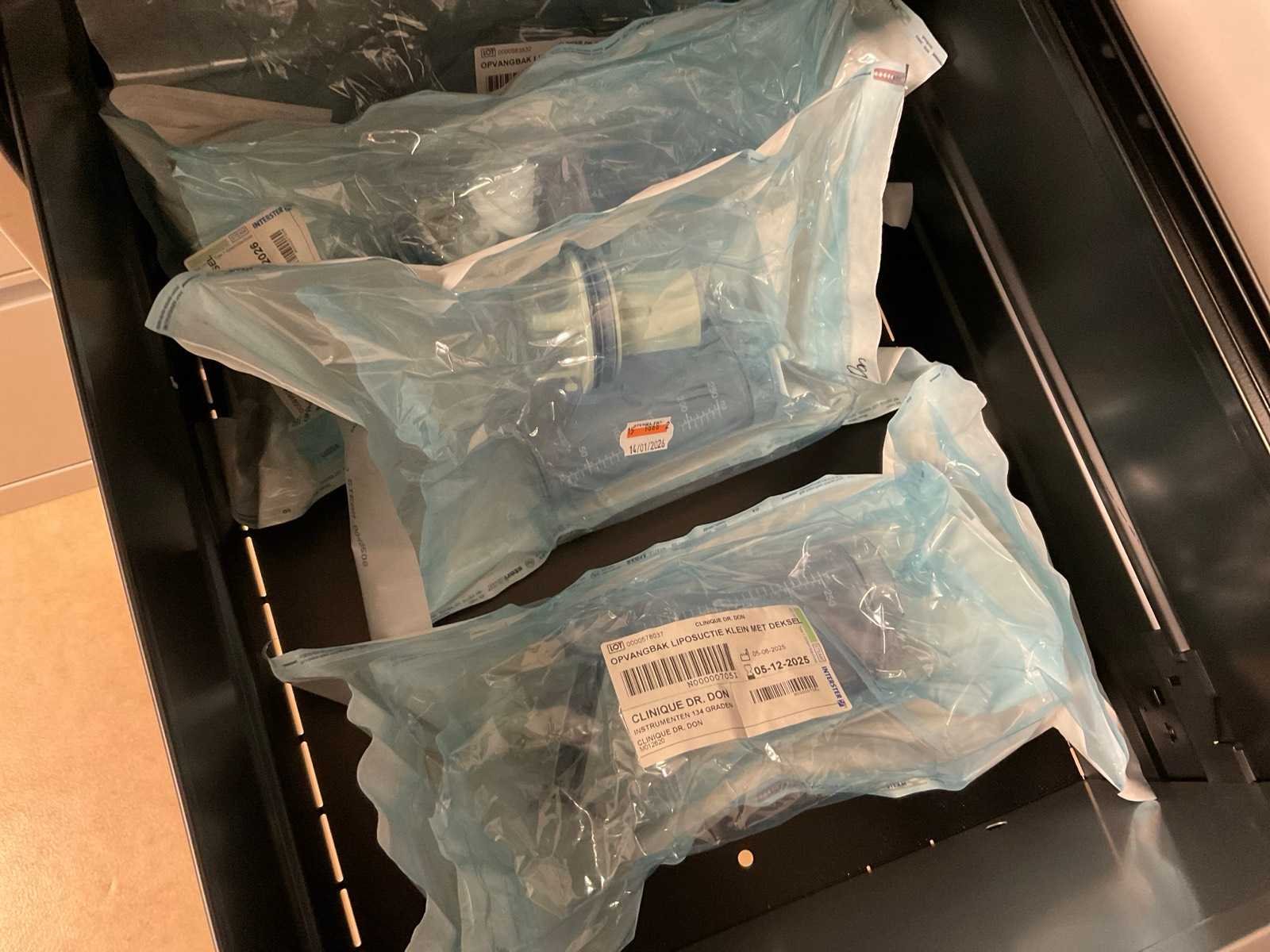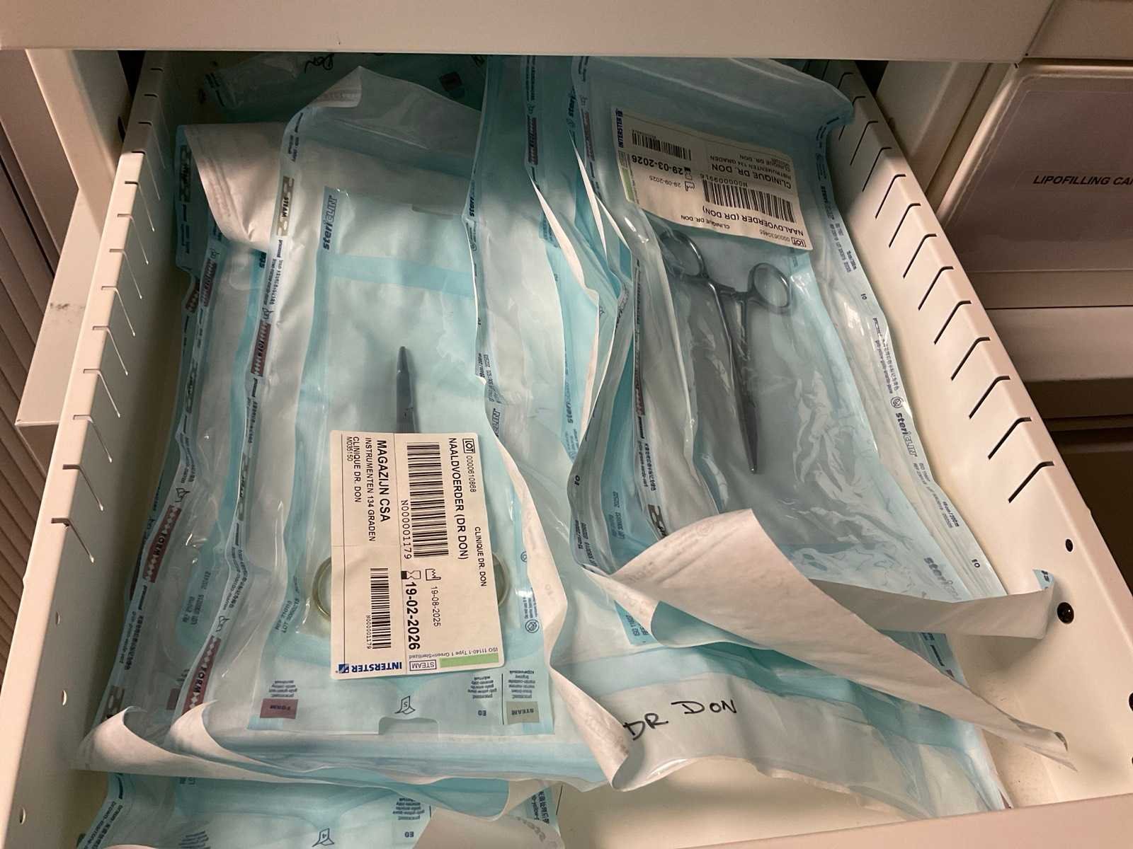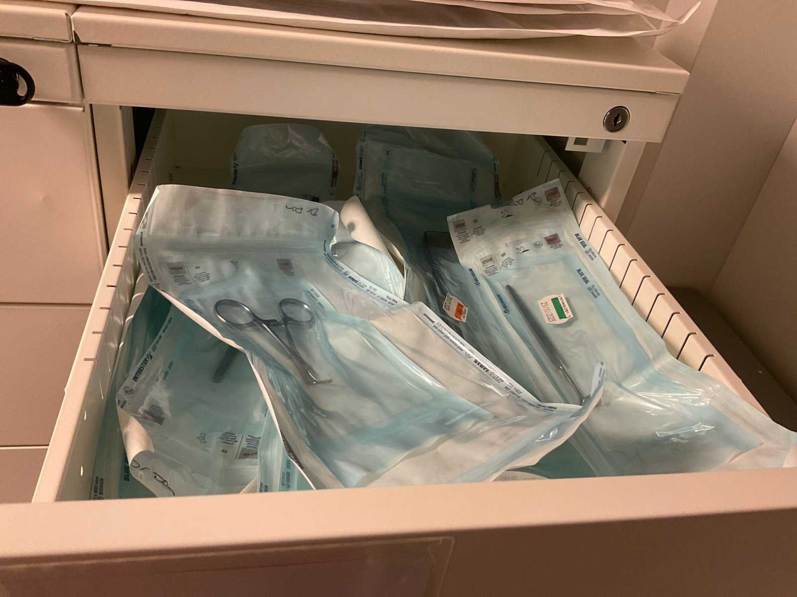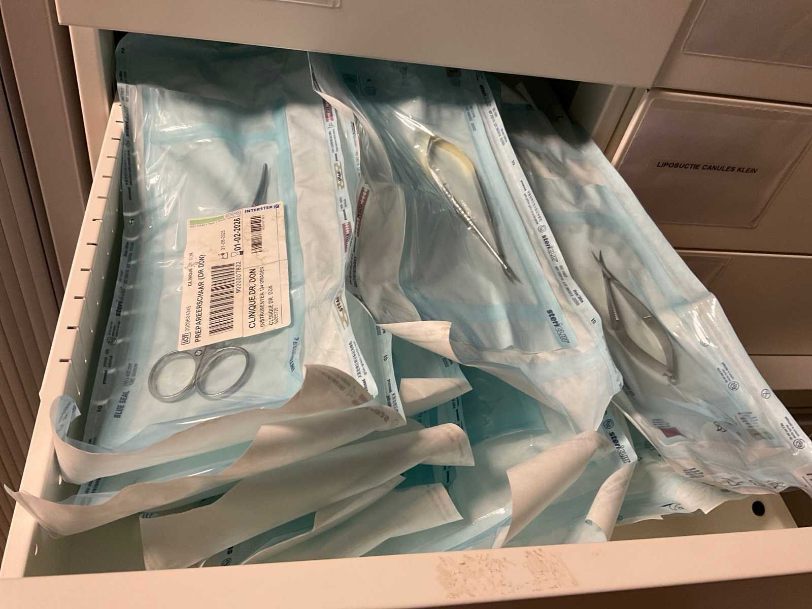 Bestaande uit Bisley archief kast met inhoud waaronder bipolaire pincetten, nierbekken, liposuctie opvang bakken Ladenkast afm ca. 84x62x133 cm met inhoud bestaande uit diverse canules 2 ladeblokken met inhoud waaronder diverse instrumenten en liposuctie applicator