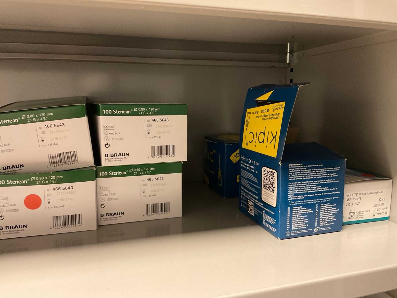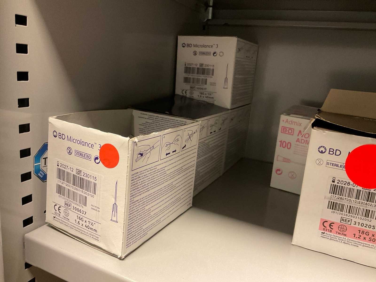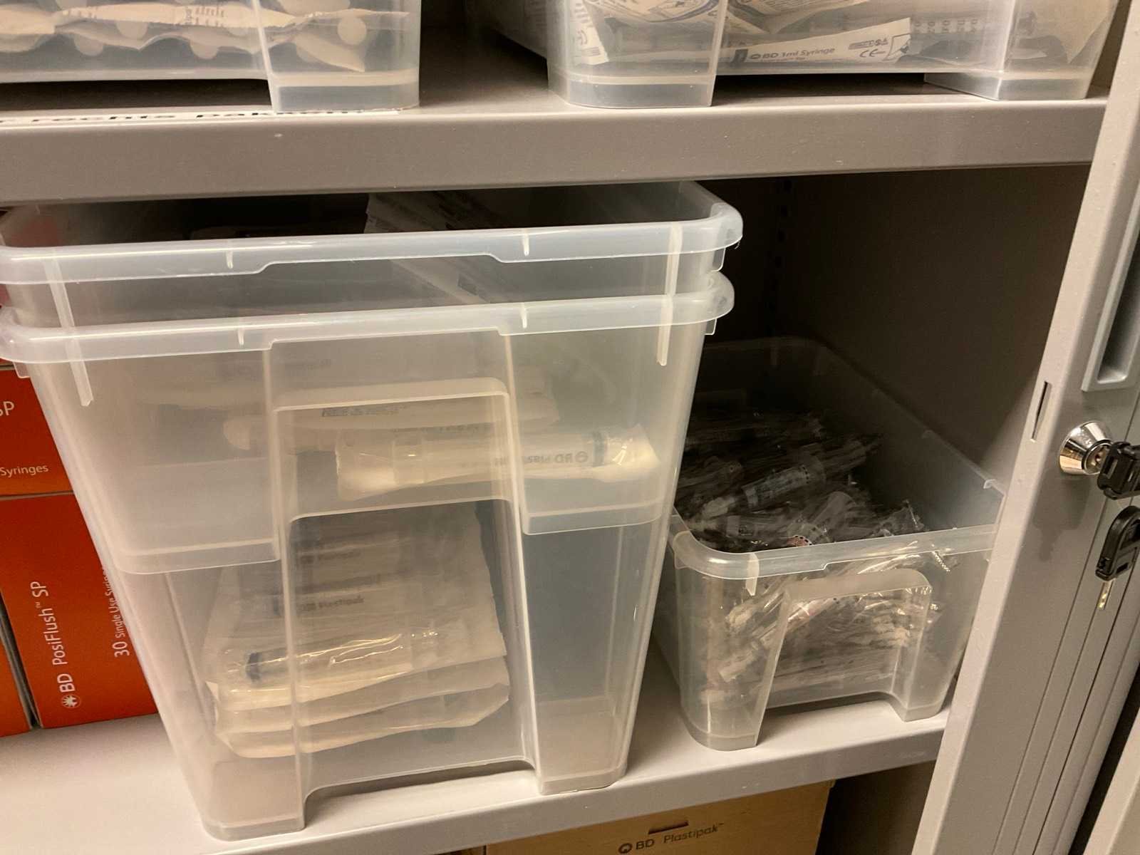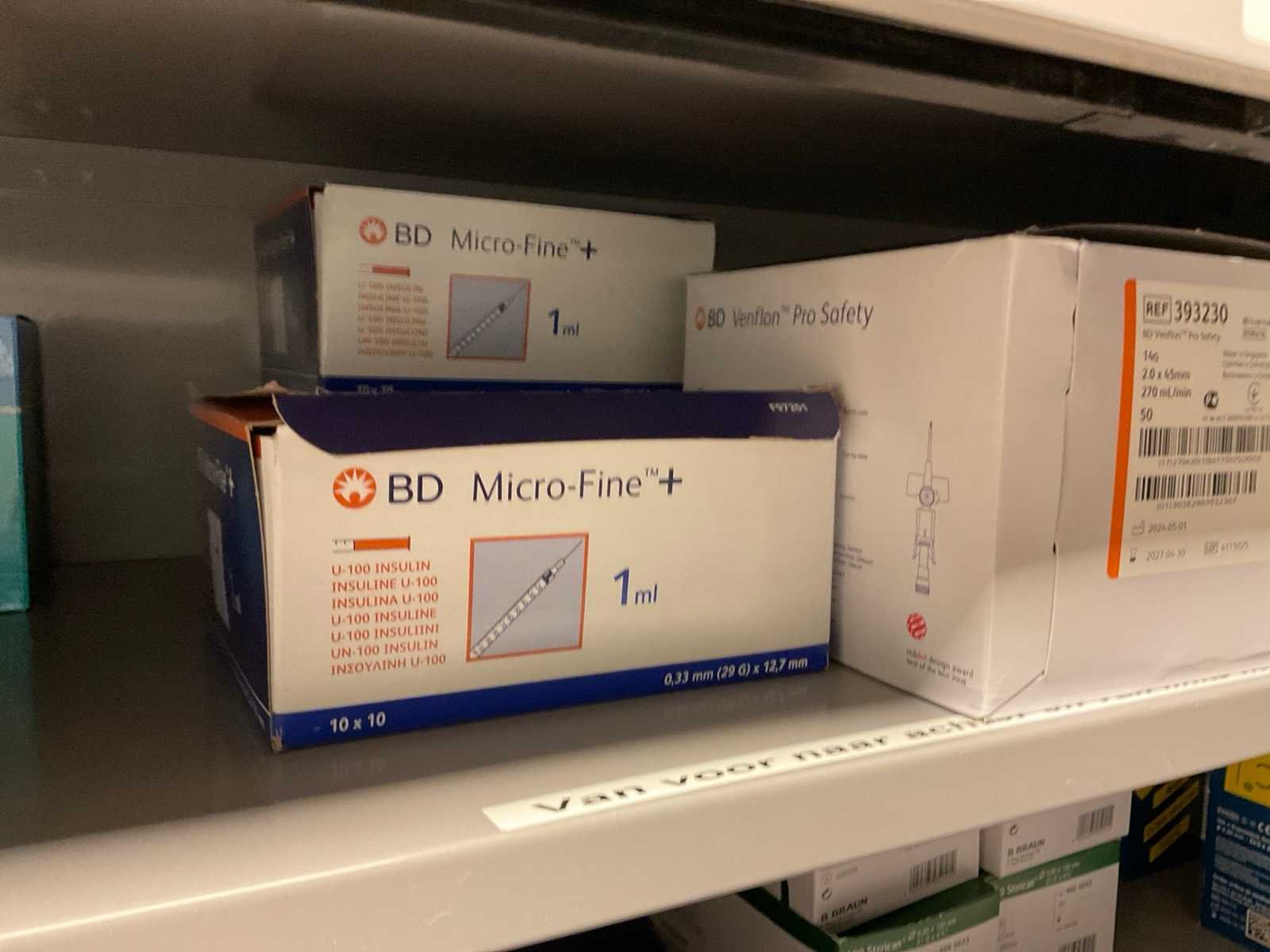 Inhoud kast bestaande uit diverse formaten spuiten, 10 ml, 20 ml, spoel vloeistof Nacl 0,9, diverse formaten injectie naalden Archiefkast niet inbegrepen Merk: BD