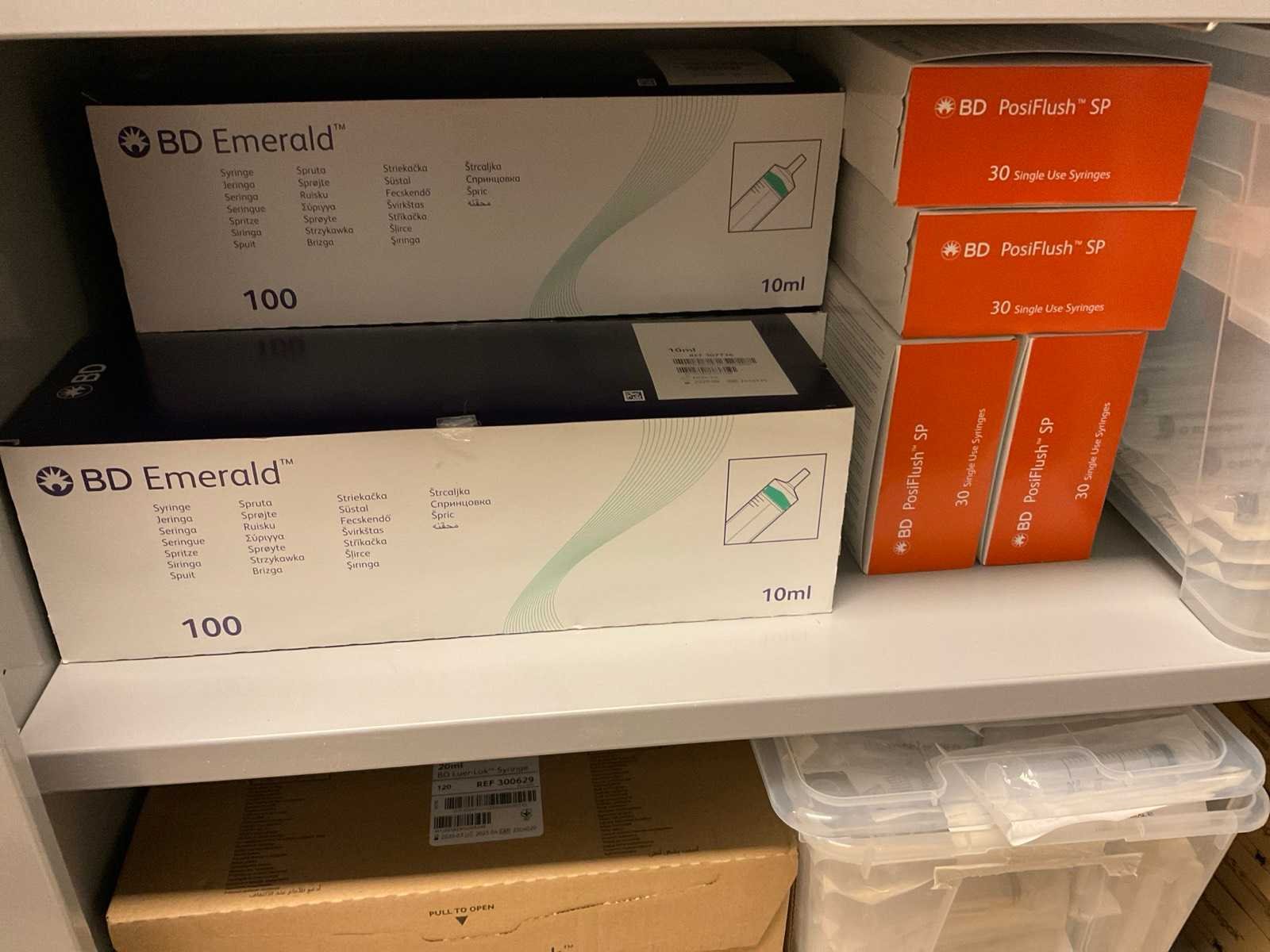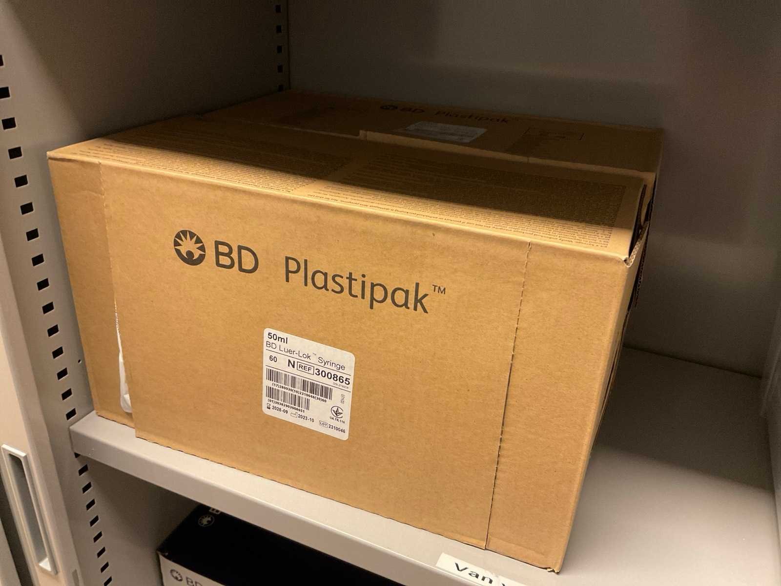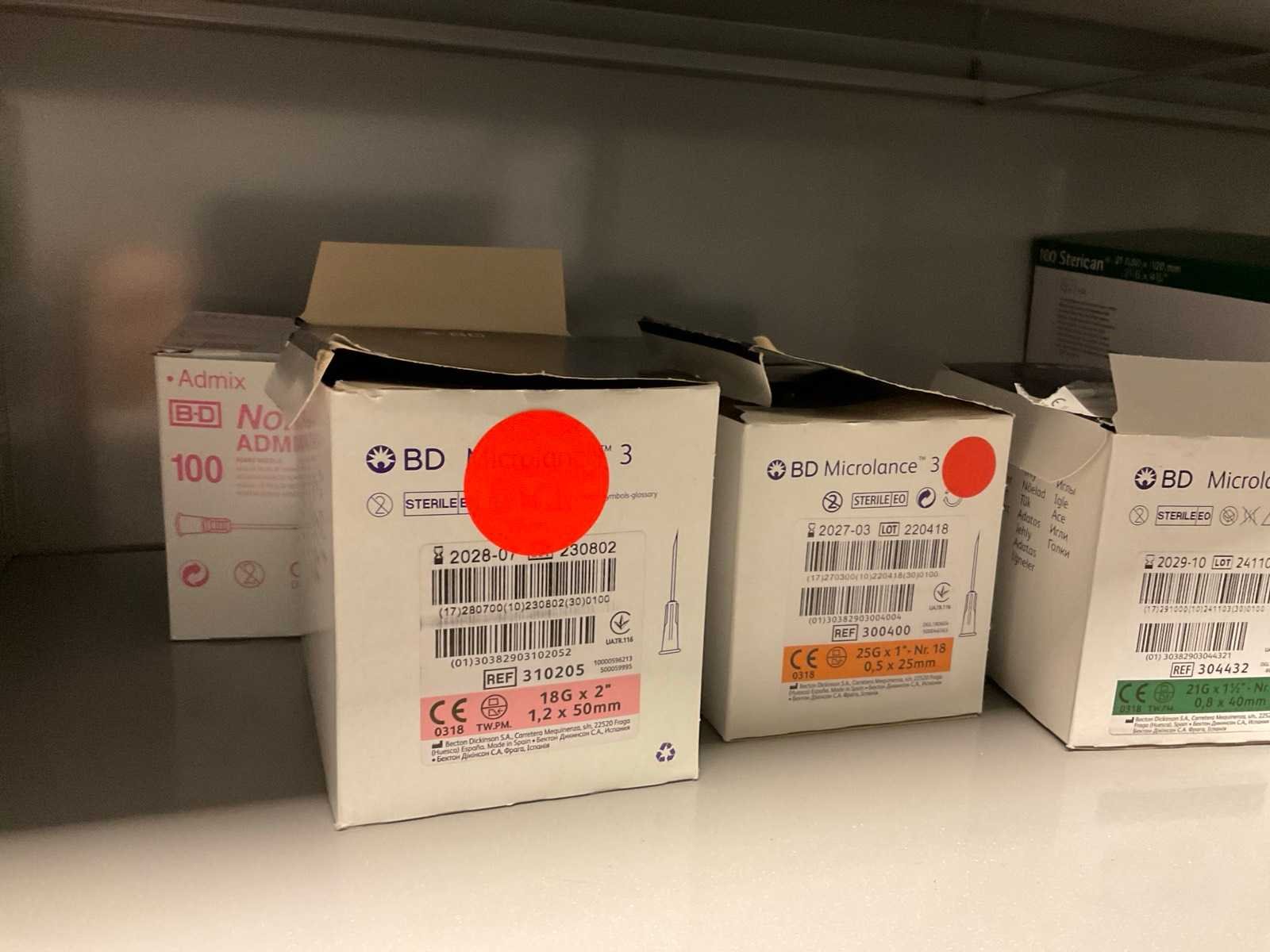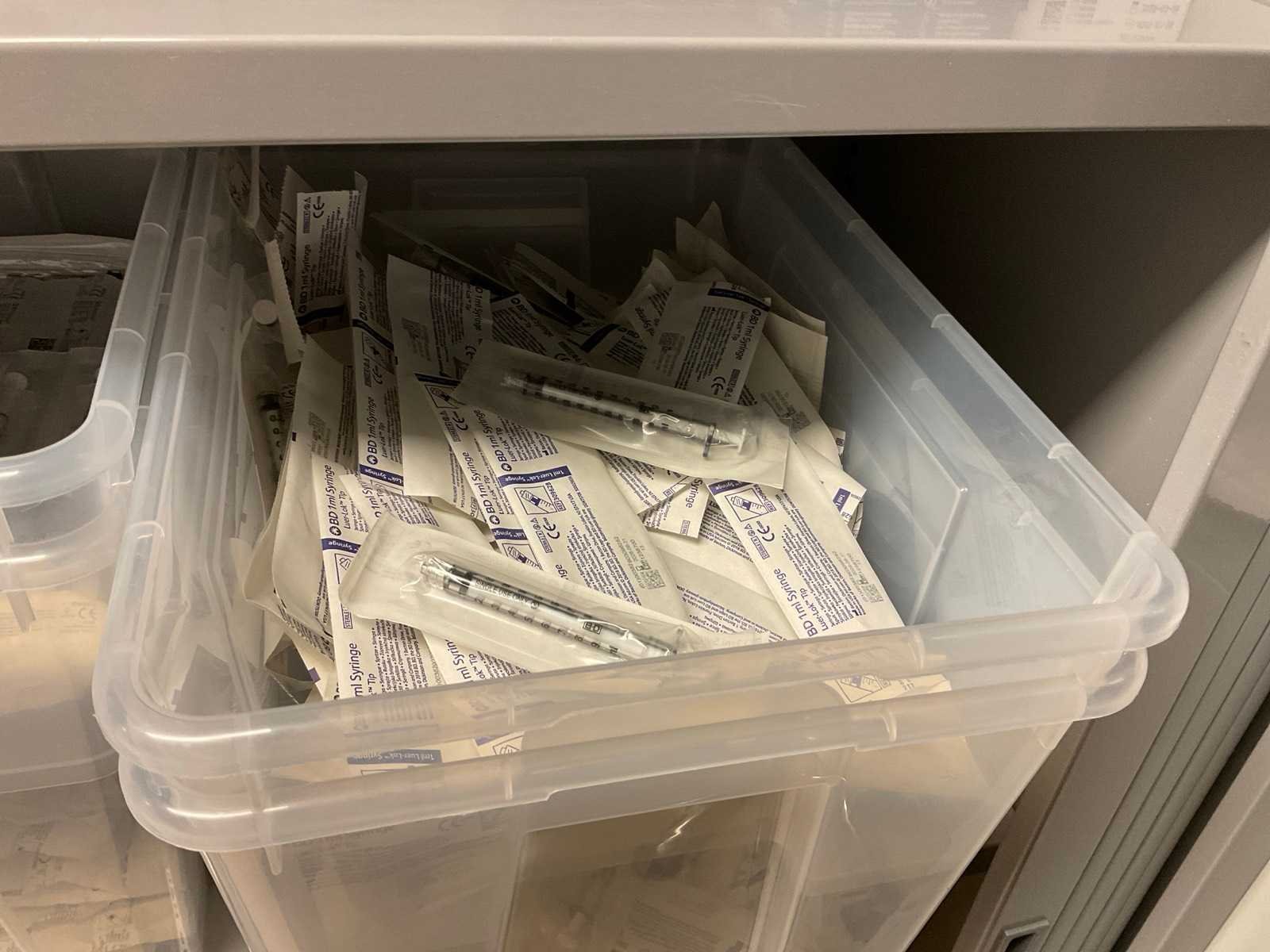 Inhoud kast bestaande uit diverse formaten spuiten, 10 ml, 20 ml, spoel vloeistof Nacl 0,9, diverse formaten injectie naalden Archiefkast niet inbegrepen Merk: BD