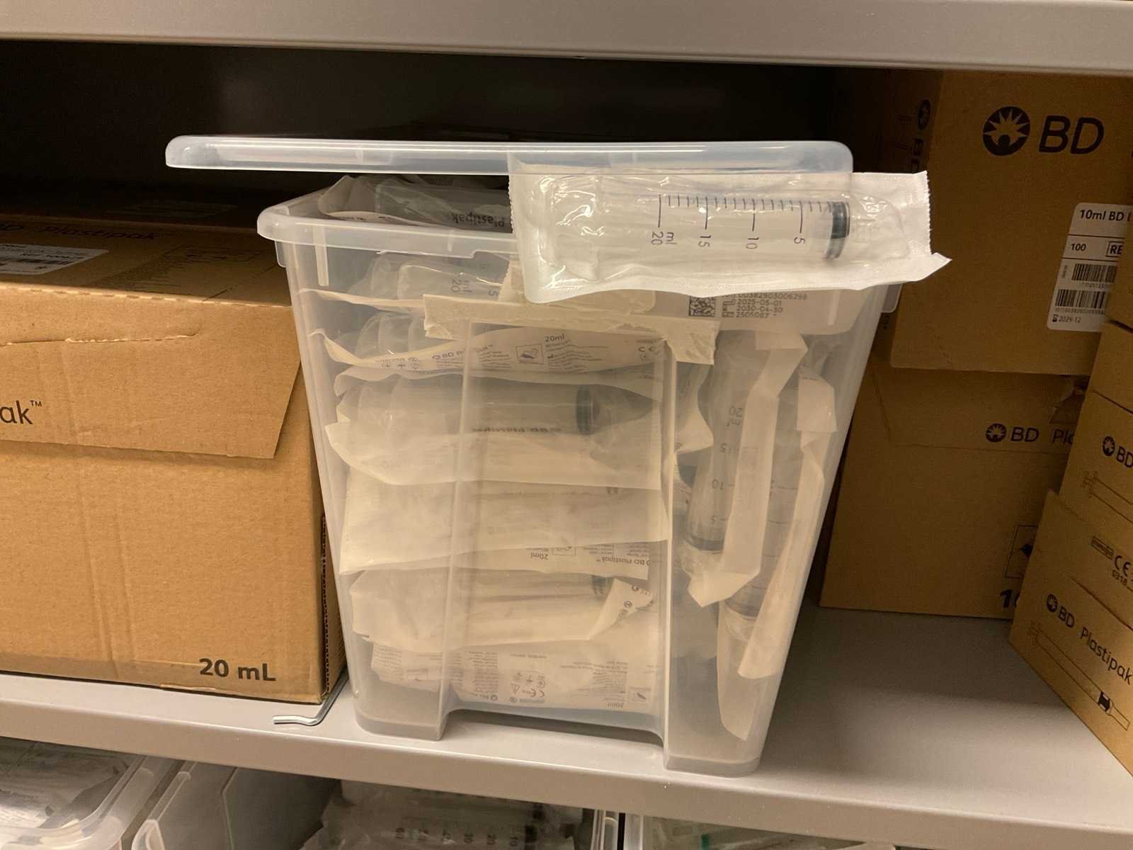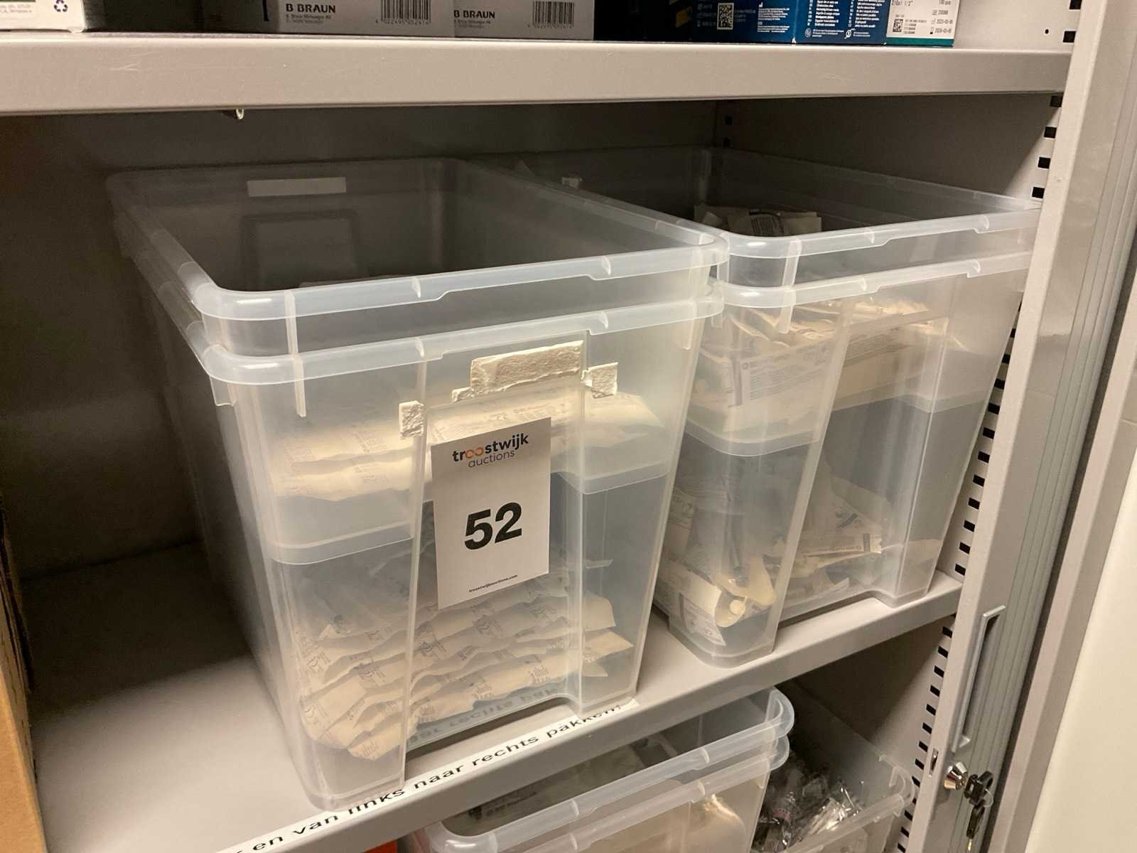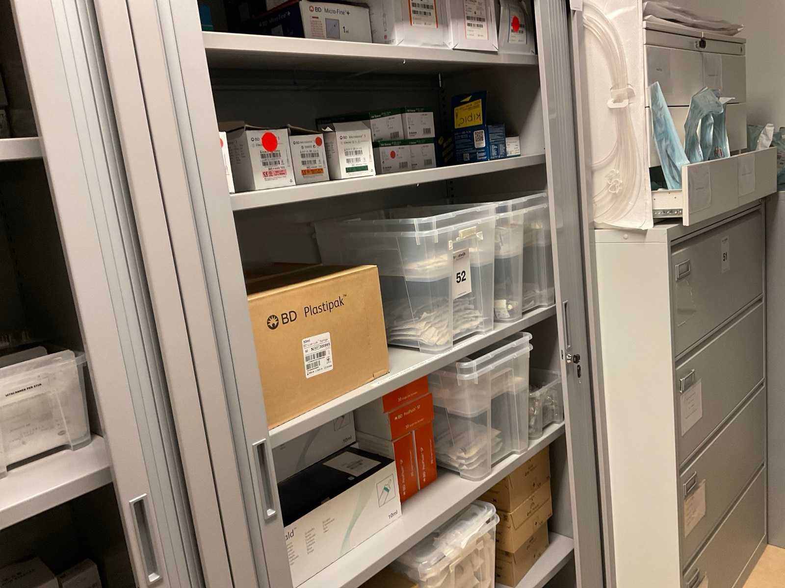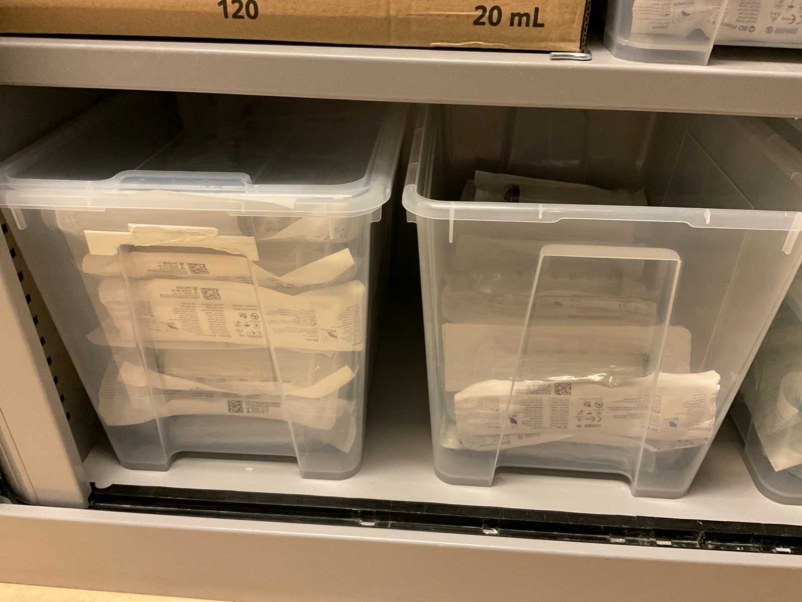 Inhoud kast bestaande uit diverse formaten spuiten, 10 ml, 20 ml, spoel vloeistof Nacl 0,9, diverse formaten injectie naalden Archiefkast niet inbegrepen Merk: BD