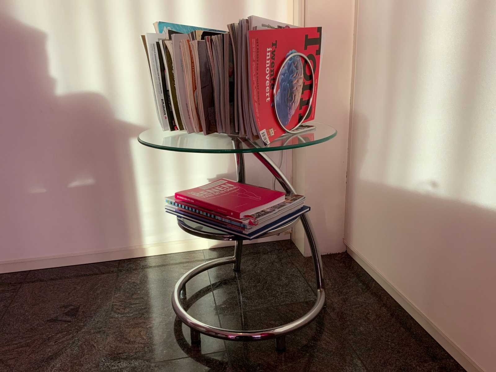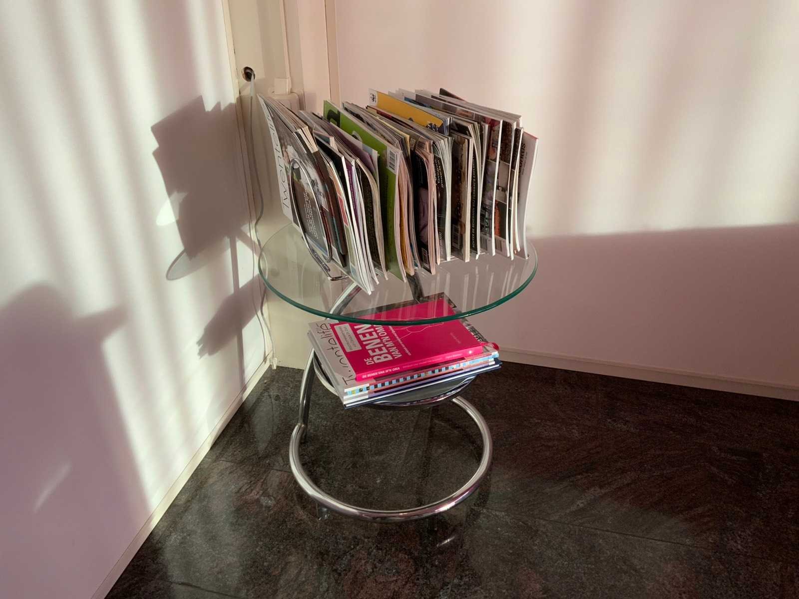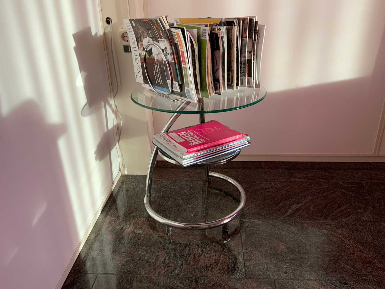 Voorzien van 2 glazenborden en folder rek. Diameter bijzettafel: 50 cm Hoogte: 54cm Materiaal: Aluminium/ glas