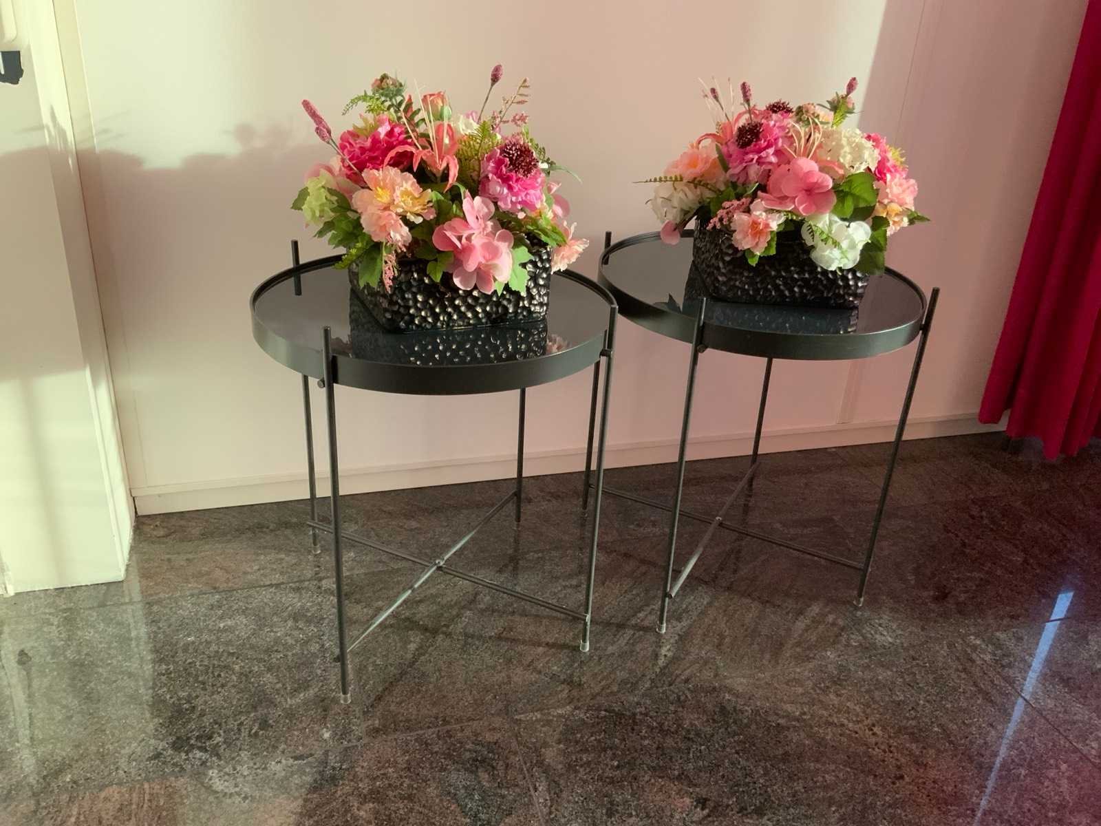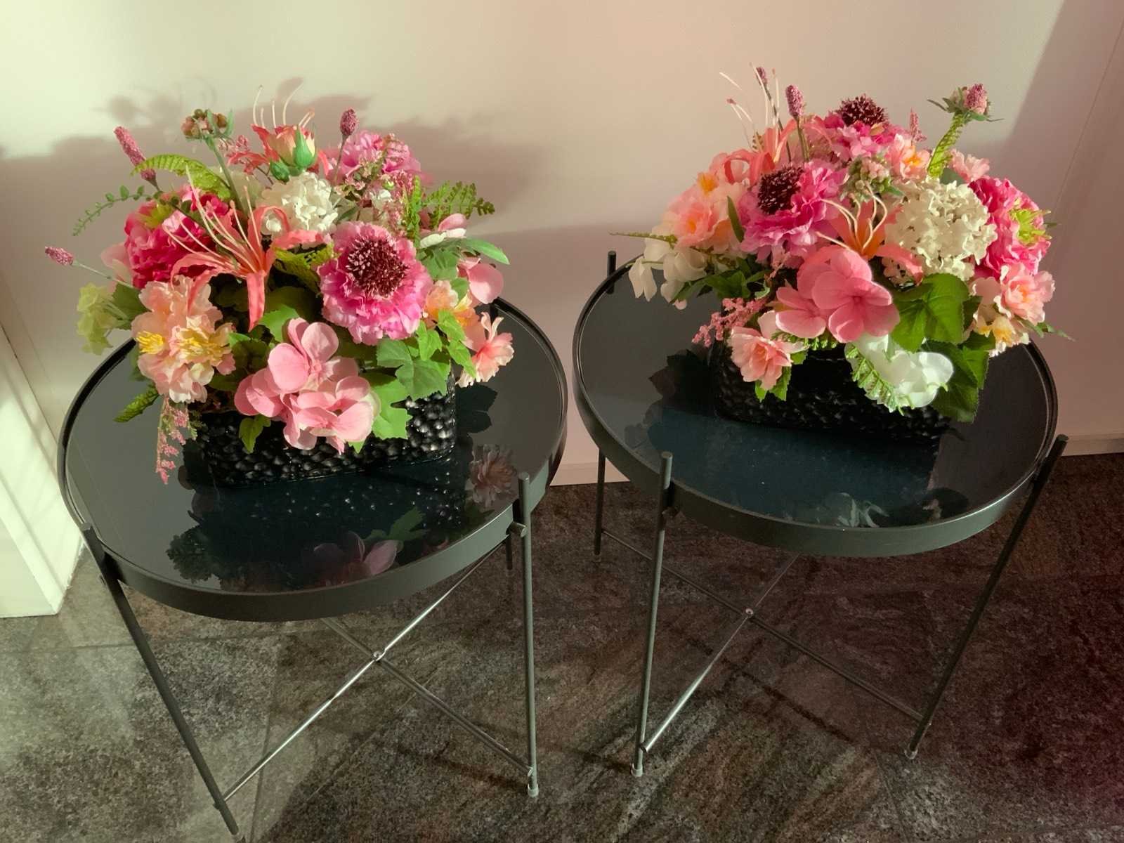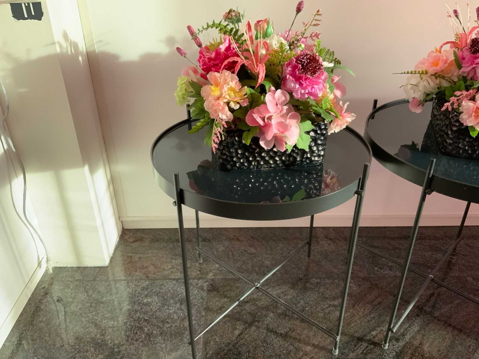 Voorzien van vierpotig onderstel en glazen tafelblad. Diameter bijzettafel: 41 cm. De kunst bloemstukken zijn inbegrepen. Kleur: Zwart Hoogte: 45cm Materiaal: Aluminium/ glas