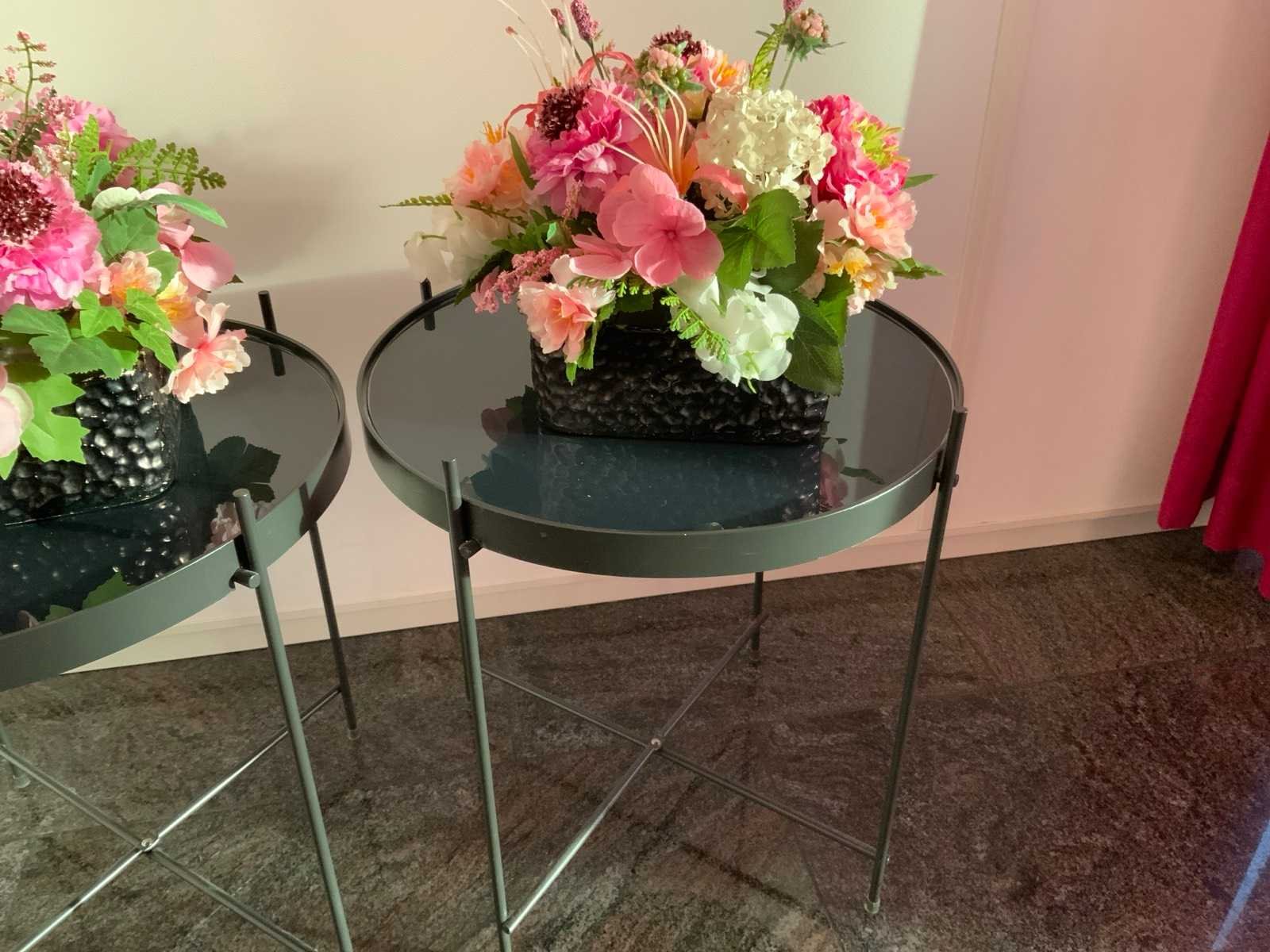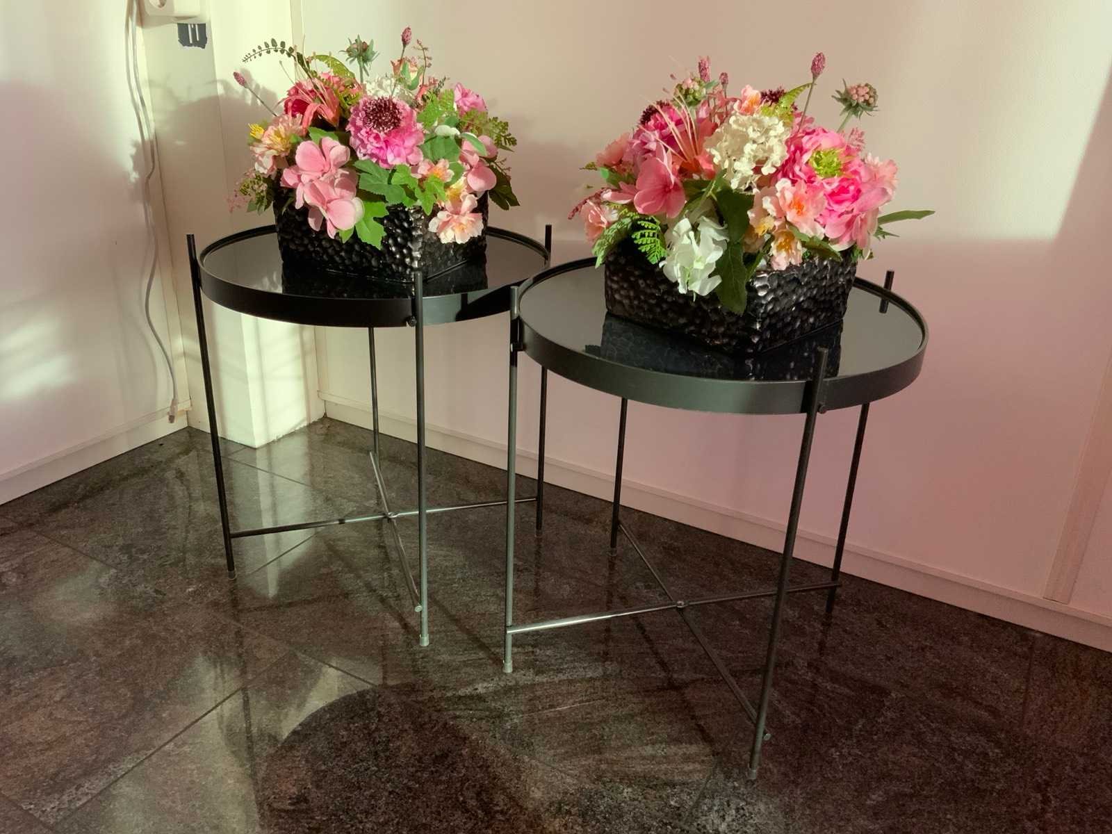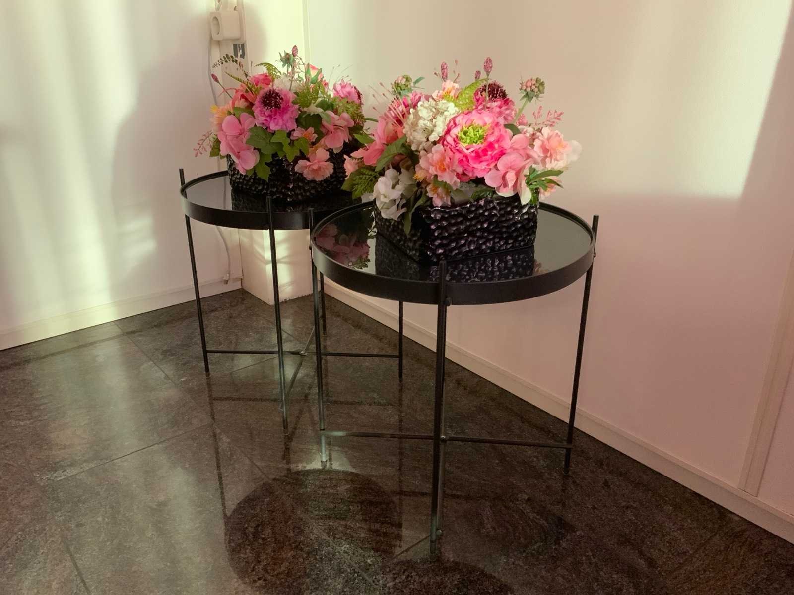 Voorzien van vierpotig onderstel en glazen tafelblad. Diameter bijzettafel: 41 cm. De kunst bloemstukken zijn inbegrepen. Kleur: Zwart Hoogte: 45cm Materiaal: Aluminium/ glas