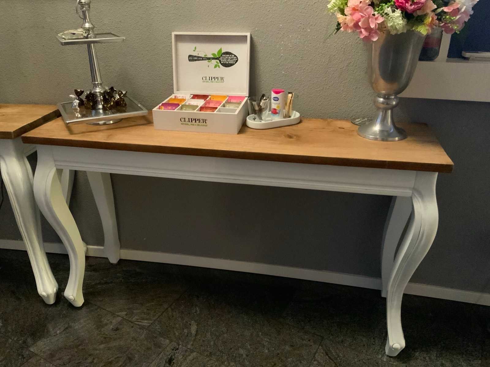 Voorzien van vierpotig onderstel. Dit kavel betreft de sidetables. De artikelen op de sidetables zijn niet inbegrepen. Kleur: Wit Lengte: 140cm Breedte: 40cm Hoogte: 80cm Materiaal: Hout